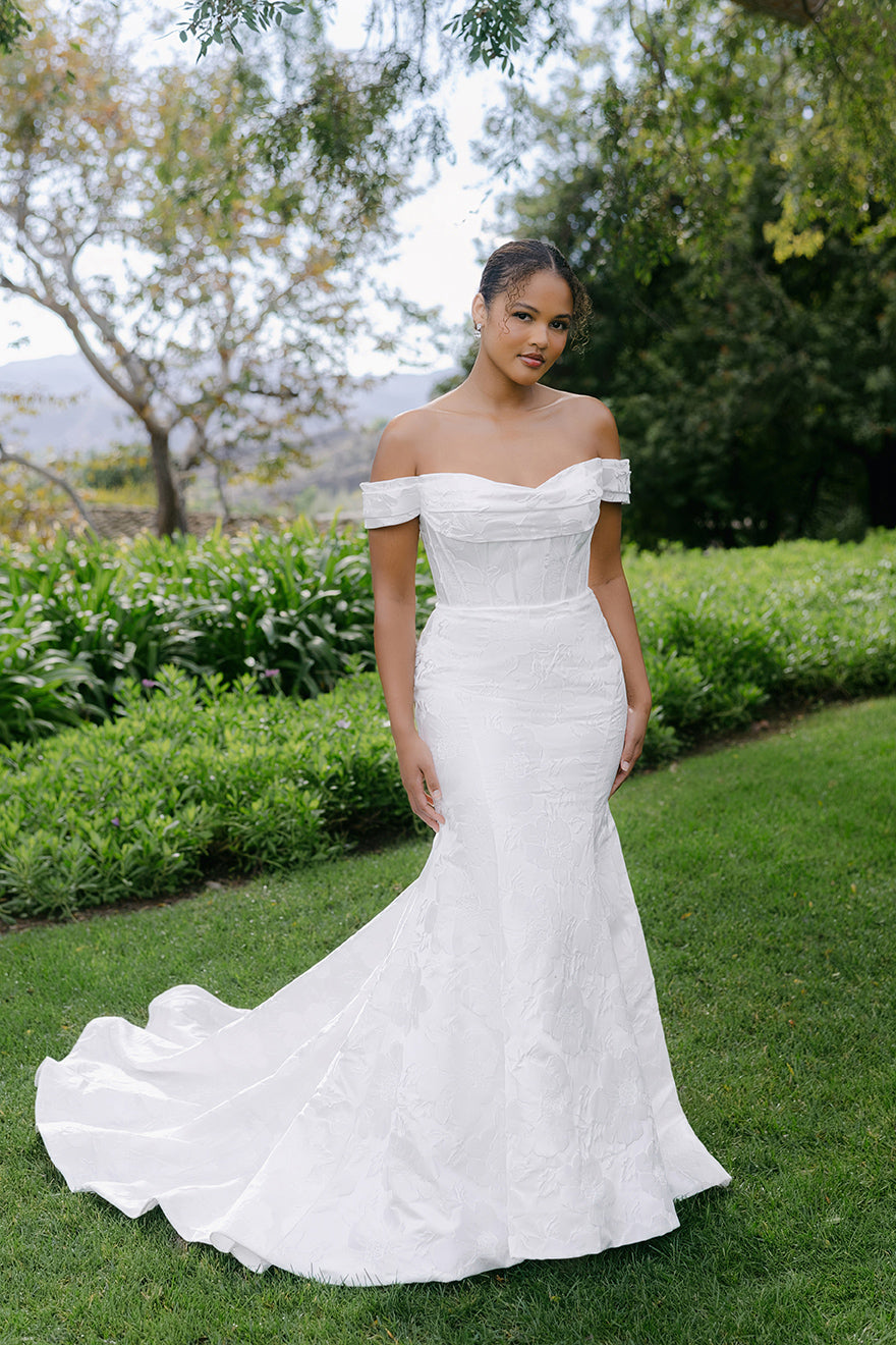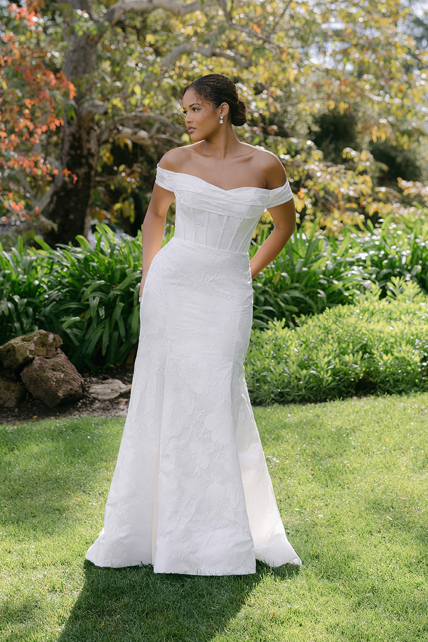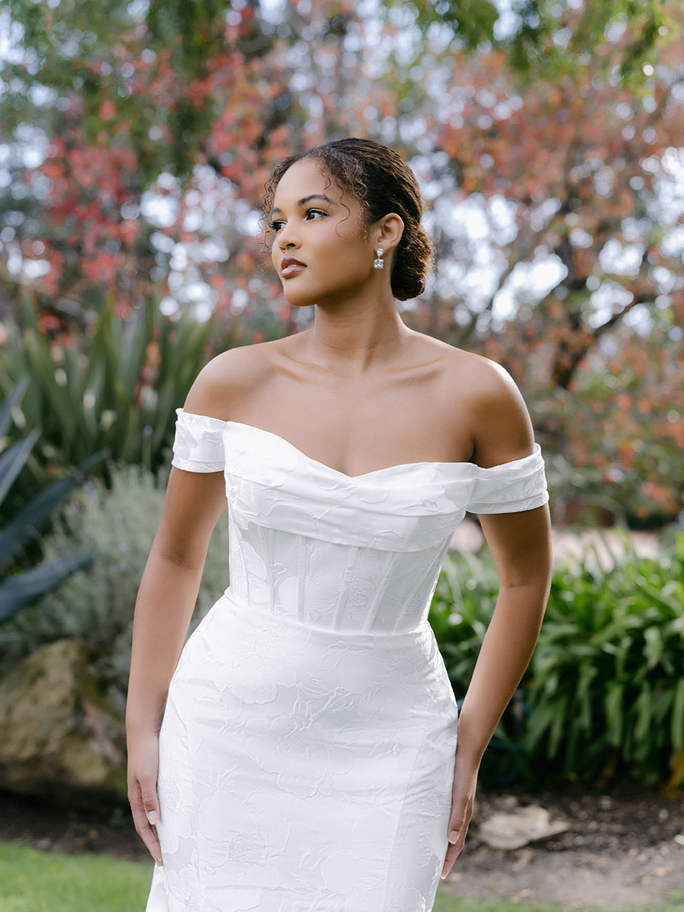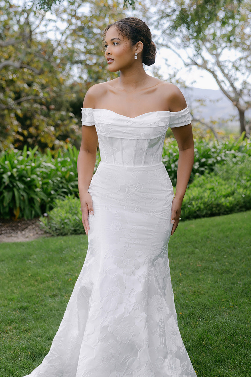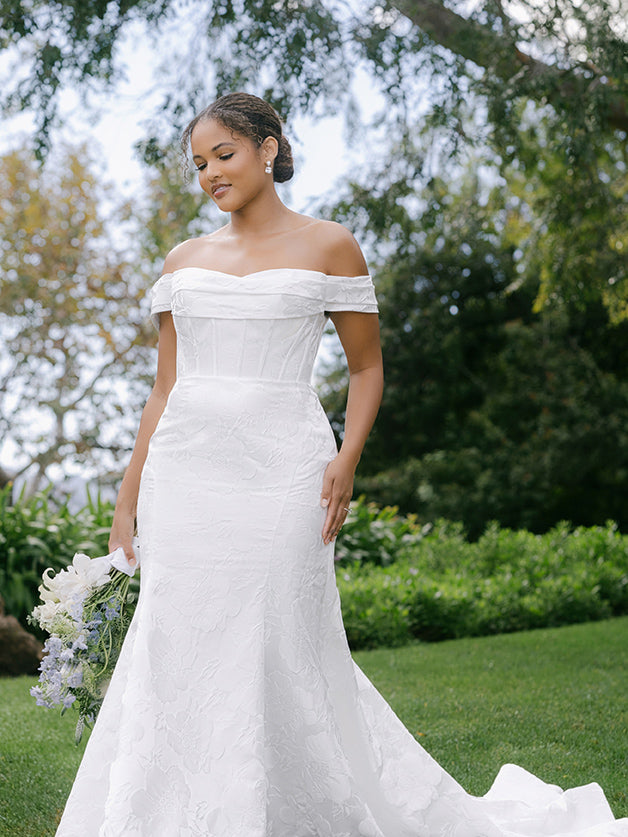 Floral-embossed jacquard lends timeless, vintage appeal to this fit and flare, off-shoulder gown: The Gloria.