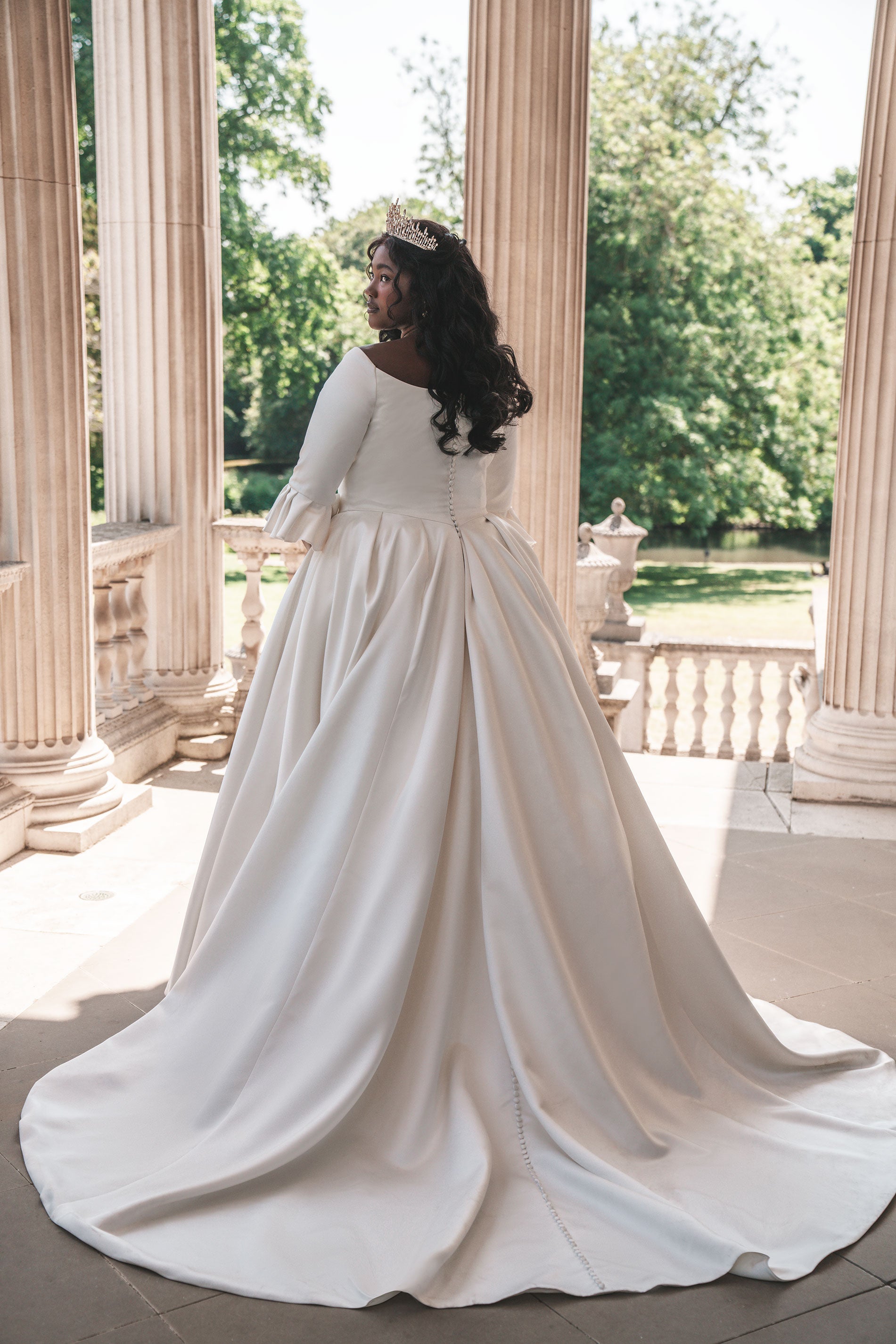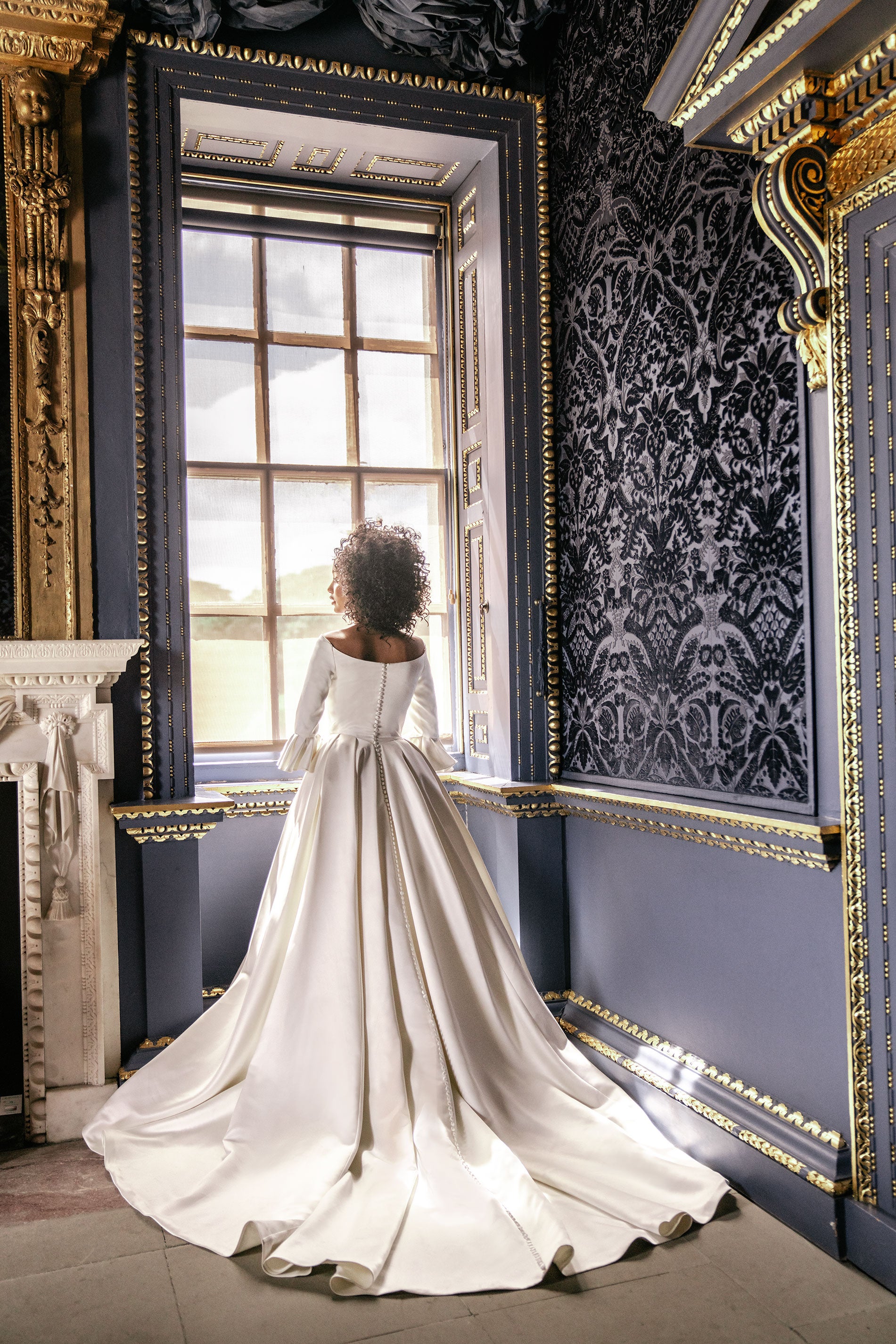 Ladies and gentlement of the ton, it is our delight to introduce a ballgown so glorious, it is nothing less than royal. This satin gown features an elegant portrait neckline, pleated basque waist and tapered sleeves. Sequined, beaded appliques overlay the bodice and skirt.