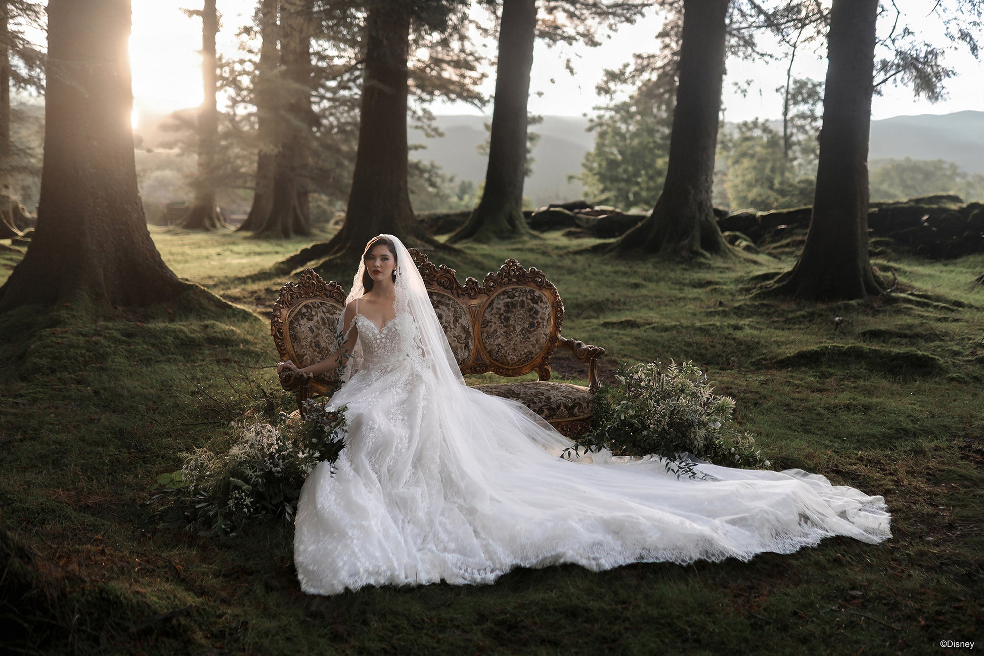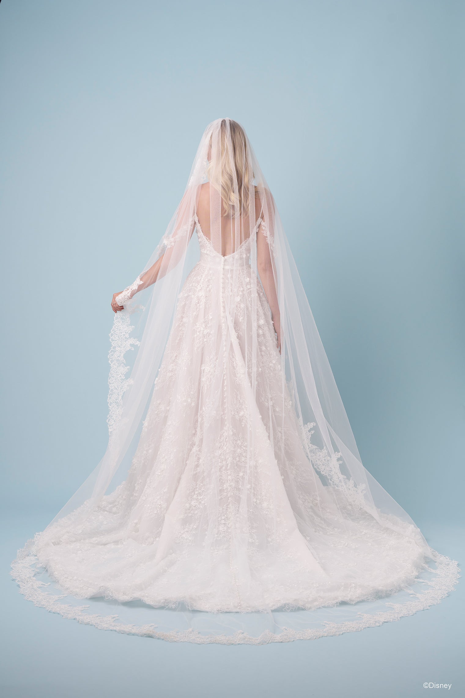 This timeless, cathedral-length veil perfectly complements the Snow White–inspired gown. Crafted from soft tulle, its edges are adorned with delicate lace that mirrors the gown’s floral appliqués, creating a seamless harmony of texture and detail. As it trails gracefully behind, the veil adds an air of regal romance—capturing the gentle spirit and everlasting beauty of a true fairy-tale bride. Read Less
