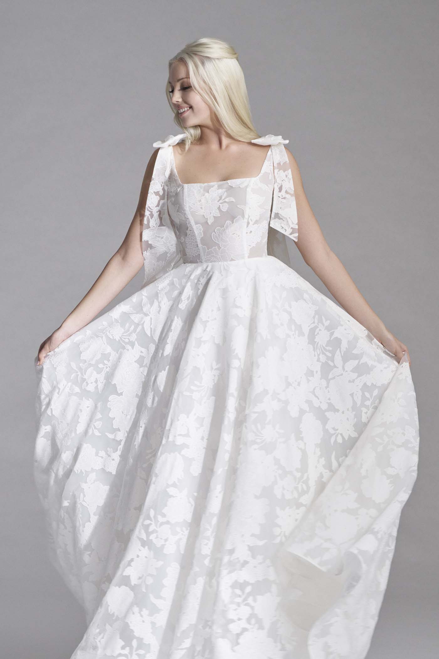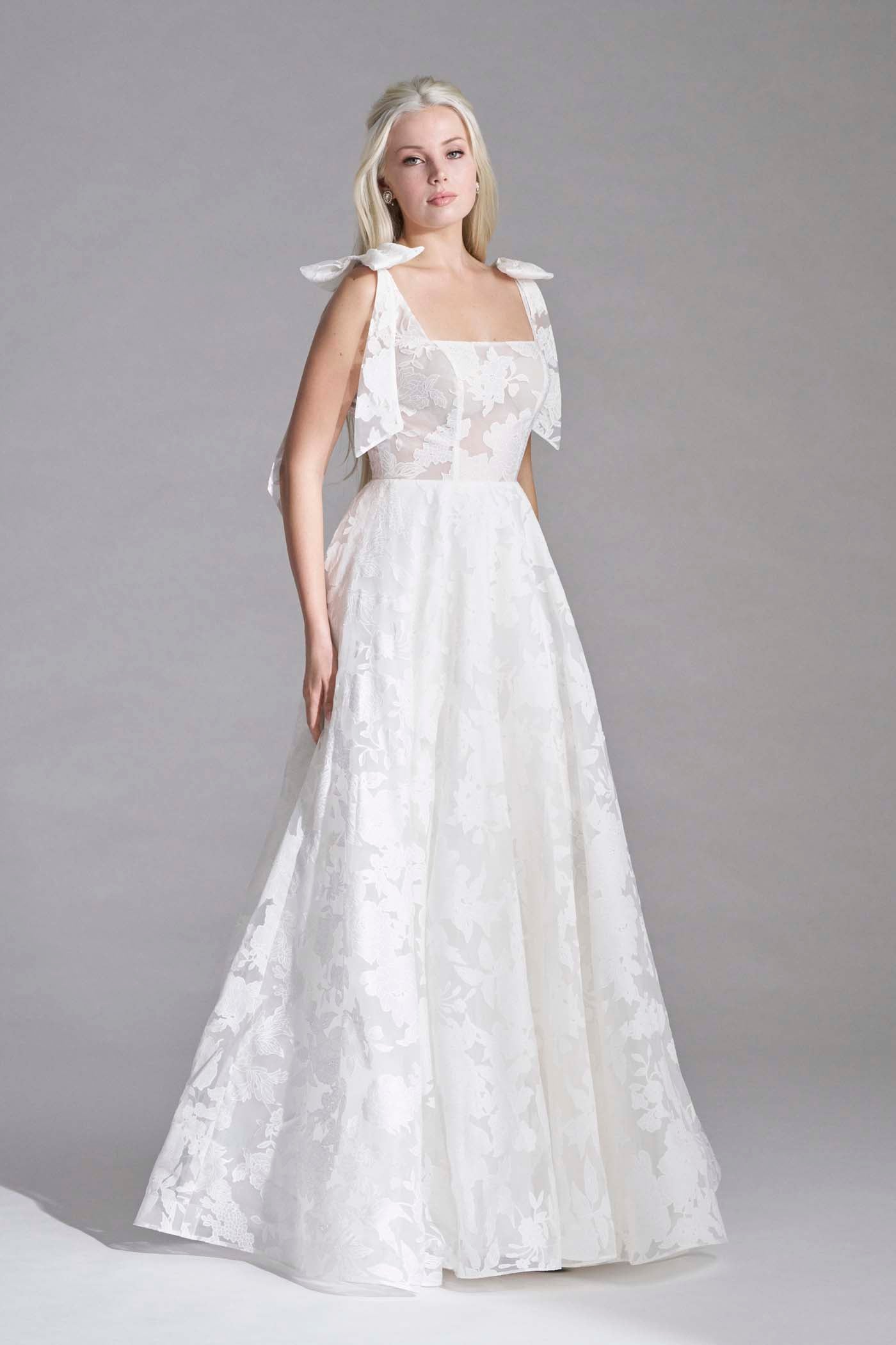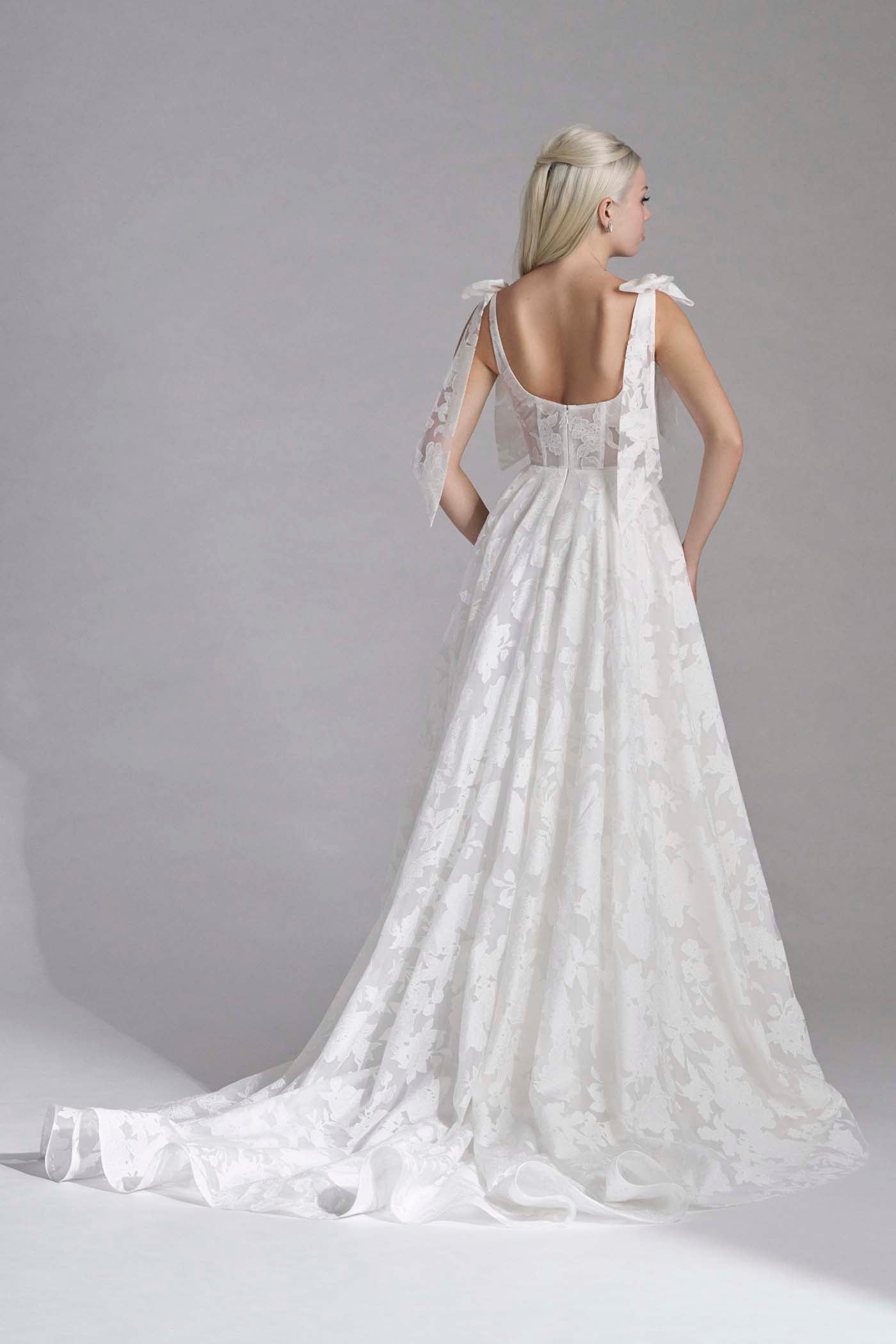 Elle features all over sheer printed organza for a soft, ethereal texture. The structured bodice is framed by a square neckline and wide sleeveless straps, giving shape to the otherwise weightless silhouette. Detachable bow details at the shoulders add a playful touch, while a soft chapel length train completes the look with easy elegance. Please note: This style does not allow for custom changes. Read Less