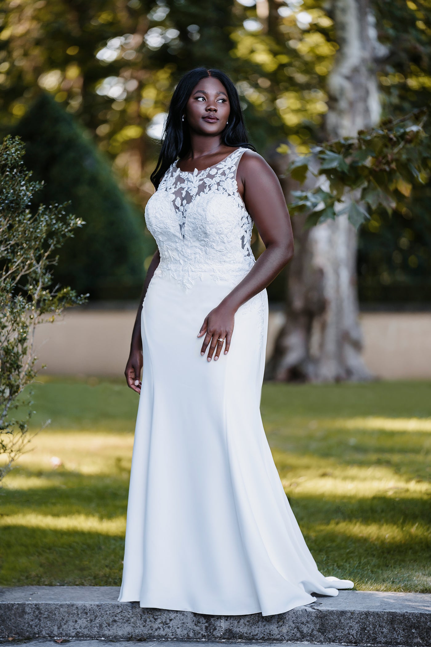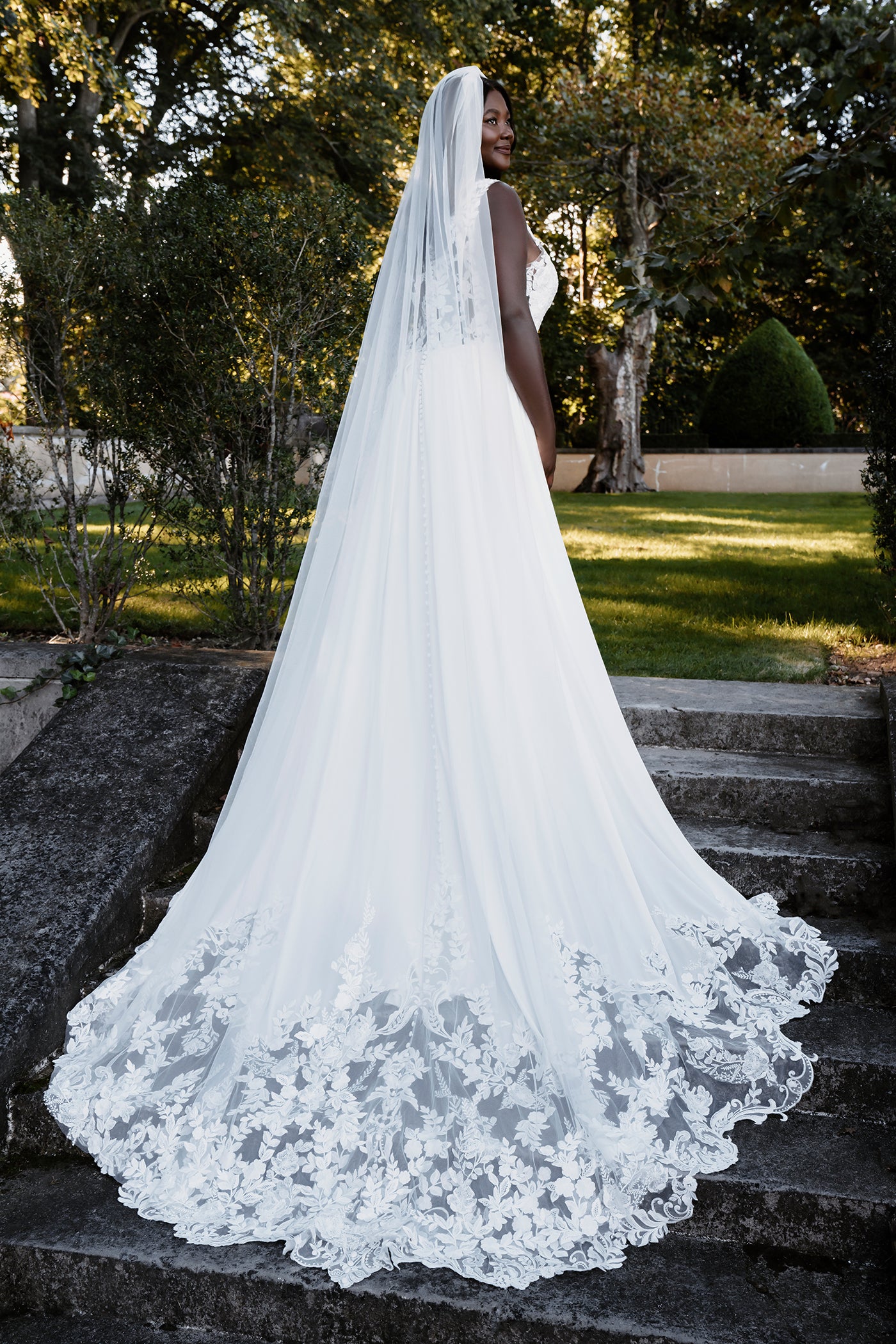 The open back and dramatic plunge bodice of this stunning stretch crepe gown are offset by a high-neck overlay of appliquéd lace. Pictured with veil, V043C.