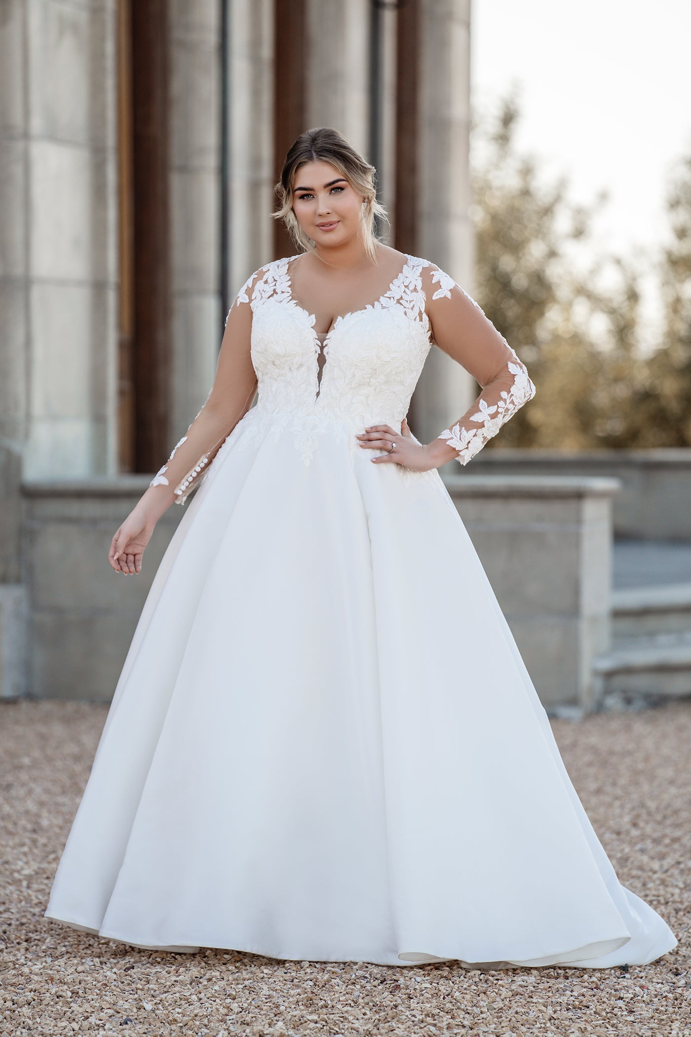 Elegant Mikado shimmers alongside a Chantilly lace bodice to create a striking and timeless ballgown.