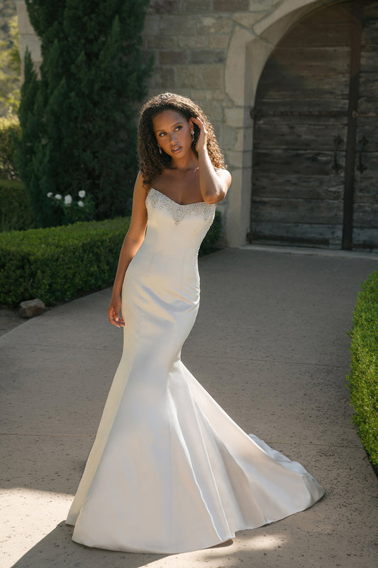 This sleek satin fit-and-flare gown combines sculpted simplicity with hand-beaded artistry that reflects Allure Bridals’ signature craftsmanship. The strapless cat-eye neckline is adorned with intricate beadwork that continues across the back—an unmistakable nod to the brand’s classic beading, renowned for its quality and unmatched detail. Designed with a natural waist and clean, tailored lines, this gown captures modern refinement with a touch of timeless Allure glamour.
