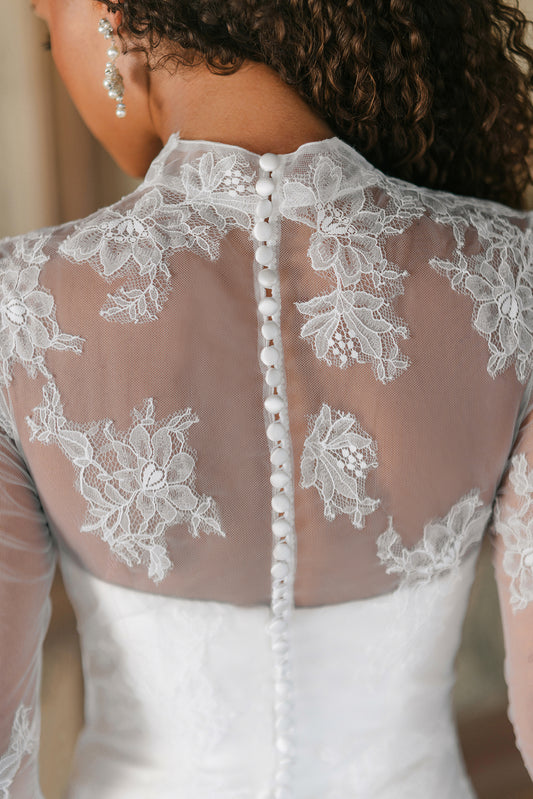 A modern statement in texture and form, this fit-and-flare gown features bold matte lace layered over a soft Chantilly underlay for depth and dimension. The cat-eye neckline offers a subtle nod to vintage glamour, while the sheer back highlights the artistry of the lace placement. Designed with a natural waist and sweeping train, this gown combines structure and softness in perfect balance.