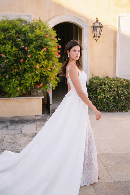 This fully lined version of the gown softens the look with a smooth chiffon skirt that flows gracefully from the bold lace bodice. The basque waist creates flattering structure, while detachable chiffon sleeves add a romantic, ethereal touch. Crafted in lace and chiffon, this timeless design offers elegant coverage and fluid movement for a beautifully classic bridal silhouette.