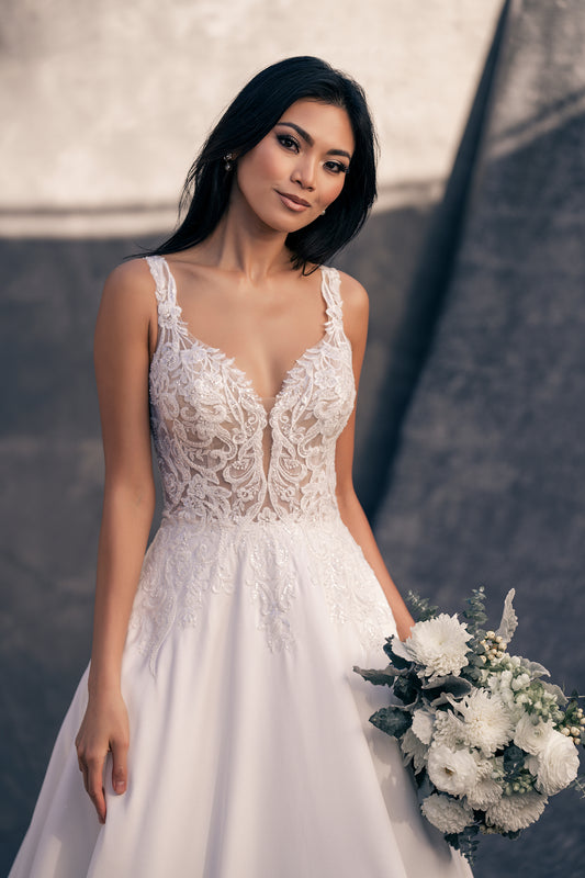 Statuesque in silhouette, this fit and flare appliqued lace gown features detachable sleeves. This Allure Couture C706 gown is also available with detachable sleeves C706SL sold separately. Shop both gown and sleeves when you search for your local Allure Couture retailer today.