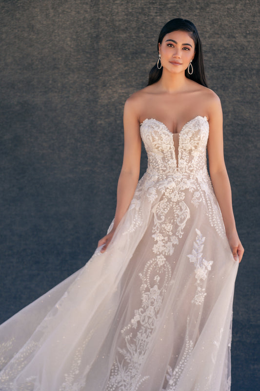 Complementing textures and tones show throughout the beaded and sequined lace appliques featured on this sparkling A-line tulle gown. Detachable statement sleeves add another layer of beauty. This Allure Couture C731 gown is also available with detachable sleeves C731SL sold separately. Shop both gown and sleeves when you search for your local Allure Couture retailer today.