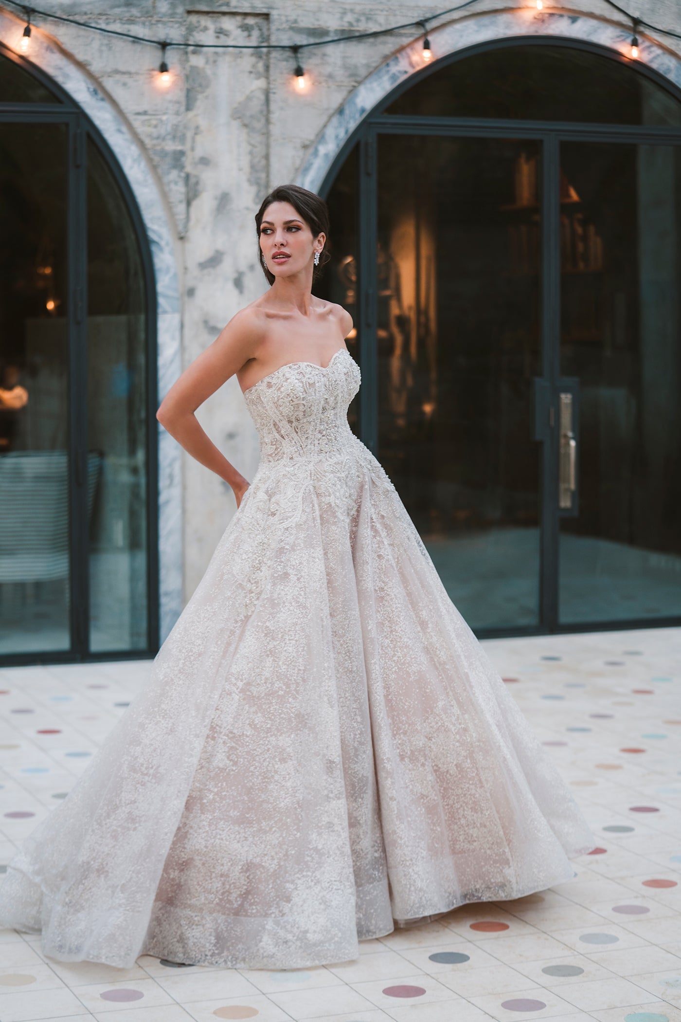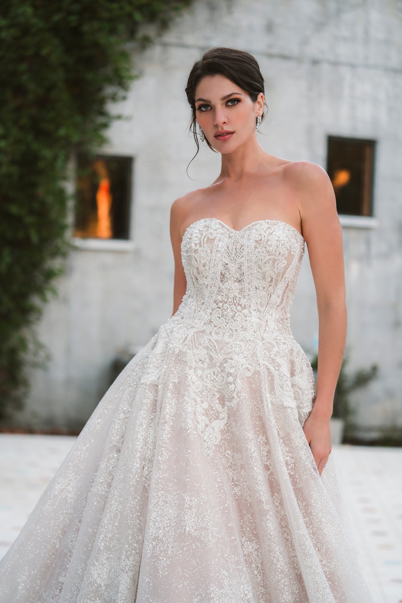 Accented with detachable sleeves and dimensional lace blossoms, Jouri is crafted from glittering tulle in a classic A-line silhouette.