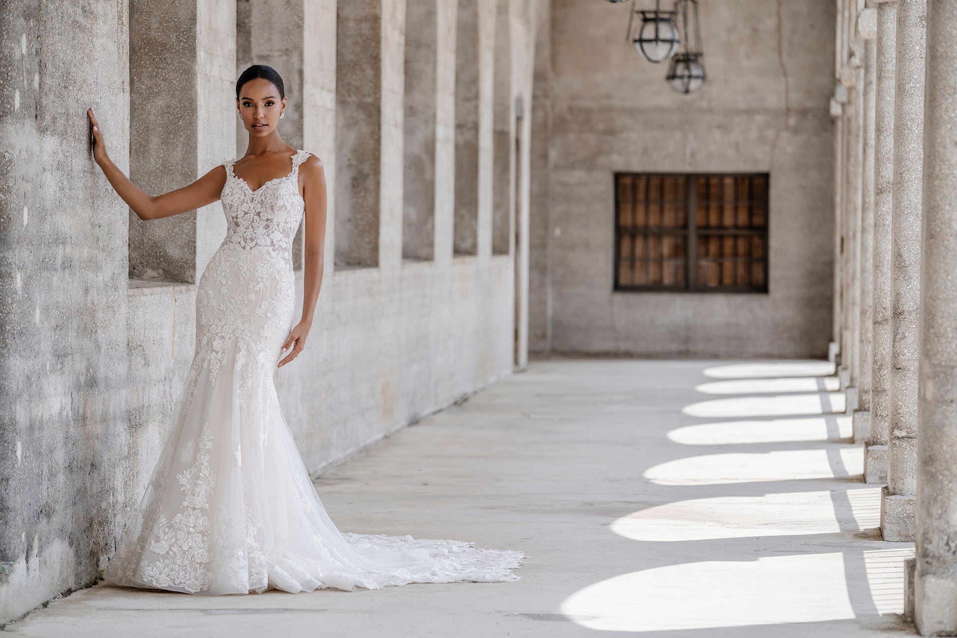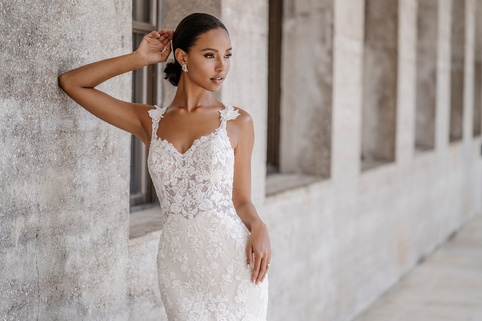 Beaded lace appliqués adorn this classic sheath bridal gown.