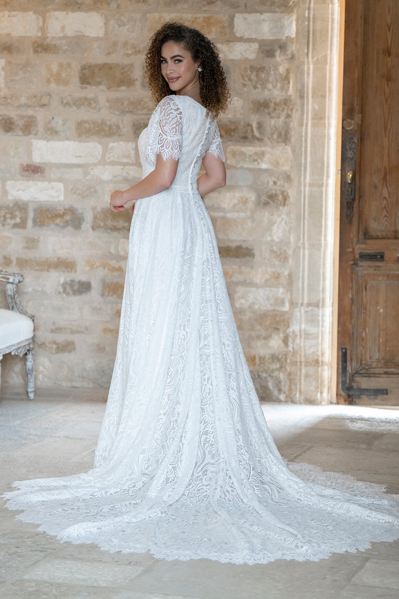 Soft sheet lace composes this romantic modest lace wedding dress, which is accented with a pair of fluttering eyelash lace-trimmed sleeves.