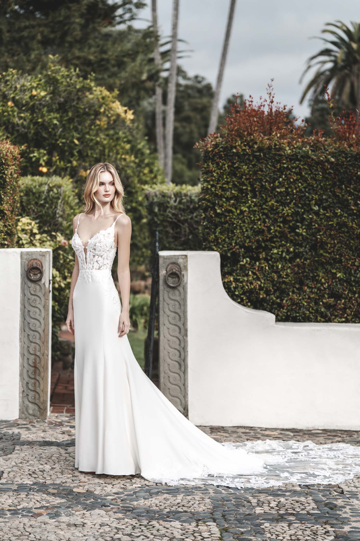 This curve-hugging crepe sheath gown is accented with a matte floral lace bodice and appliqued illusion train.