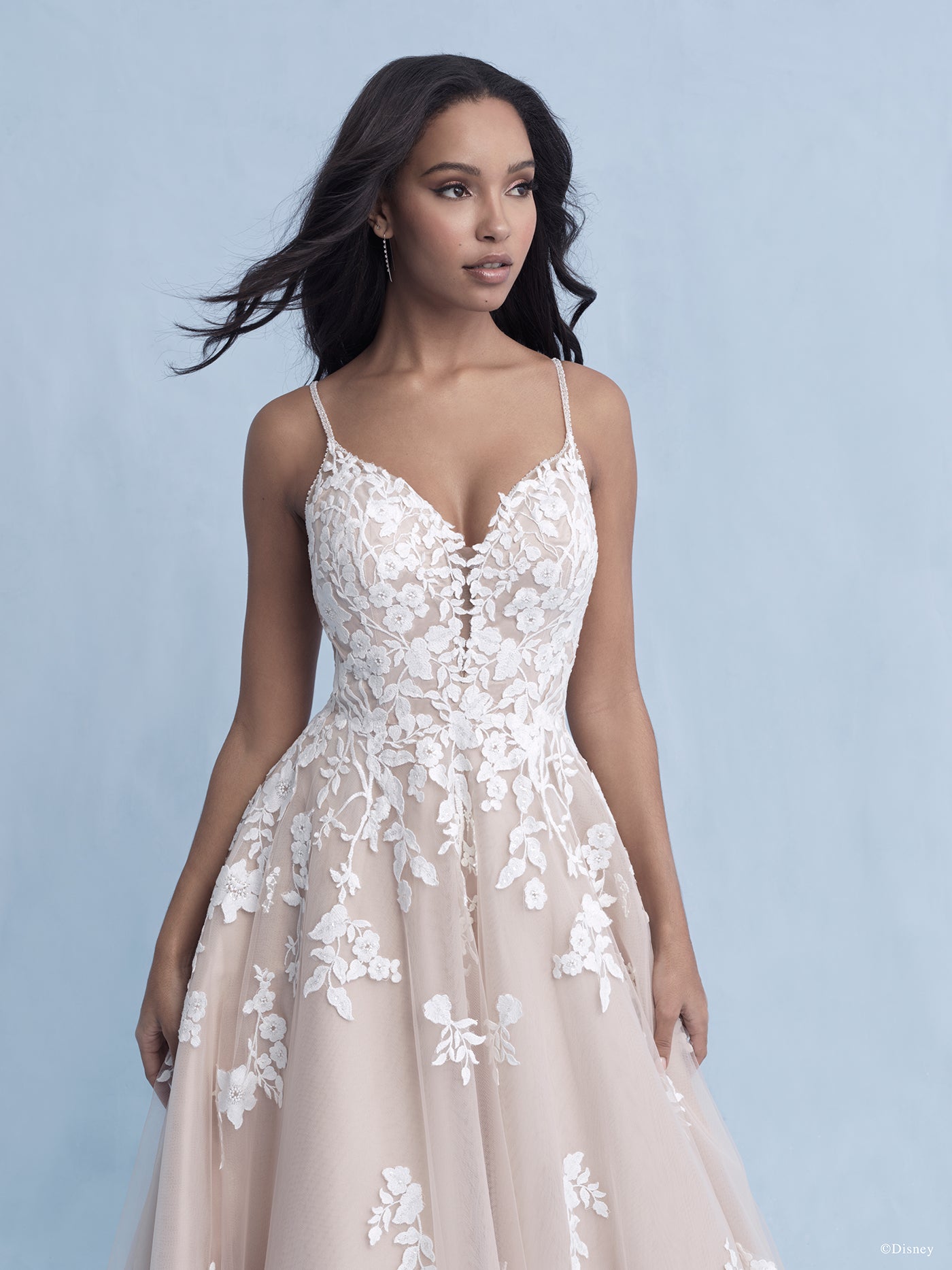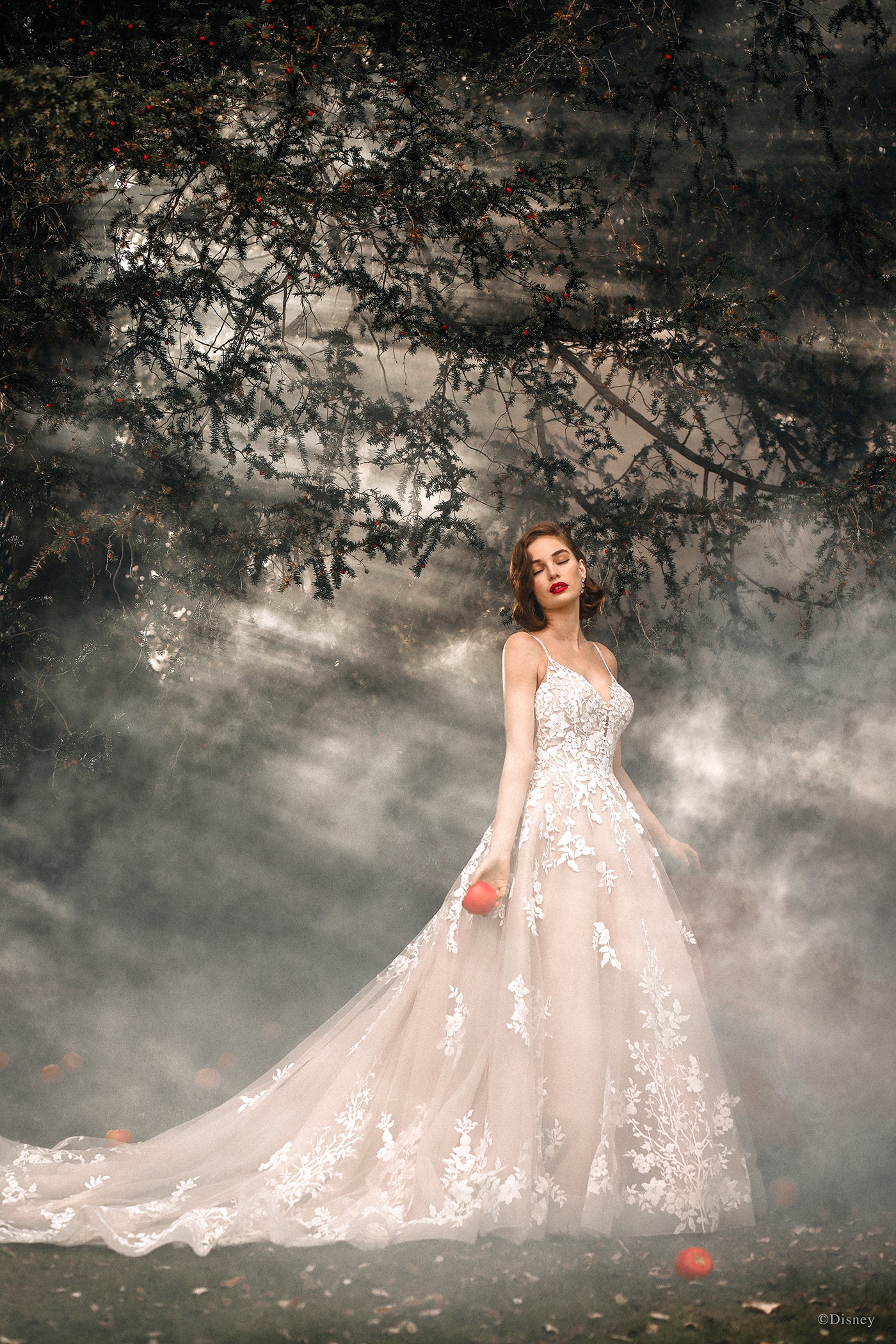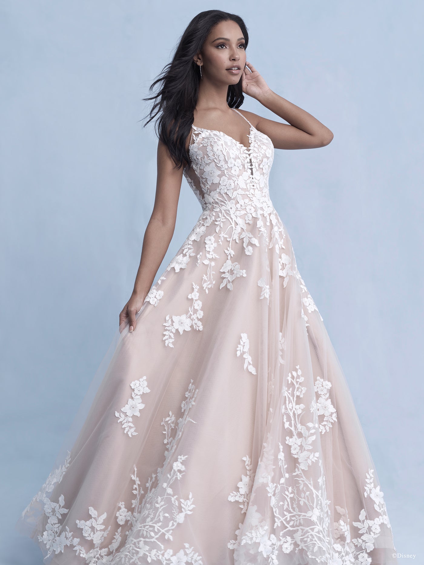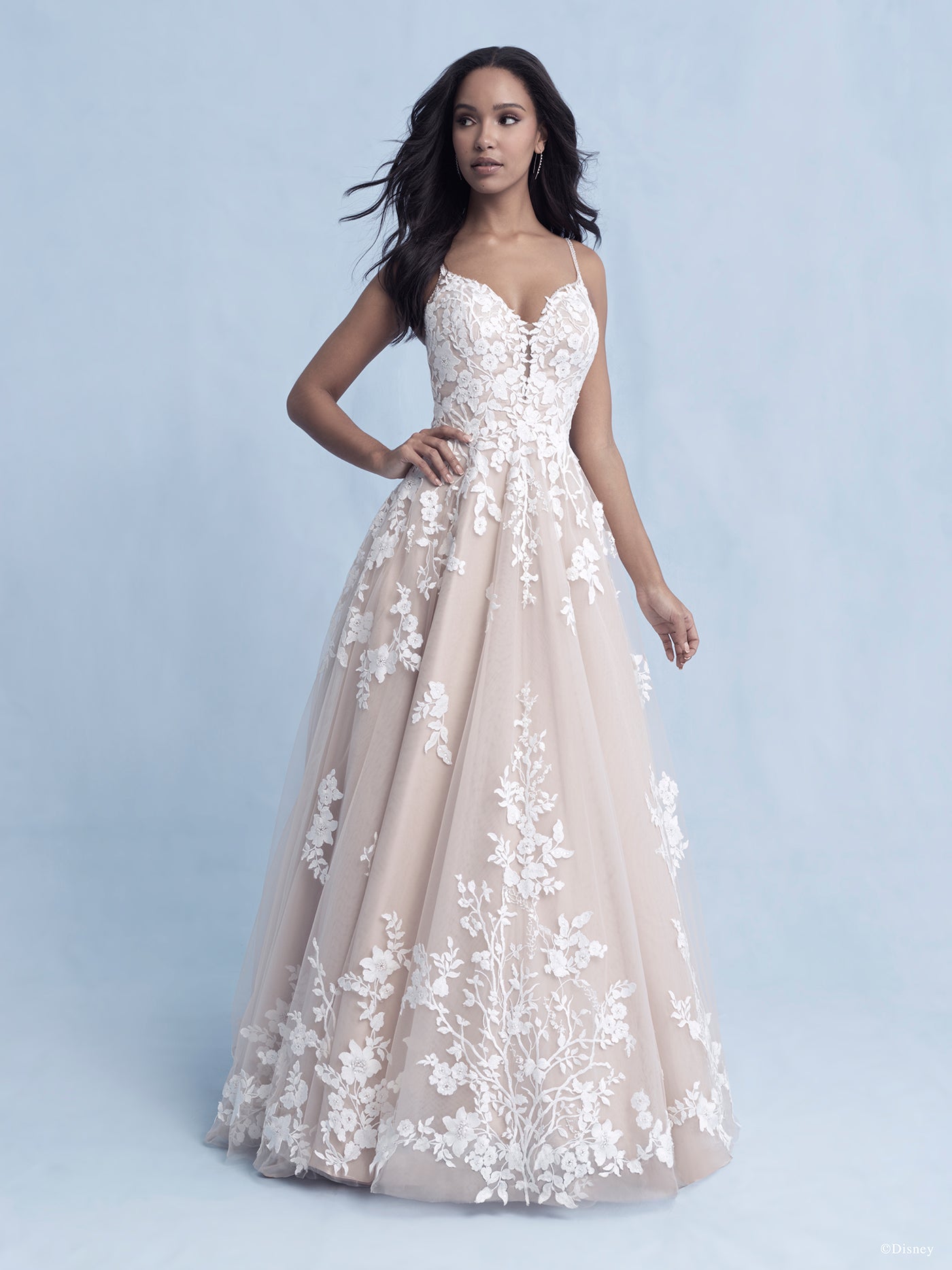 Capturing Snow White's gentle grace and beauty, this classic-inspired ballgown features a bouquet of 'apple' blossoms on the bodice that gracefully cascade down the skirt and cluster at the hemline.