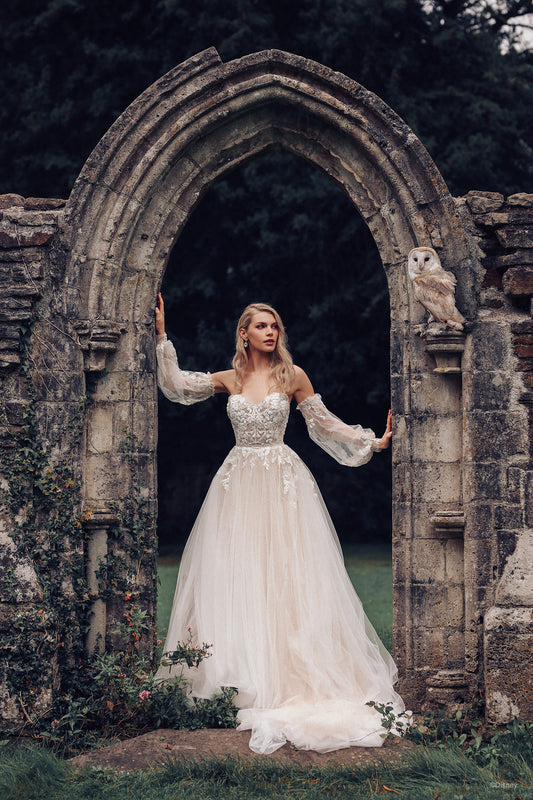 Detachable bishop sleeves are the perfect addition to our Aurora-inspired gown.
