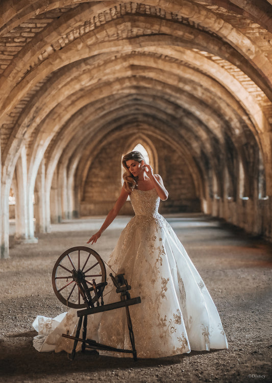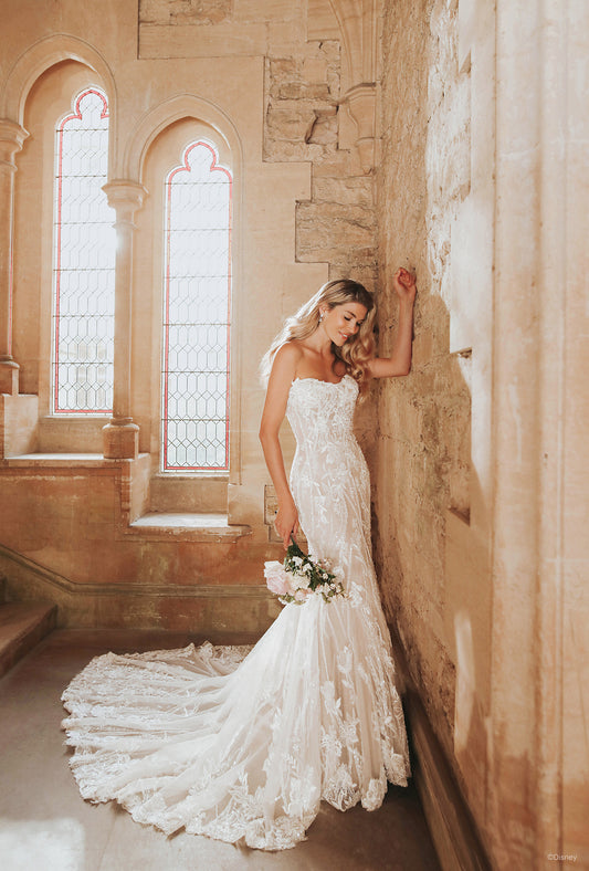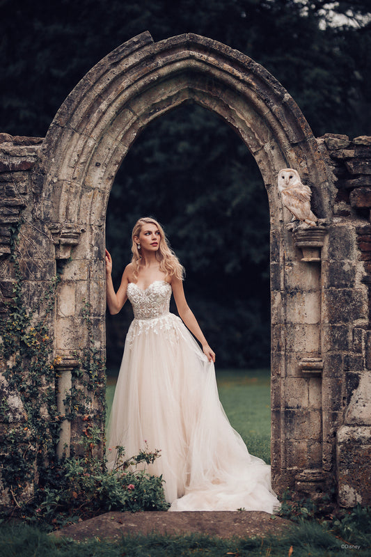 The Disney Fairy Tale Weddings Aurora Collection enchants with romantic floral details, soft shimmering fabrics, and graceful silhouettes—perfect for brides dreaming of a timeless happily-ever-after.