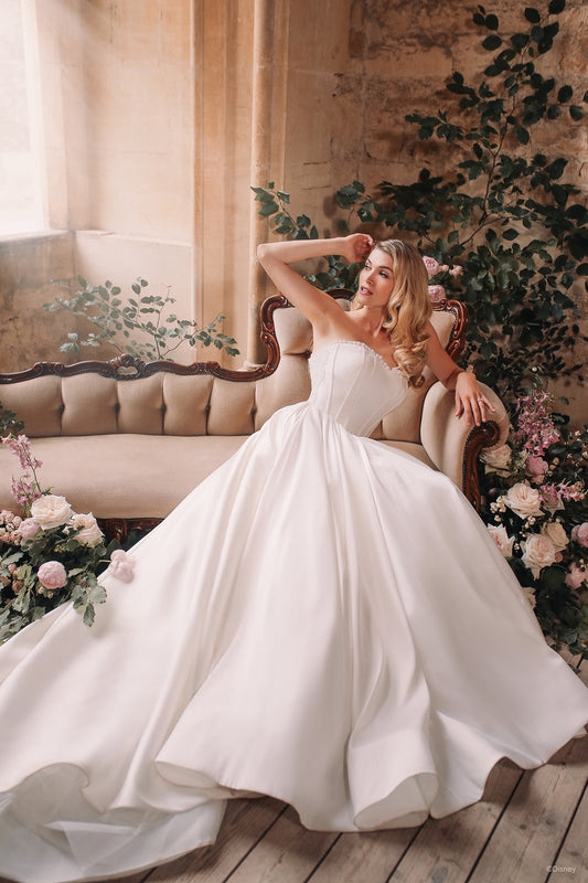 For the bride dreaming of a true fairytale moment, this Aurora-inspired ballgown brings the story of Sleeping Beauty to life in enchanting detail. The gown’s jacquard fabric and striking cateye neckline is balanced by the corset-style and gathered center twist of the bodice. The iconic basque waistline flatters and elongates, giving the bride an effortlessly graceful silhouette as she steps into her happily-ever-after. In a dreamy shade of dusty pink, this gown is a celebration of love that transcends time—a perfect choice for a bride ready to make her own fairytale come true.