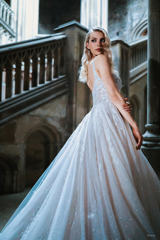 The timeless Aurora Platinum ballgown truly dazzles, with airy, beaded lace appliques clustered down the train in eye-catching floral 'briar rose' inspired detail. The striking neckline offers a sparkling focal point and reminiscent of Aurora's regal silhouettes. Shown with matching veil, DV01, sold separately.