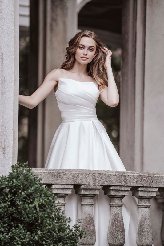 Meet Farley: a flirtatious strapless ballgown in Mikado, adorned with a perfect bow at the bodice.