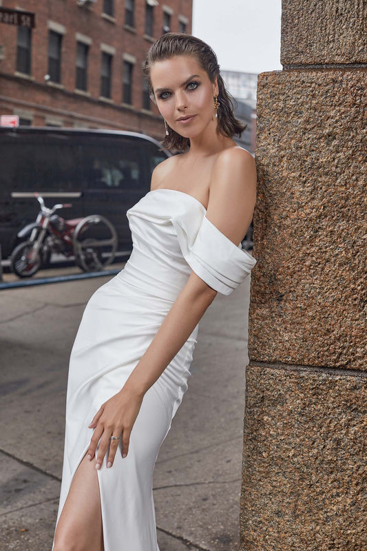 Luxurious stretch satin, tucked and ruched in all the right places and artfully draped off the shoulder, makes our Jade gown absolutely perfect for the glamorous and classic bride.