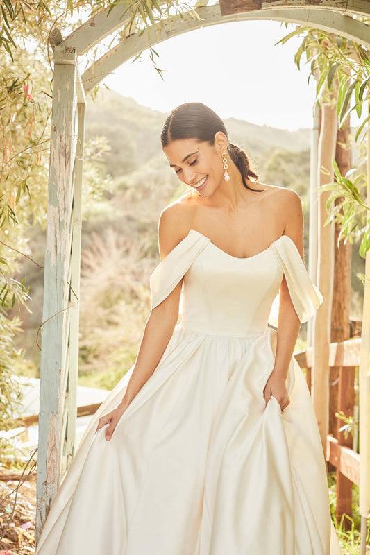 Luxurious stretch satin, tucked and ruched in all the right places and artfully draped off the shoulder, makes our Jade gown absolutely perfect for the glamorous and classic bride.