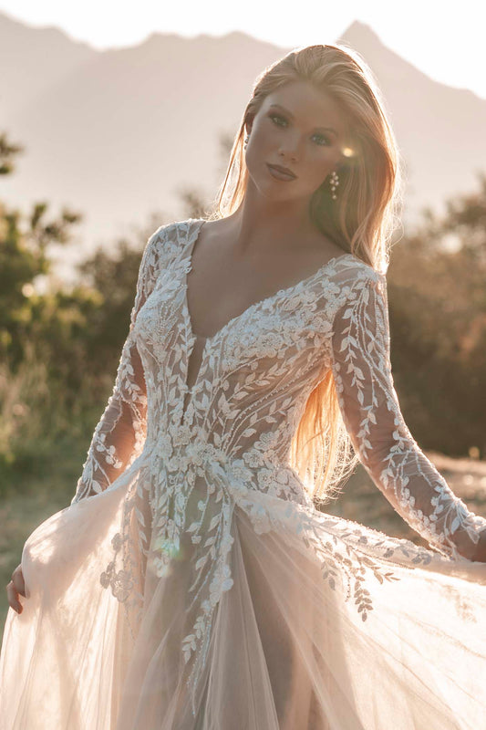 All the romance of of realistic blossoms and trailing vines are embodied in our Johnny gown - perfect for a secret garden wedding.