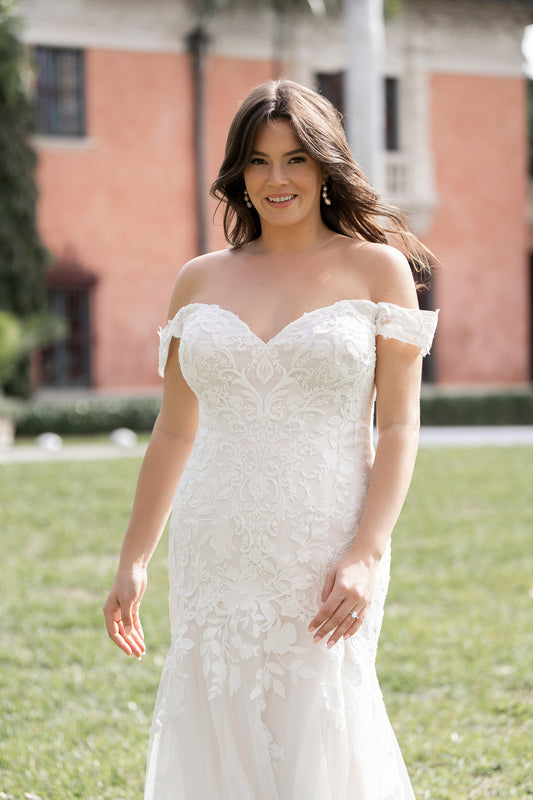 This soft sheath gown is layered in beaded lace appliques over tulle, offering texture and sparkle in all the right places. A sweetheart neckline and off-the-shoulder sleeves frame the bodice, while a high V-back adds balance and support. The sheer cathedral-length train creates a dramatic finish that feels both graceful and grounded.