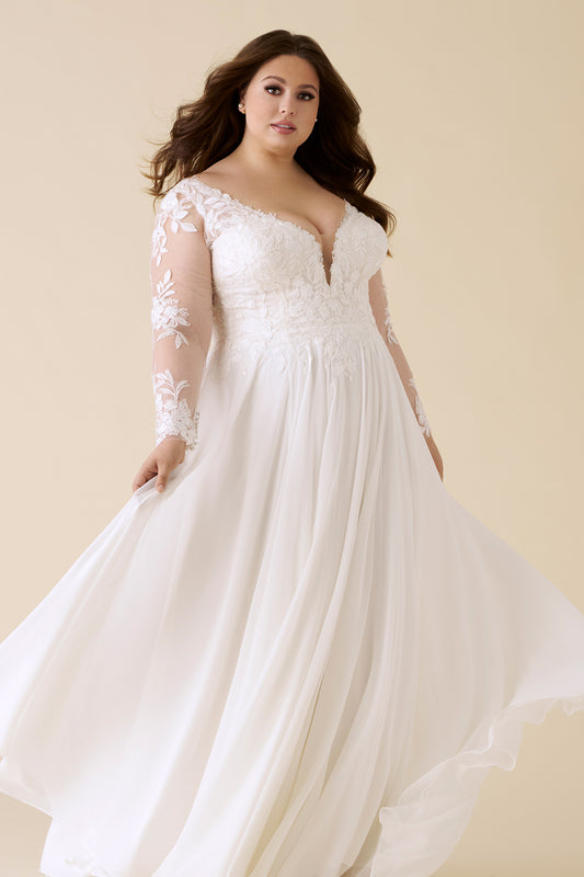 Delicate and airy, this gown features long lace sleeves and a plunging V-neckline that balances femininity with confident styling. A scoop back adds softness, while the chiffon A-line skirt flows effortlessly from the waist for light, graceful movement. It’s a romantic silhouette designed to feel as beautiful as it looks.