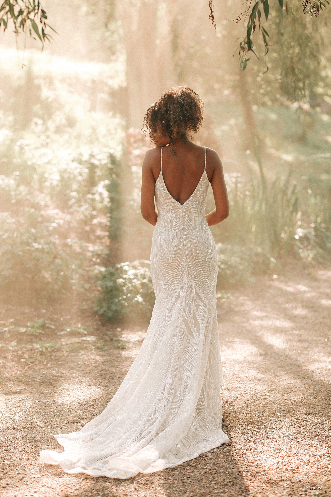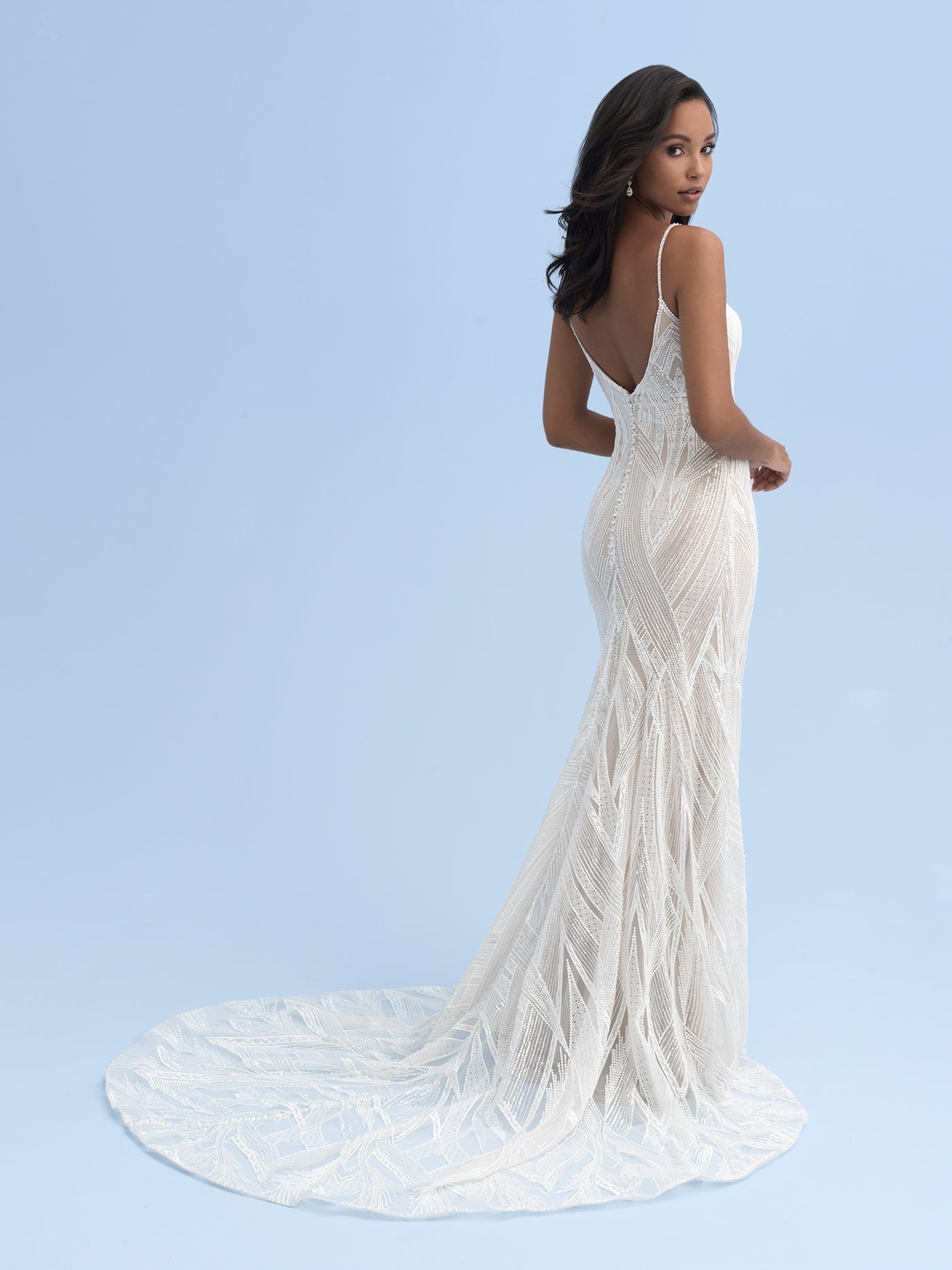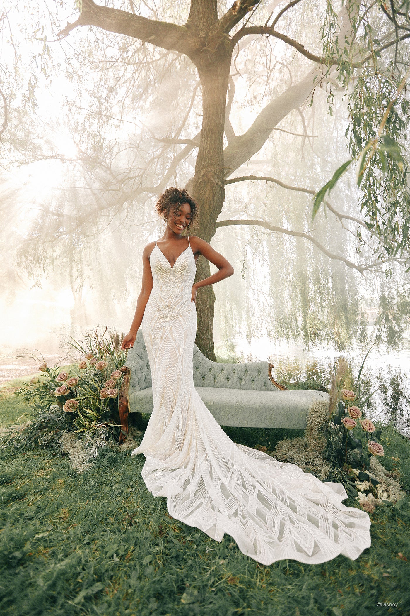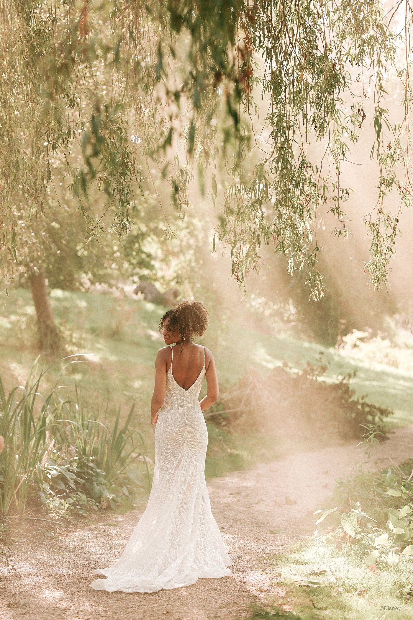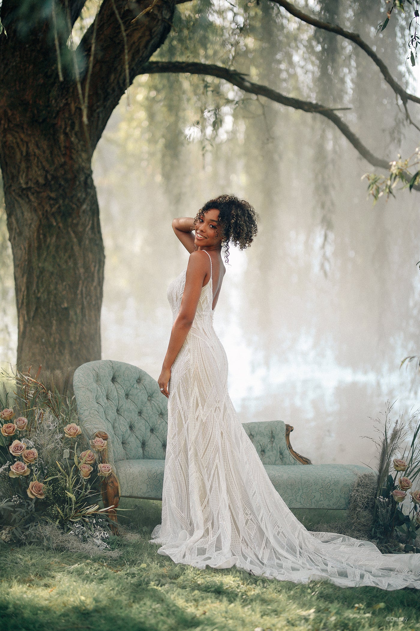 Una intrincada combinación de lentejuelas y bordados con estampado Art Decó adornan una silueta de tubo: un homenaje a Tiana y la fabulosa moda de la Era del Jazz.