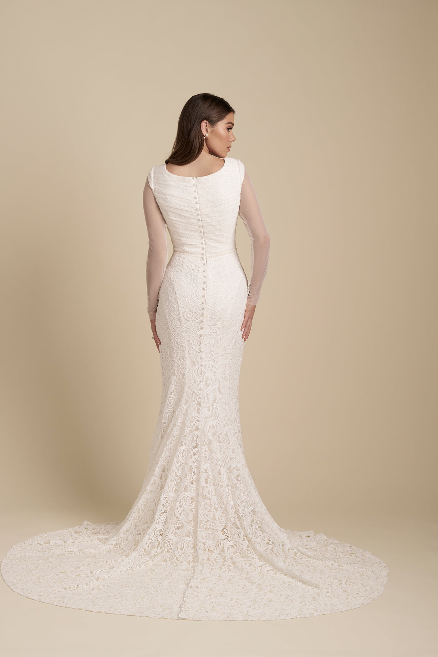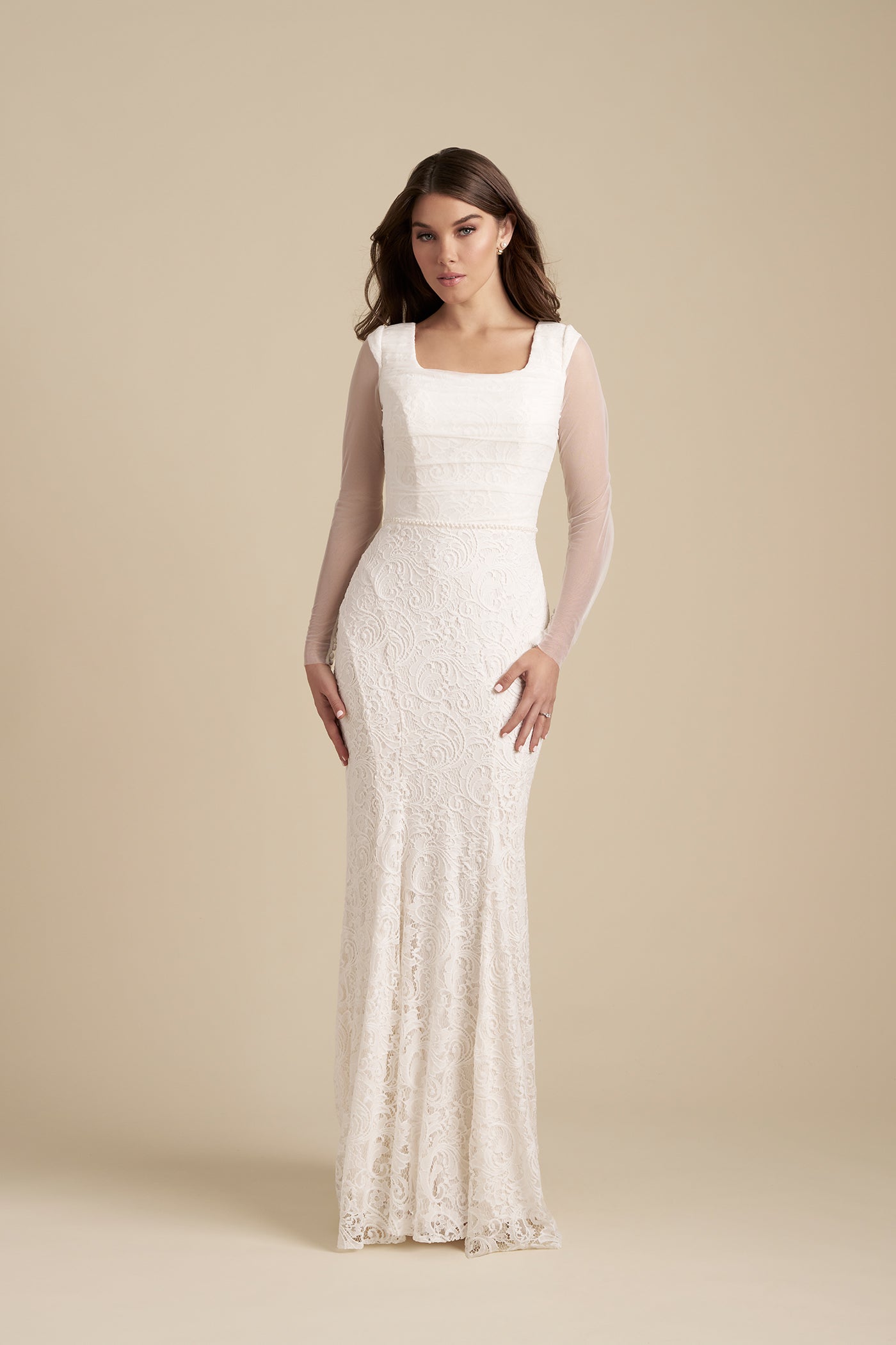 Este modesto vestido tubo combina un corpiño de tul fruncido con una lámina de encaje integral, creando profundidad y suavidad sin sacrificar la estructura. El escote cuadrado y las mangas largas de tul transparente aportan un toque romántico, mientras que la cintura a la cintura y la falda con paneles ofrecen una silueta limpia y estilizada. Es una elegante combinación de cobertura y contorno, con detalles atemporales en cada capa. Read Less