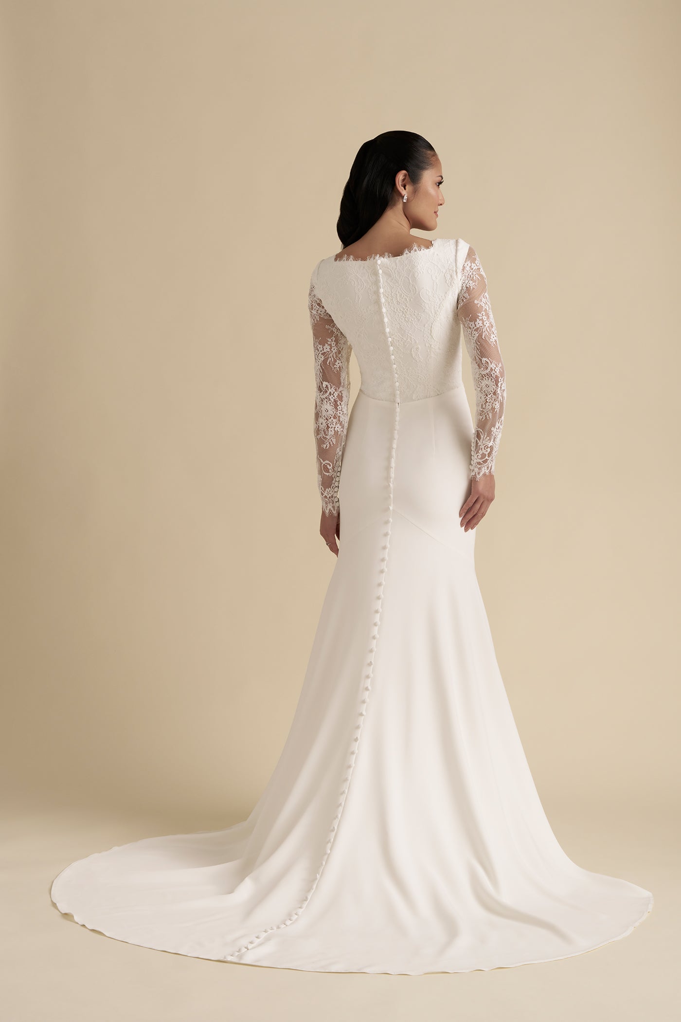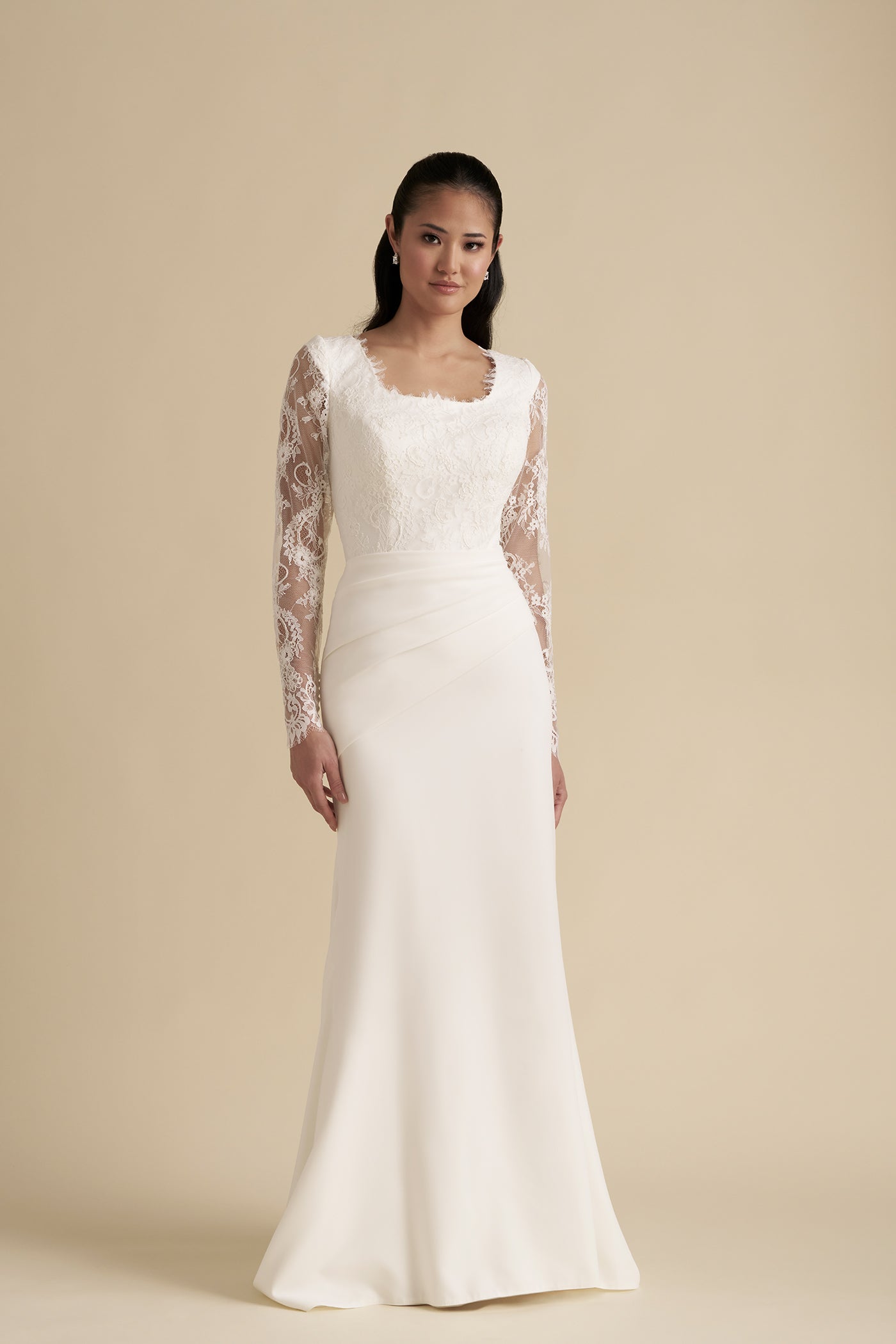Este modesto vestido combina un escote cuadrado estructurado con mangas largas transparentes de encaje de ojal que se extienden con gracia hasta el corpiño. El contraste de texturas da paso a una falda de crepé ligeramente fruncida con corte tubo, creando un look a la vez elegante y ro... Read More