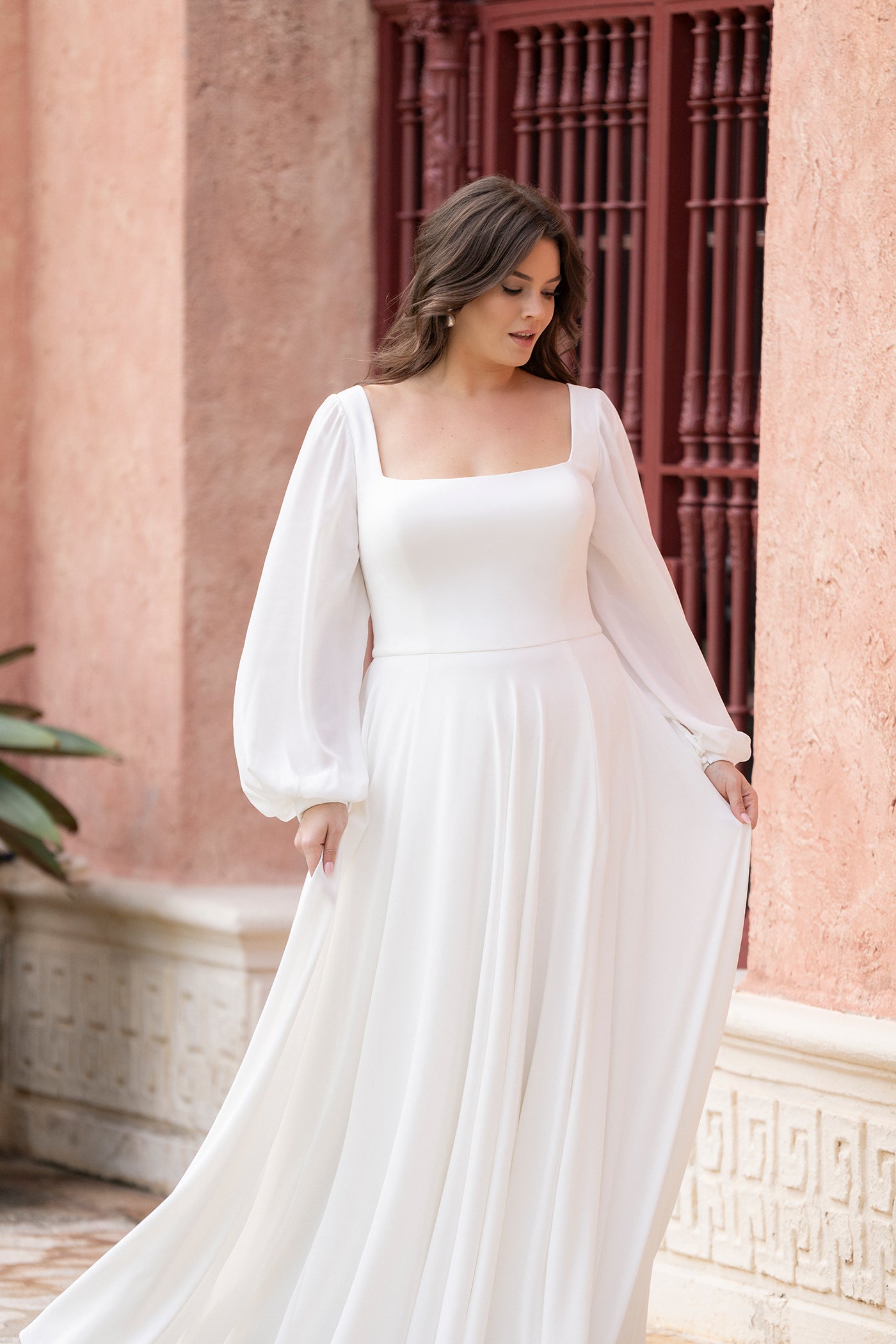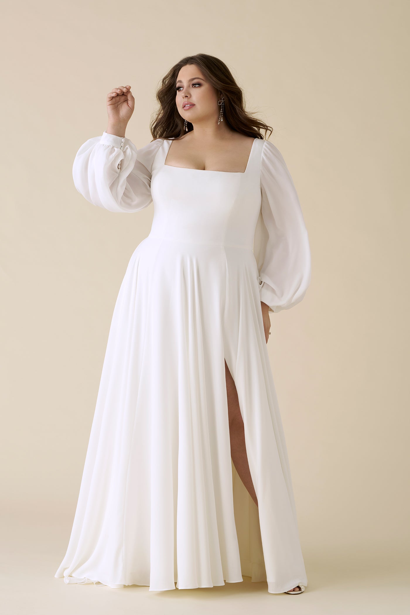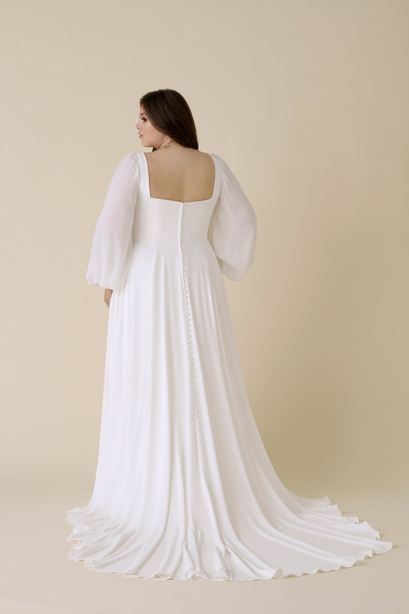 Este suave vestido de corte A combina un elegante corpiño y falda de crepé con mangas ondulantes de gasa para un look refinado y romántico. La cintura natural se ciñe para mayor definición, mientras que una abertura a la altura del muslo le aporta movimiento y un toque de vanguardia. Rematado con una cola corta y elegante, es la combinación perfecta de comodidad, seguridad y un toque de dramatismo discreto. Read Less
