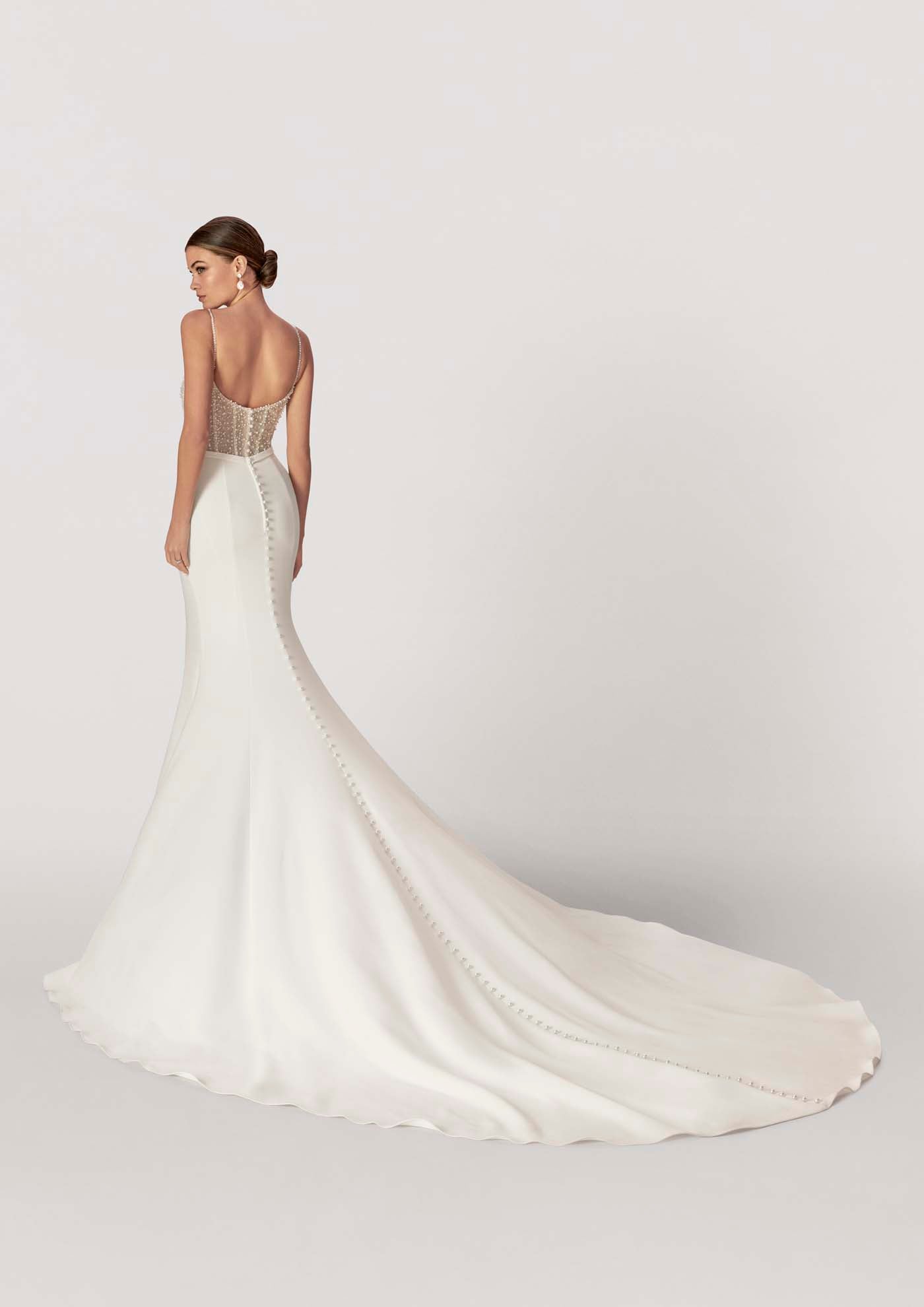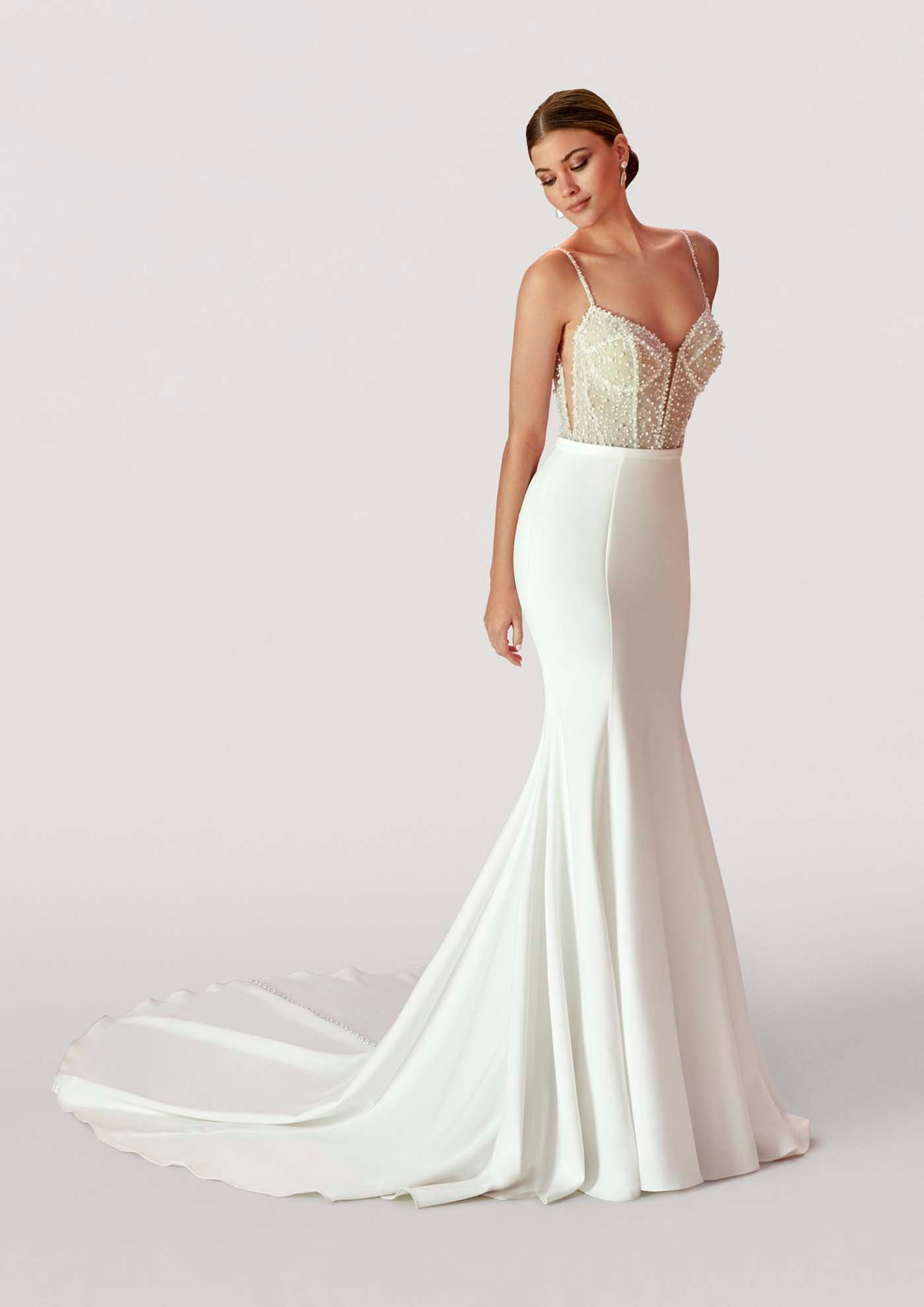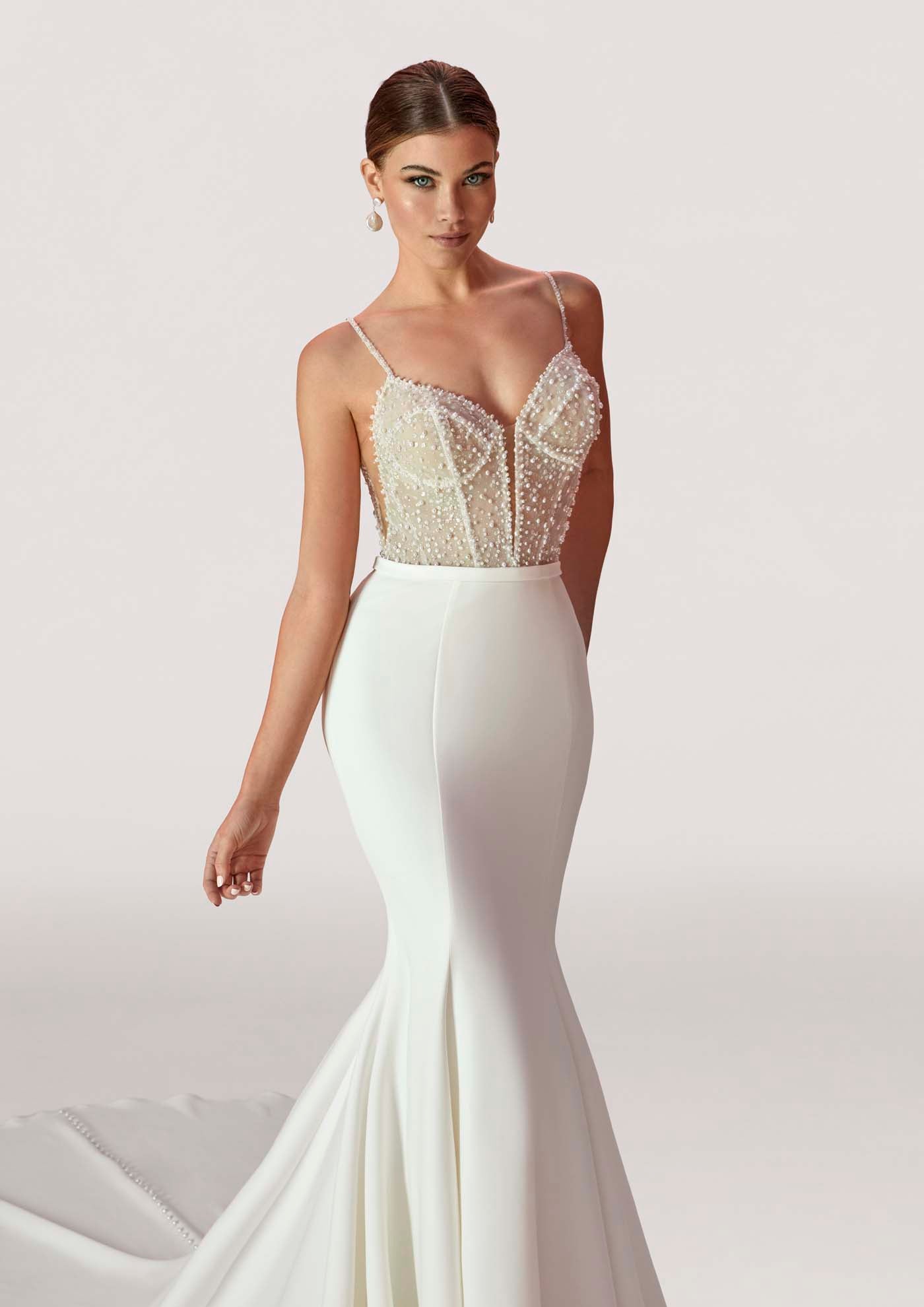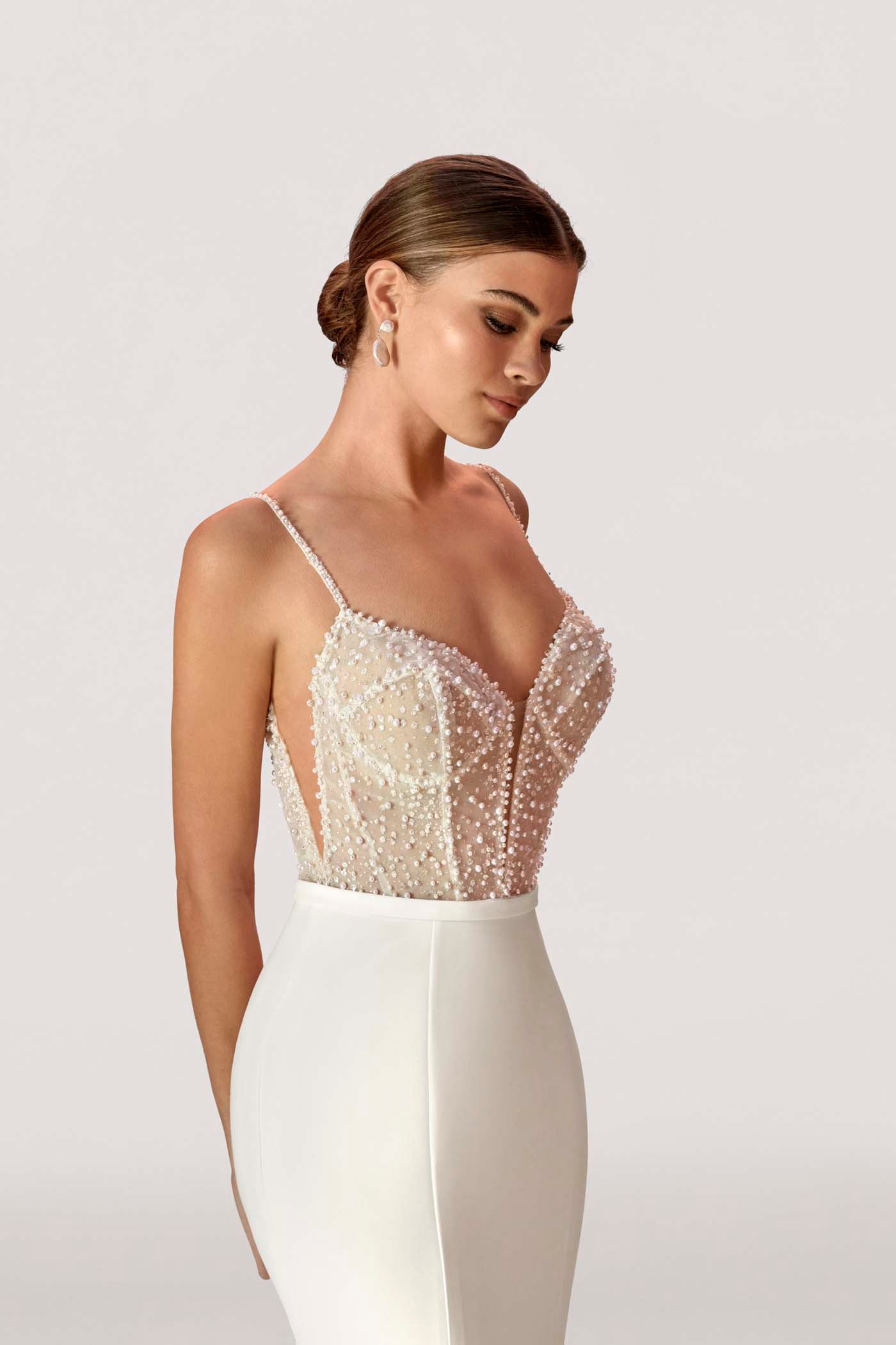 El vestido Gigi es un vestido ajustado de crepé con un corpiño de corazón de perlas brillantes.
