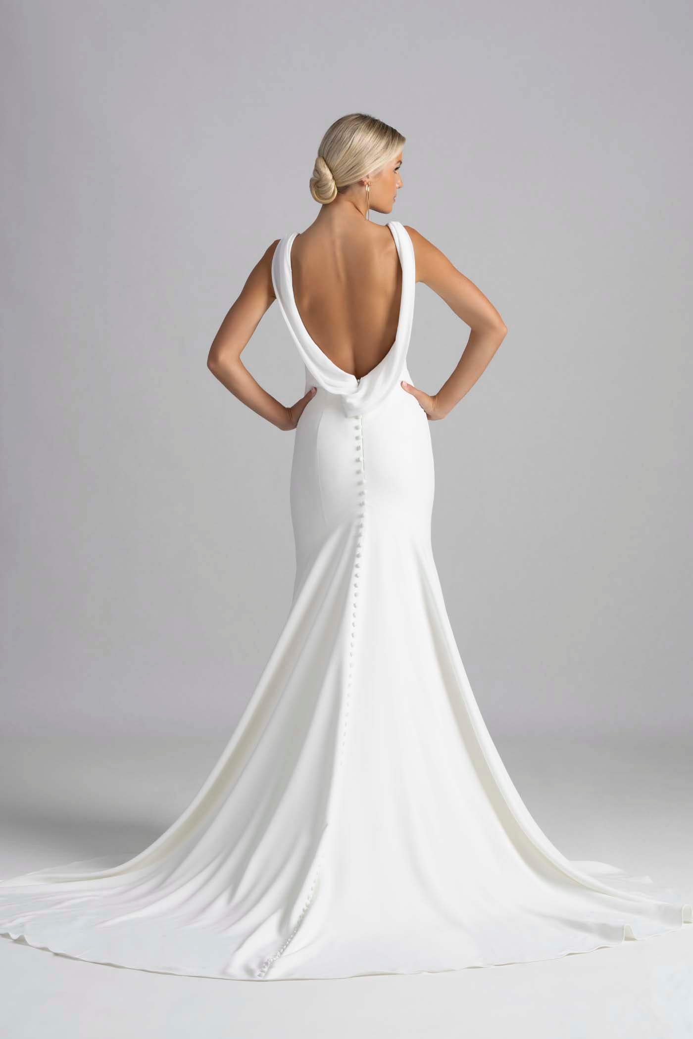 Una espalda drapeada y con vuelo es el toque final perfectamente sofisticado de nuestra funda de crepé elástico Fiona.