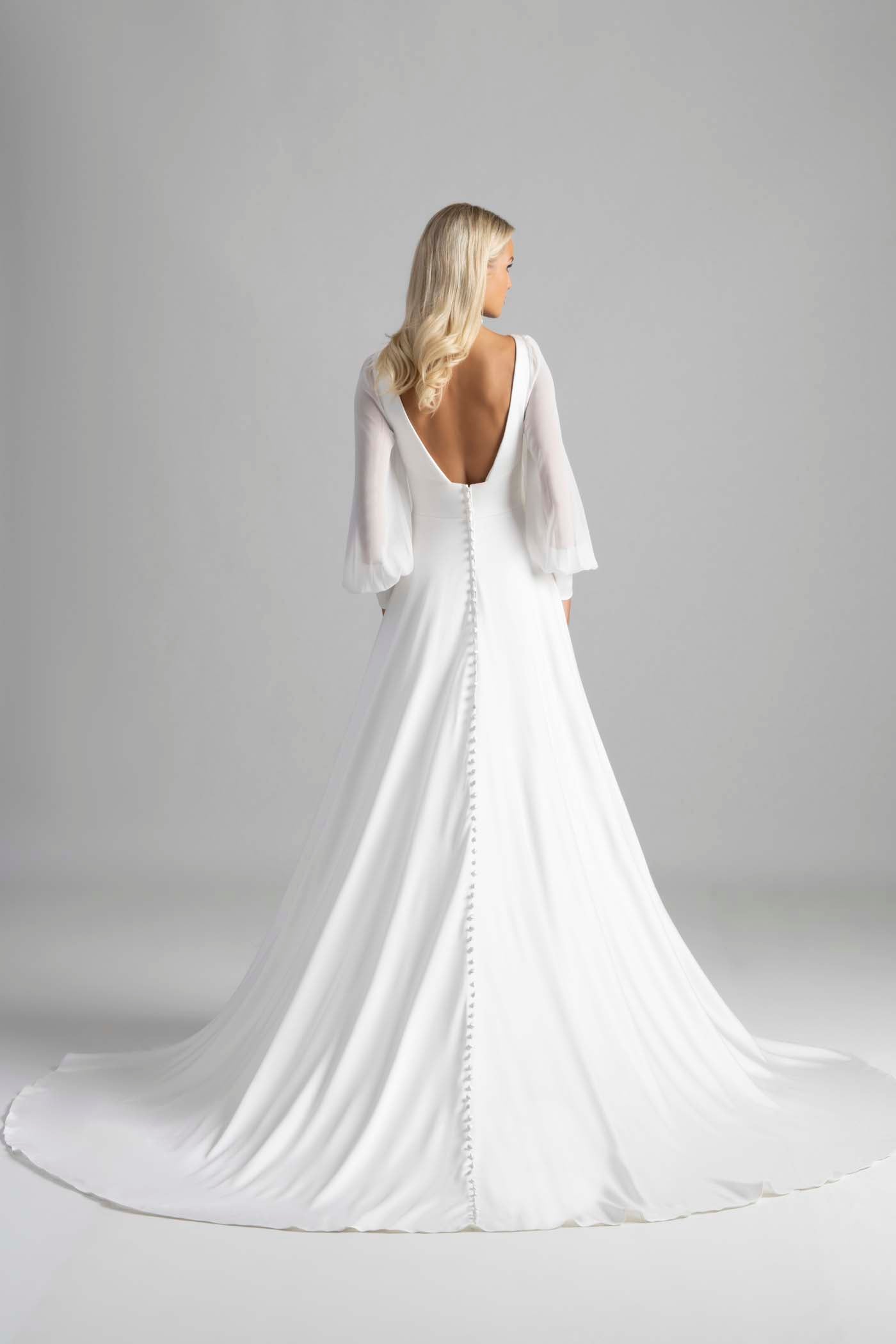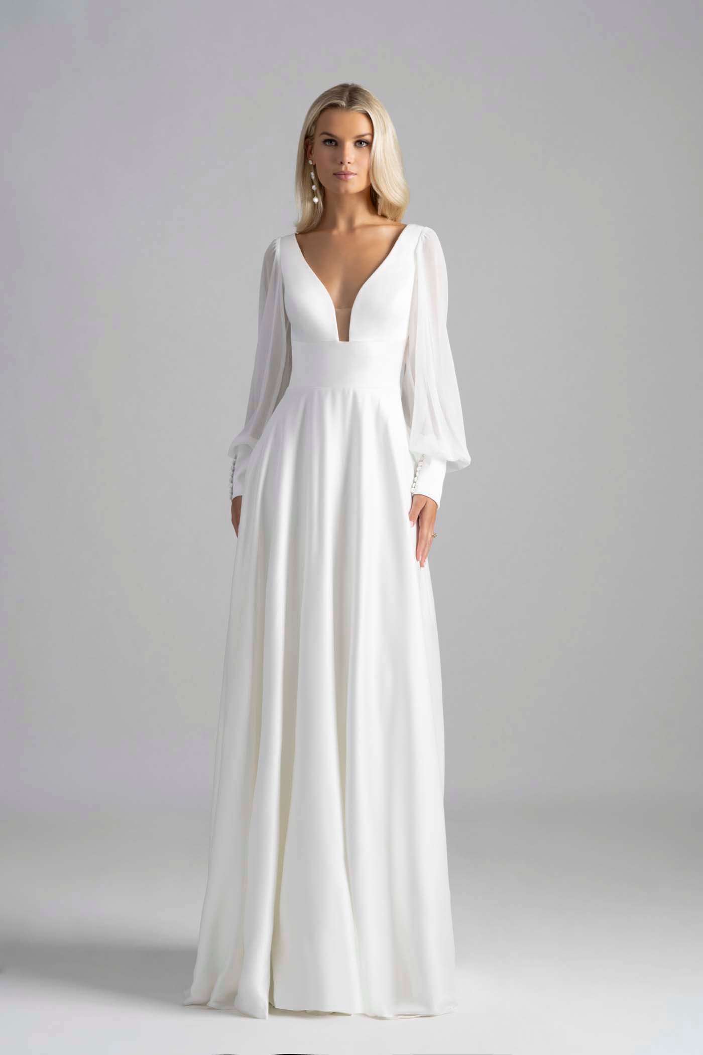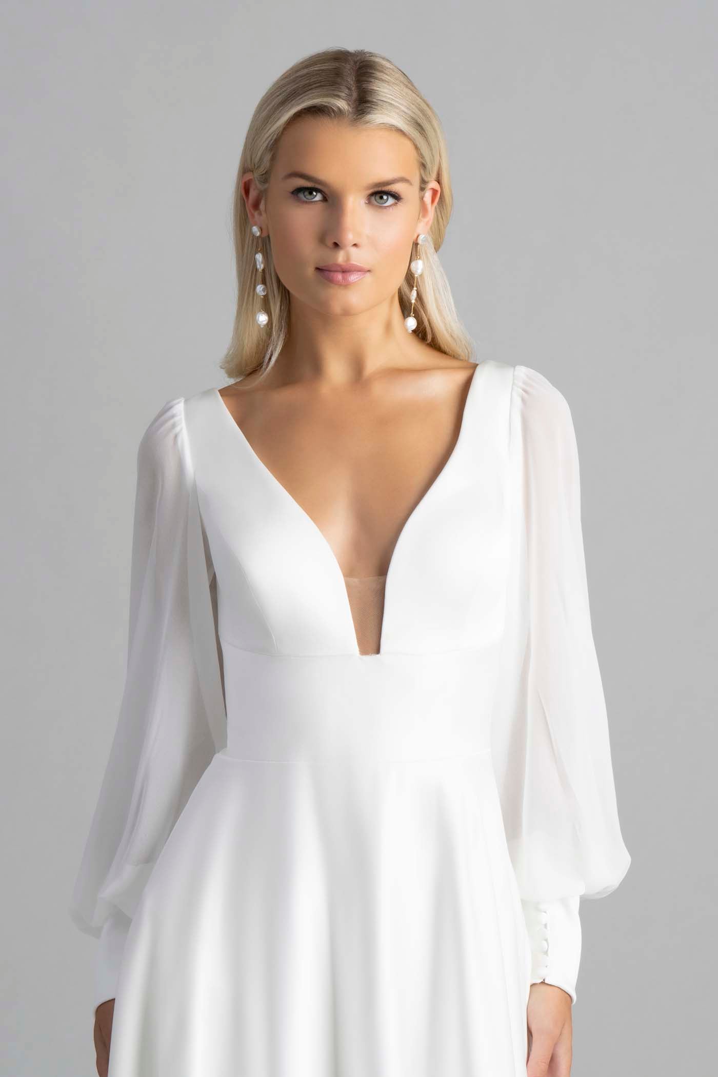 Una manga de obispo de gasa suaviza la discreta silueta en forma de A de satén de Francine.