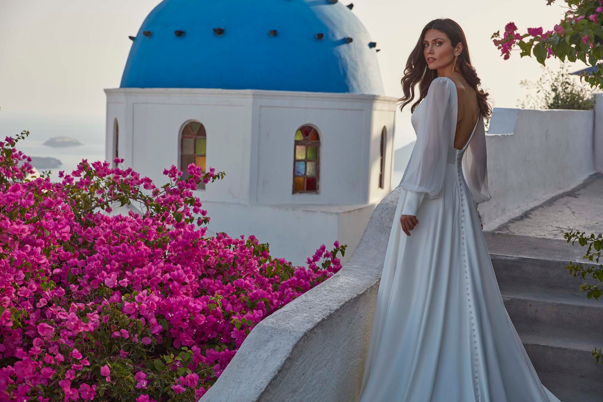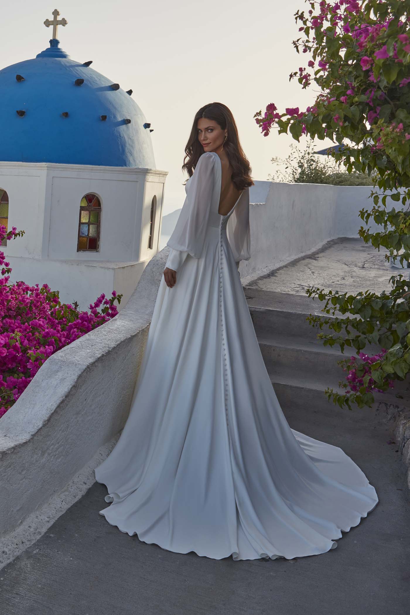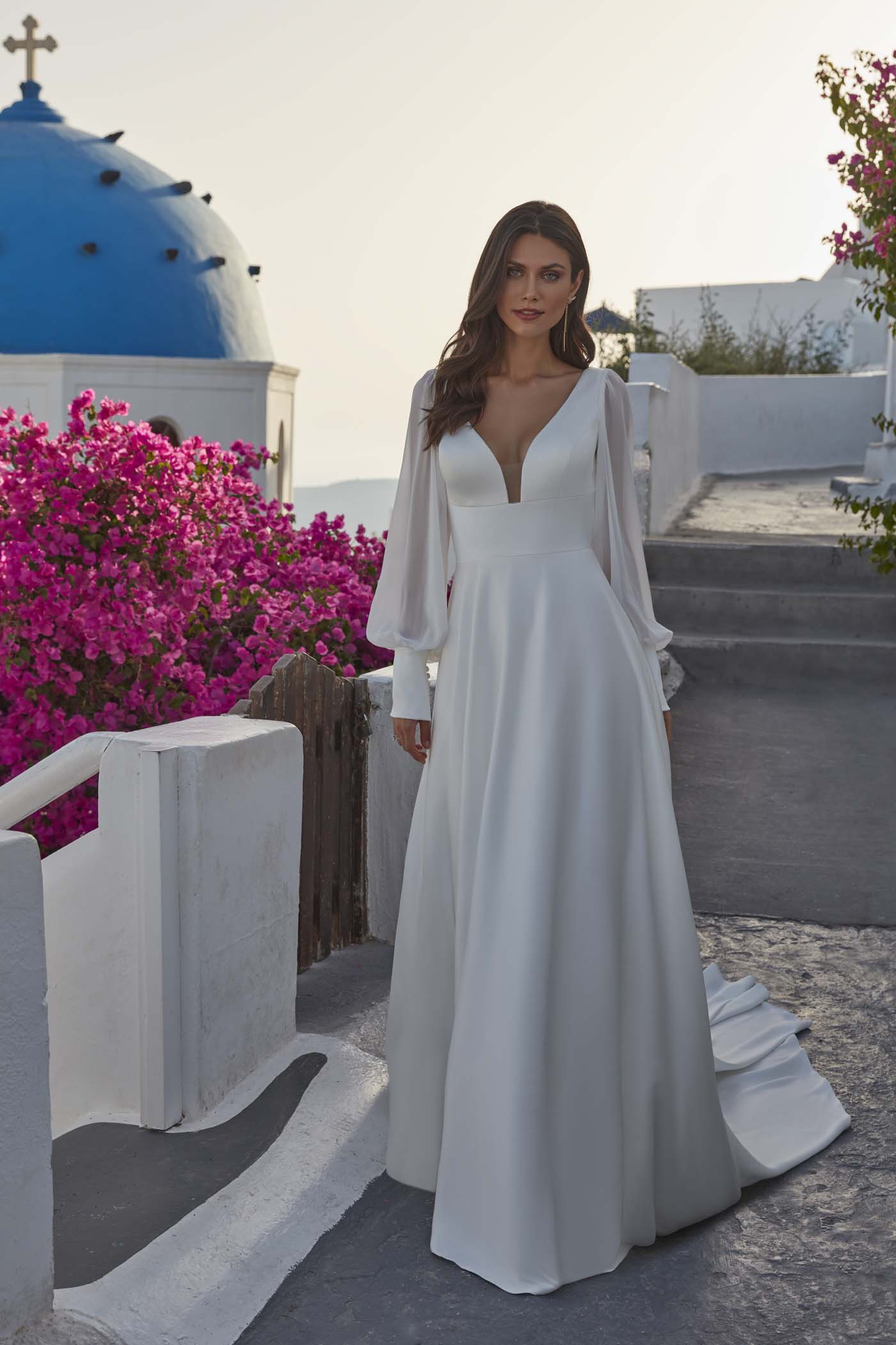 Una manga de obispo de gasa suaviza la discreta silueta en forma de A de satén de Francine.