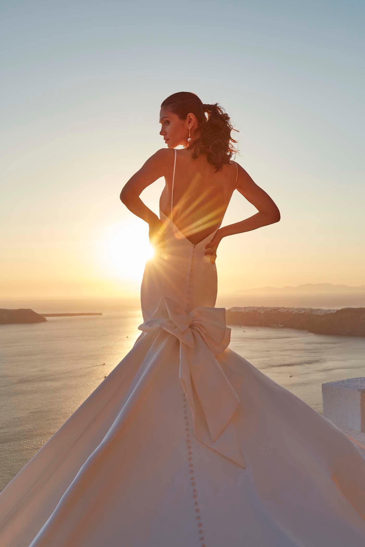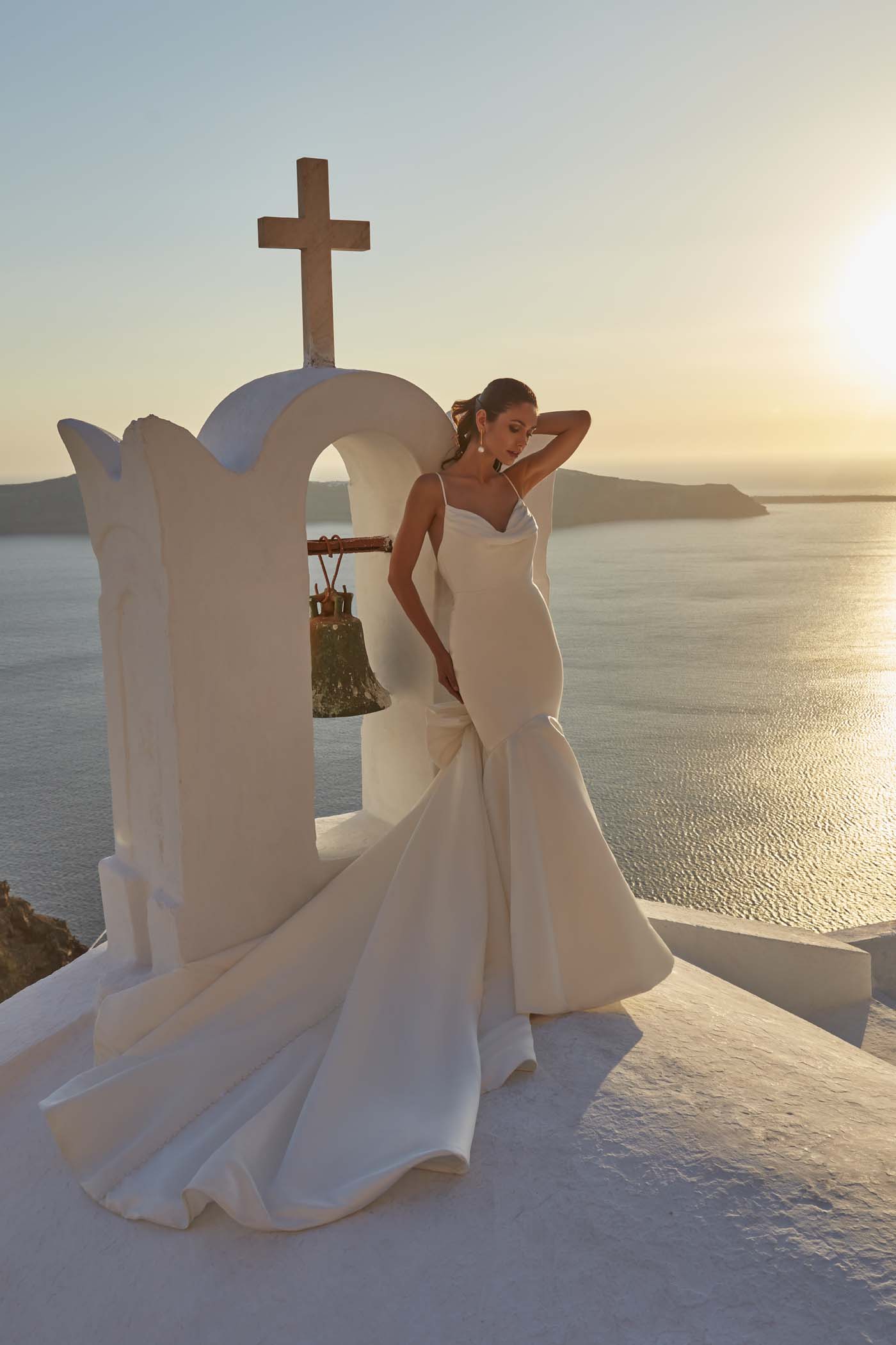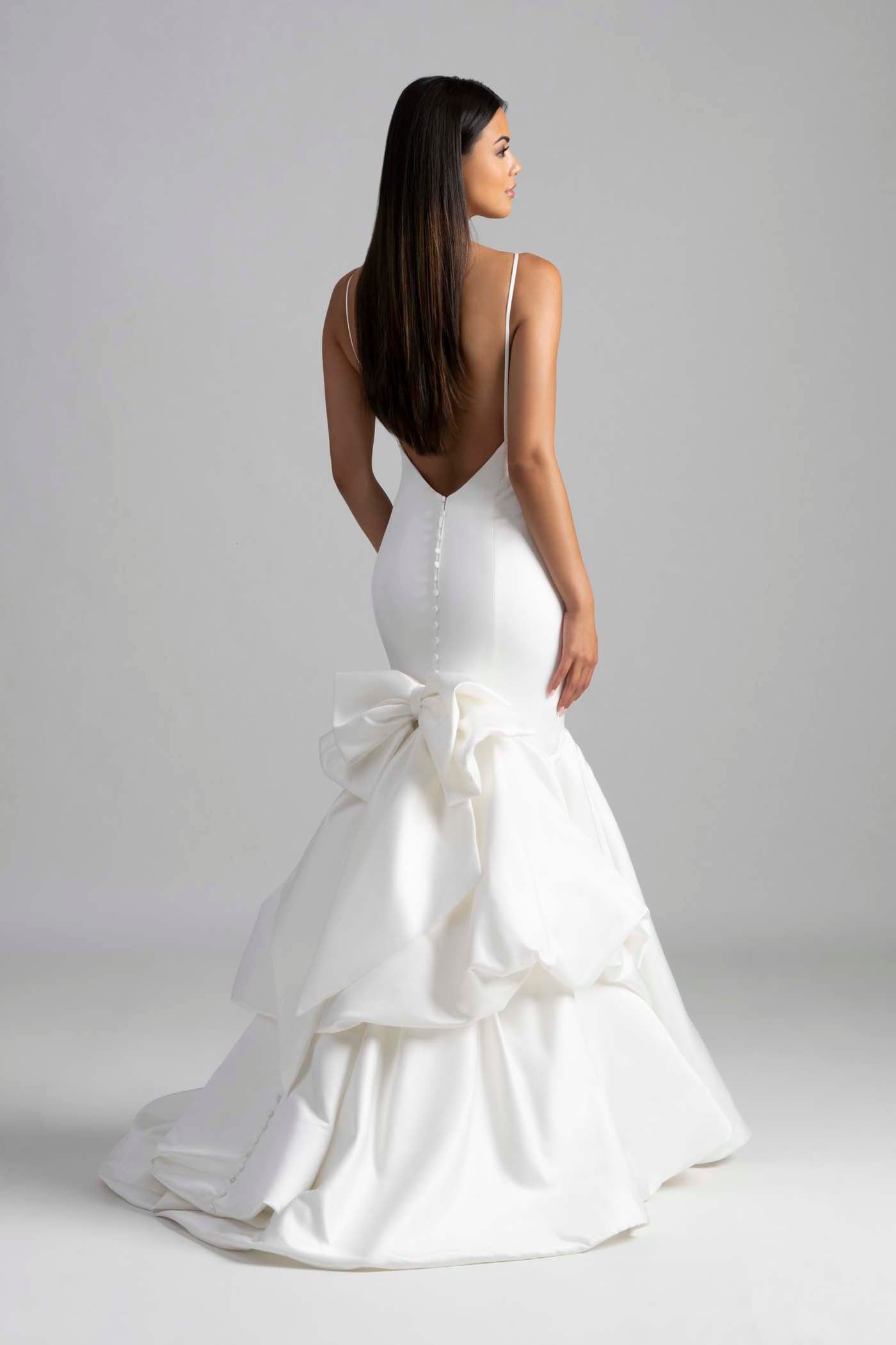 Un satén luminoso, cortado con una silueta entallada y con cuello vuelto, compone el vestido Felicity.