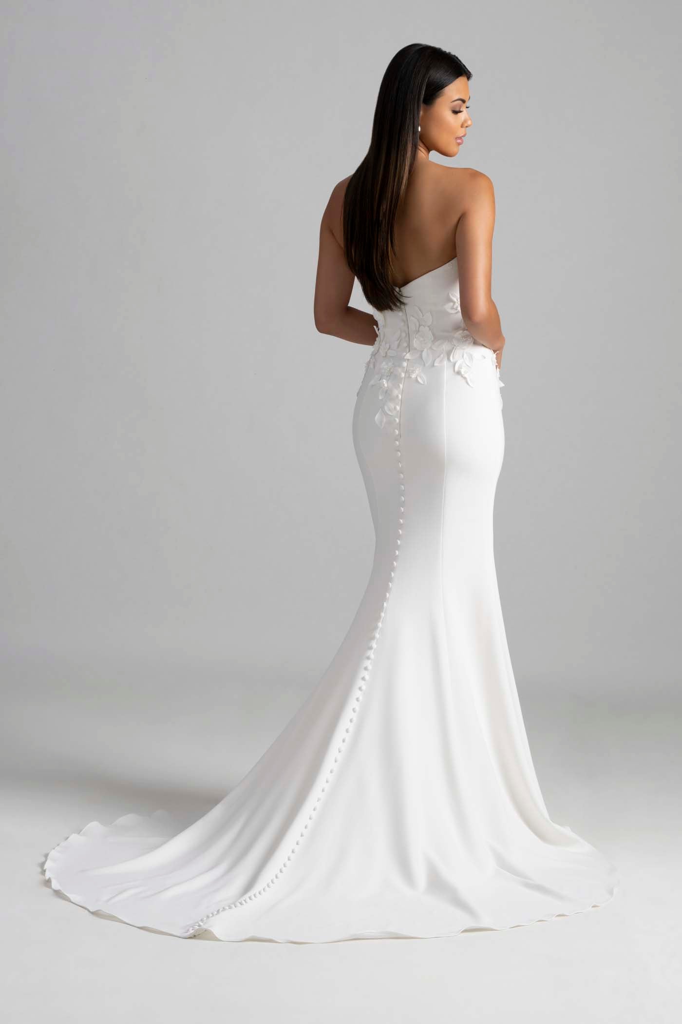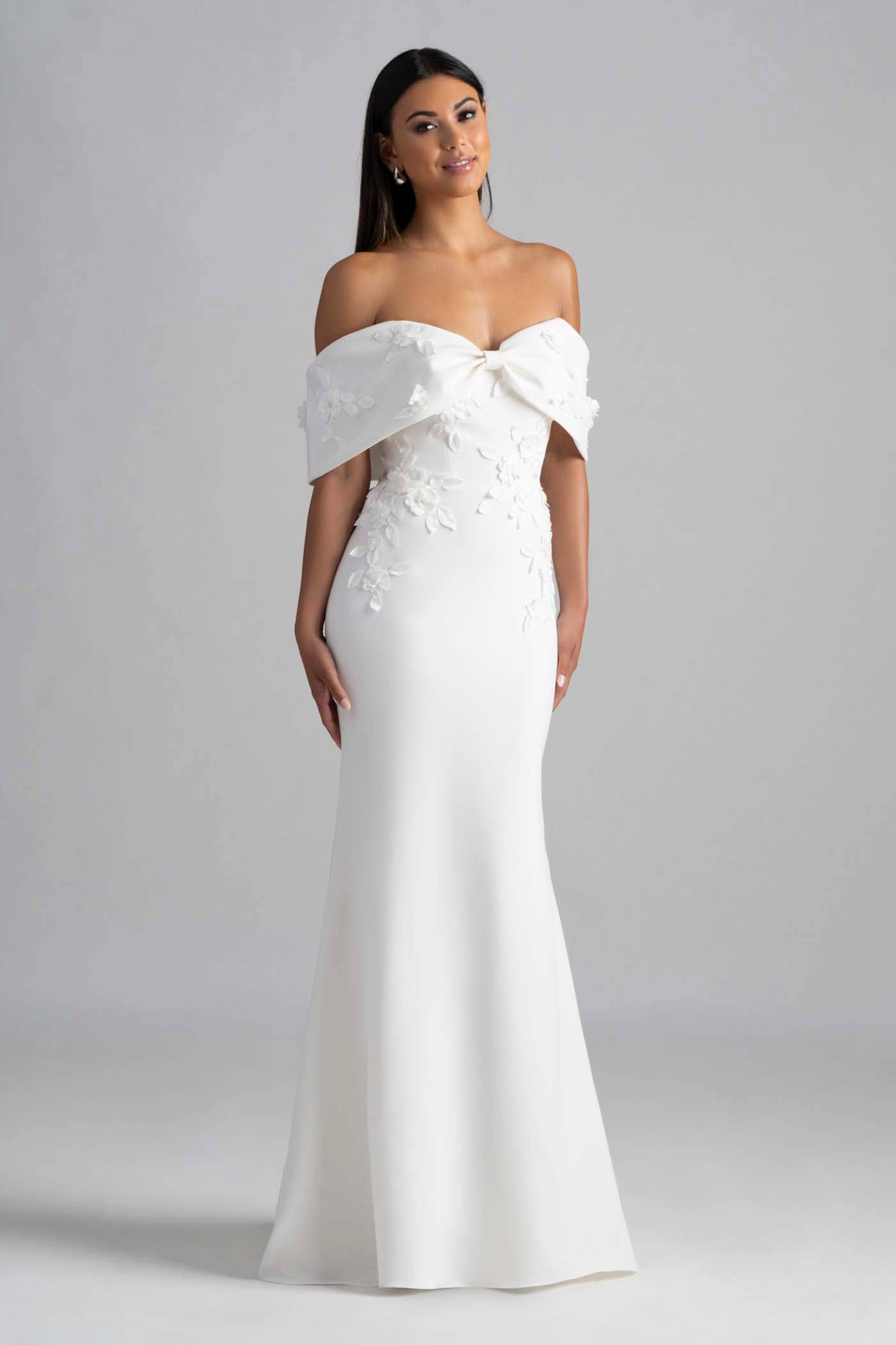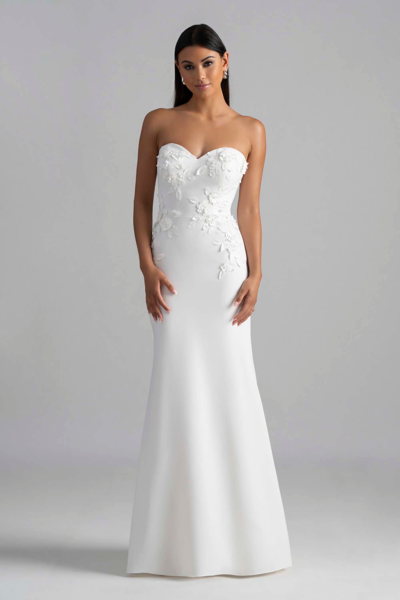 Un escote chal desmontable con hombros descubiertos aporta una elegancia recatada a Femi, un vestido tubo palabra de honor con apliques florales dimensionales. El chal se vende por separado (modelo MJ1117J).