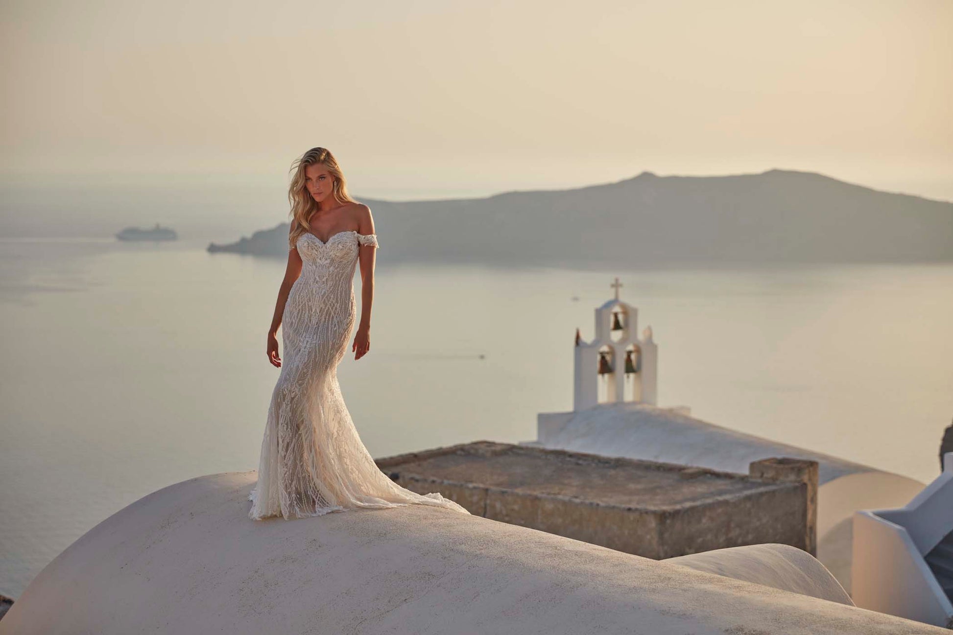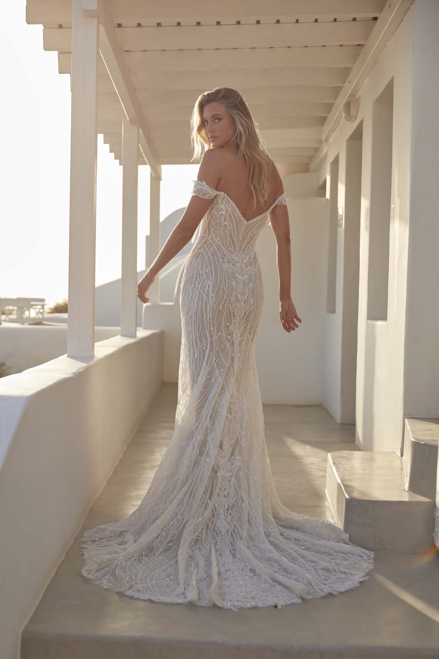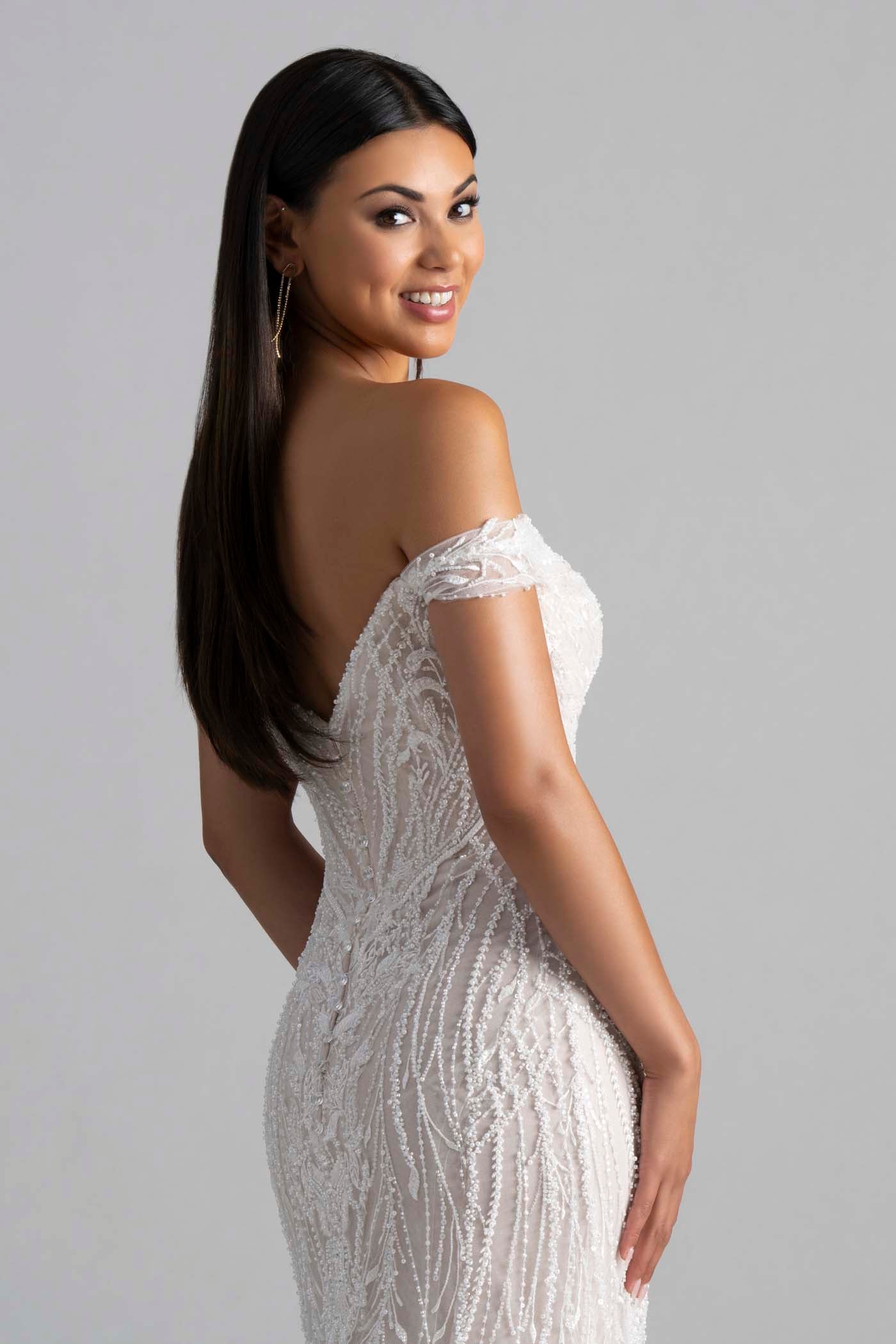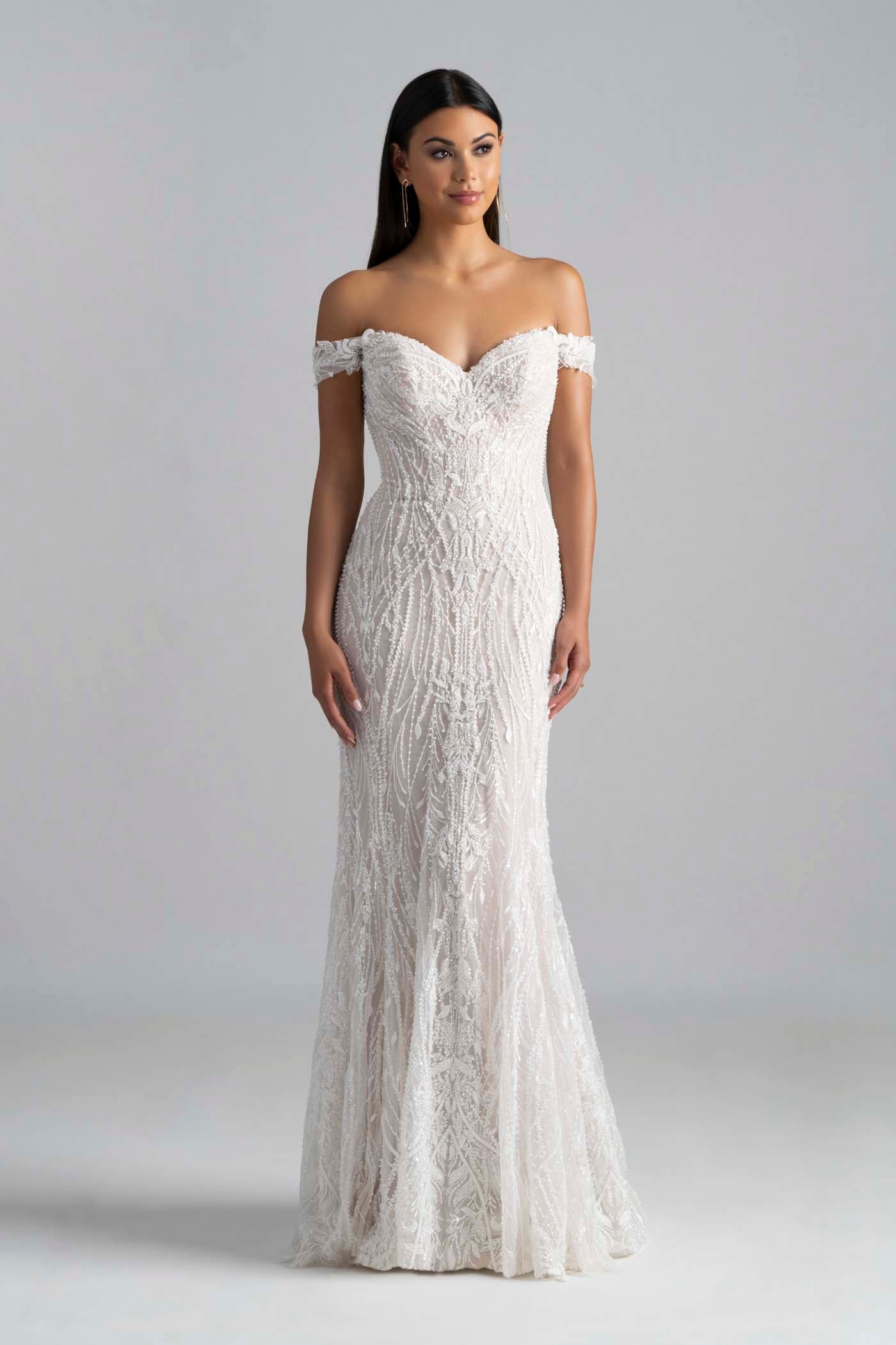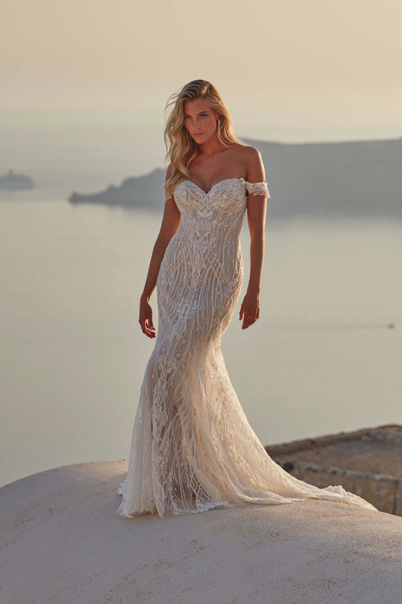 Presentamos Flavia: un opulento vestido tubo con hombros descubiertos adornado con apliques de encaje de cuentas, lentejuelas y perlas.
