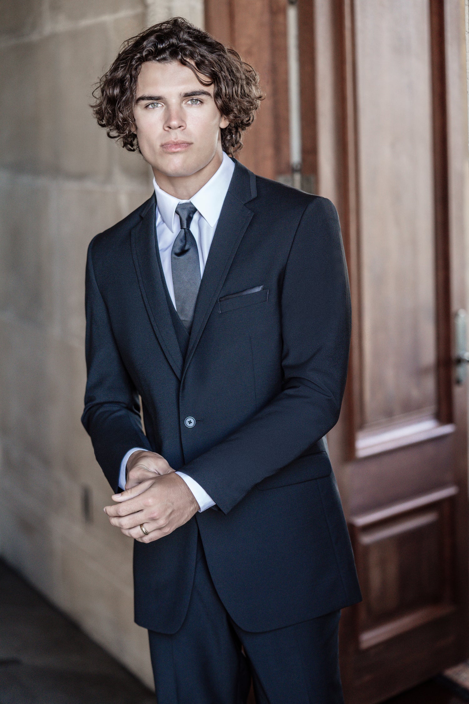 Atrevido, atemporal e innegablemente elegante, el traje negro ultra con solapa de muesca marca la pauta en bodas y trajes formales modernos. Su intenso tono negro y la clásica solapa de muesca crean una silueta refinada que nunca pasa de moda. Diseñado con un corte entallado para un look elegante y estilizado, es la opción ideal para novios, padrinos de boda o invitados de etiqueta. Este versátil traje combina a la perfección con cualquier combinación de camisa y corbata, lo que lo convierte en la prenda ideal tanto para celebraciones tradicionales como contemporáneas. Fabricado con tejido Coolmax® Performance Stretch. Read Less