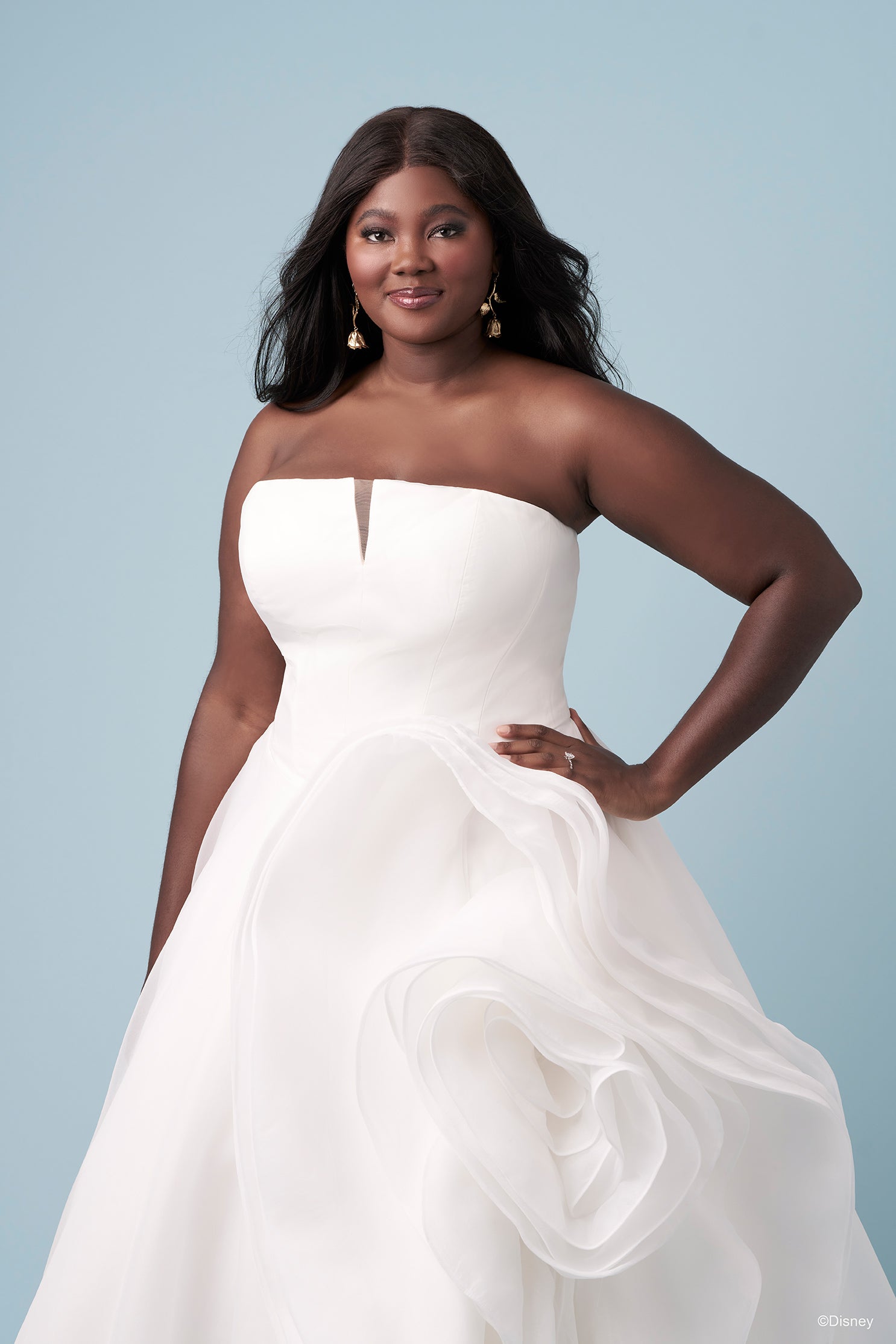 Radiating warmth and grace, this organza ballgown reflects Belle’s open heart and timeless beauty. The crescent neckline adds a soft, romantic touch, while the basque waist and corset back create a sculpted, regal silhouette. An abstract rose, artfully crafted from layers of organza, blooms across the skirt — a poetic symbol of love’s power to transform. Elegant and radiant, this gown embodies Belle’s spirit: seeing beauty in all things and letting her heart lead the way. Read Less