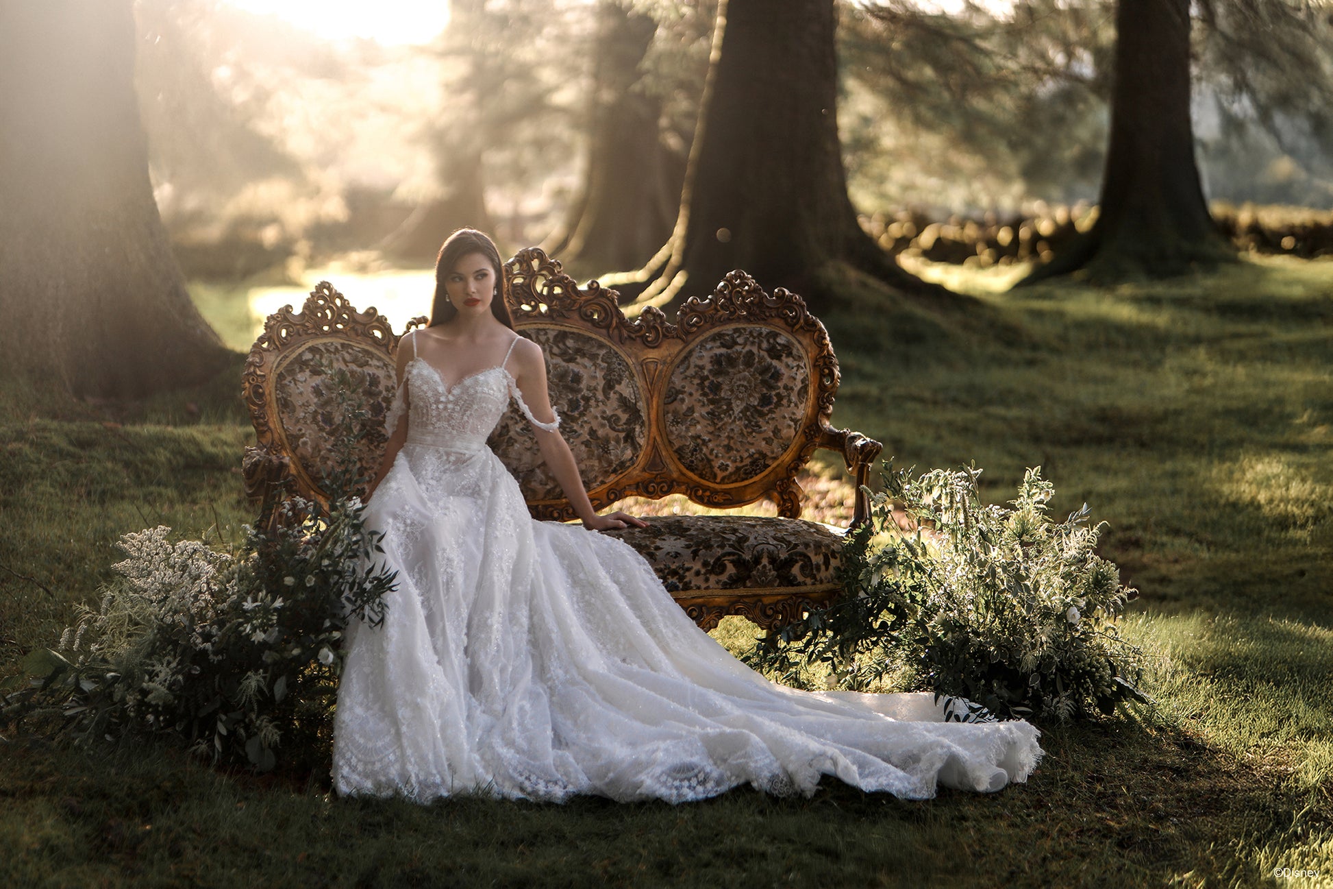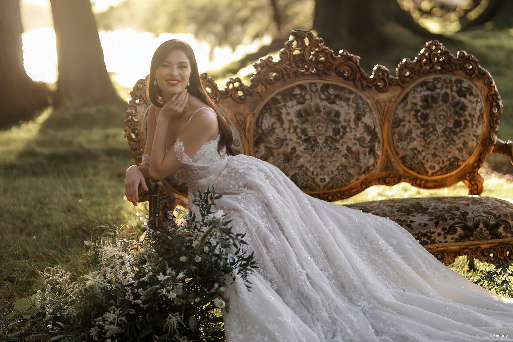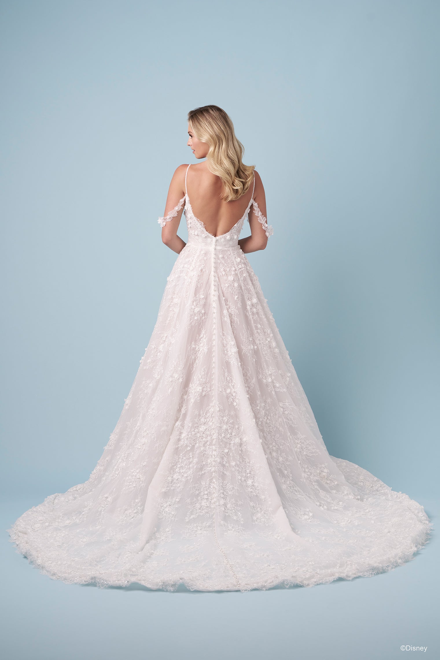 In a tale as timeless as love itself, this Snow White–inspired gown evokes the grace of the princess who started it all. Softly shimmering lace and delicate 3-D floral appliqués bloom across the A-line silhouette, capturing the sweetness of a love that endures. Gentle ruching at the waist creates a flattering, ethereal shape, while dainty beaded straps and draped off-the-shoulder sleeves lend a romantic, fairytale touch. With its tender elegance and whisper of enchantment, this gown feels like a dream come true — a vision of “happily ever after” brought to life. Read Less