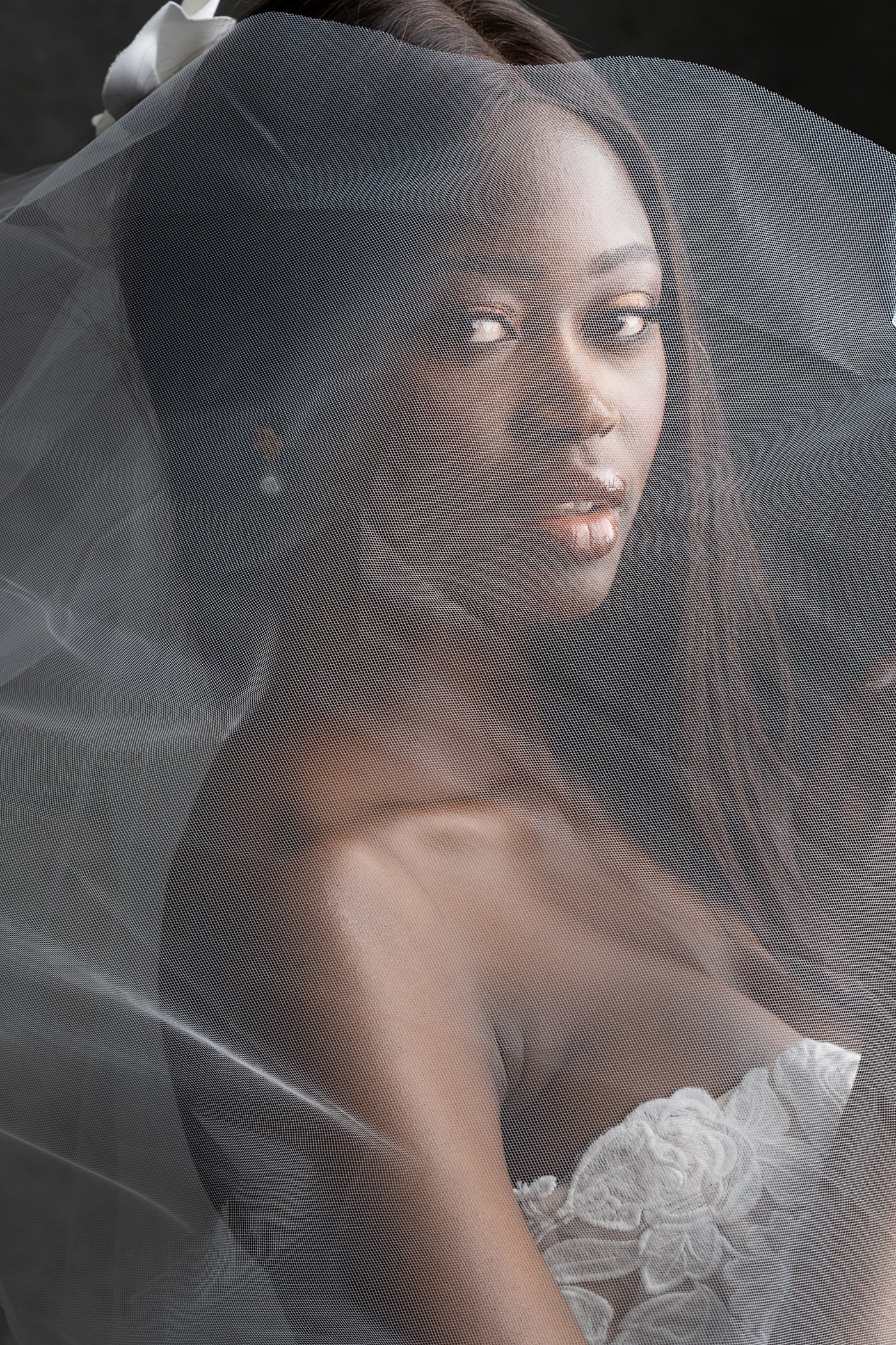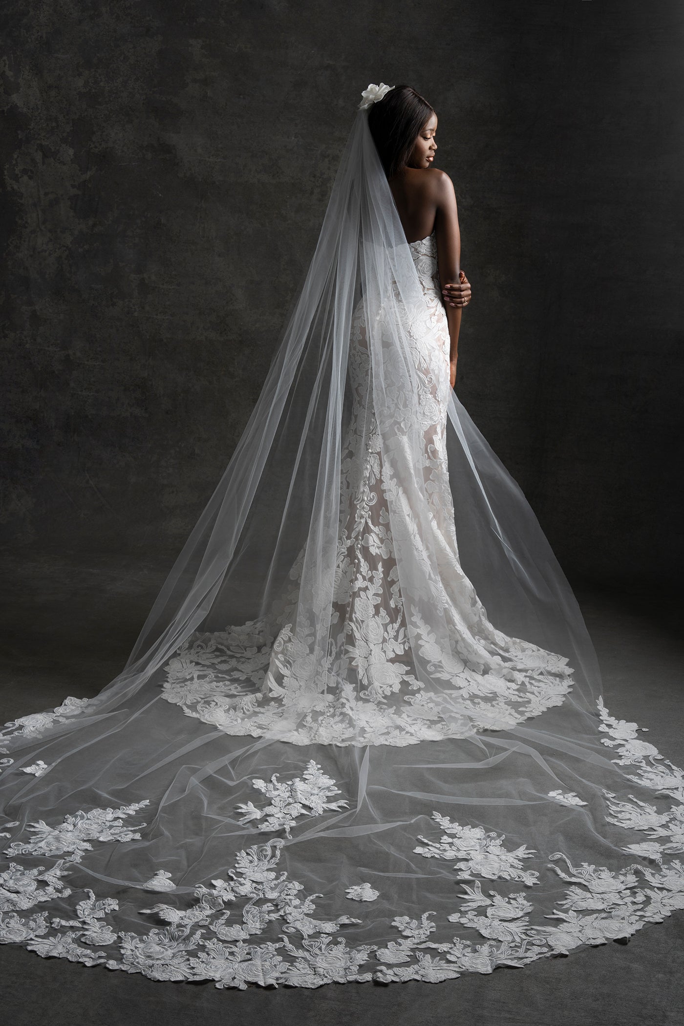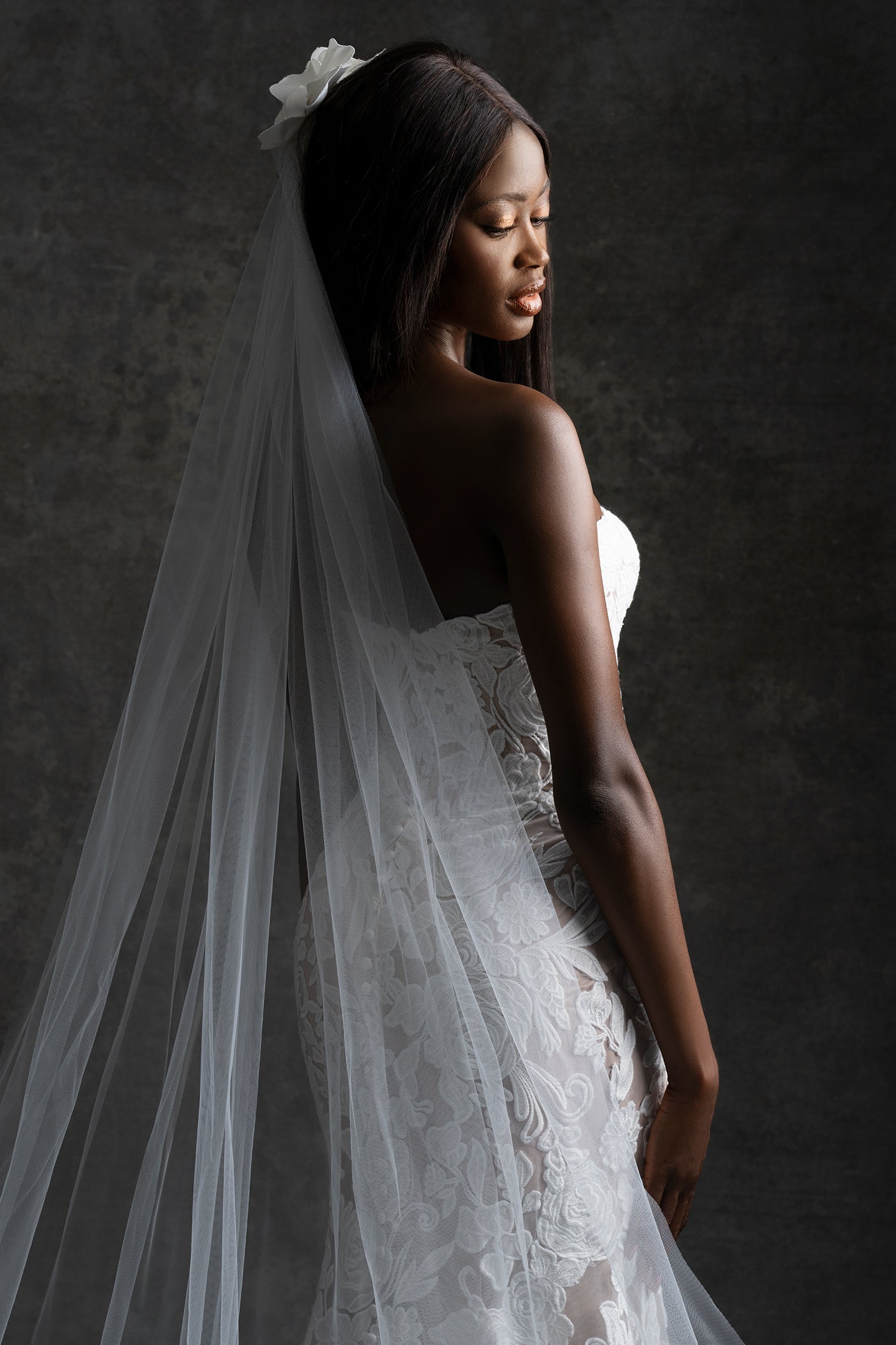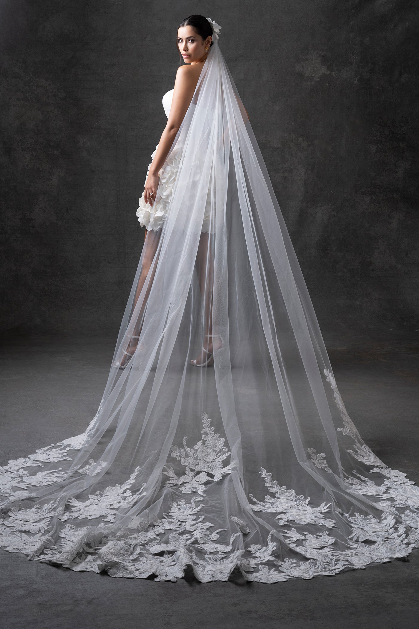 Ce voile est orné d'applications de dentelle florale agrandies et exagérées, pour une touche à la fois audacieuse et romantique. Conçu pour compléter le modèle C753, il s'accorde également à merveille avec de nombreuses robes pour une allure de mariée remarquable.