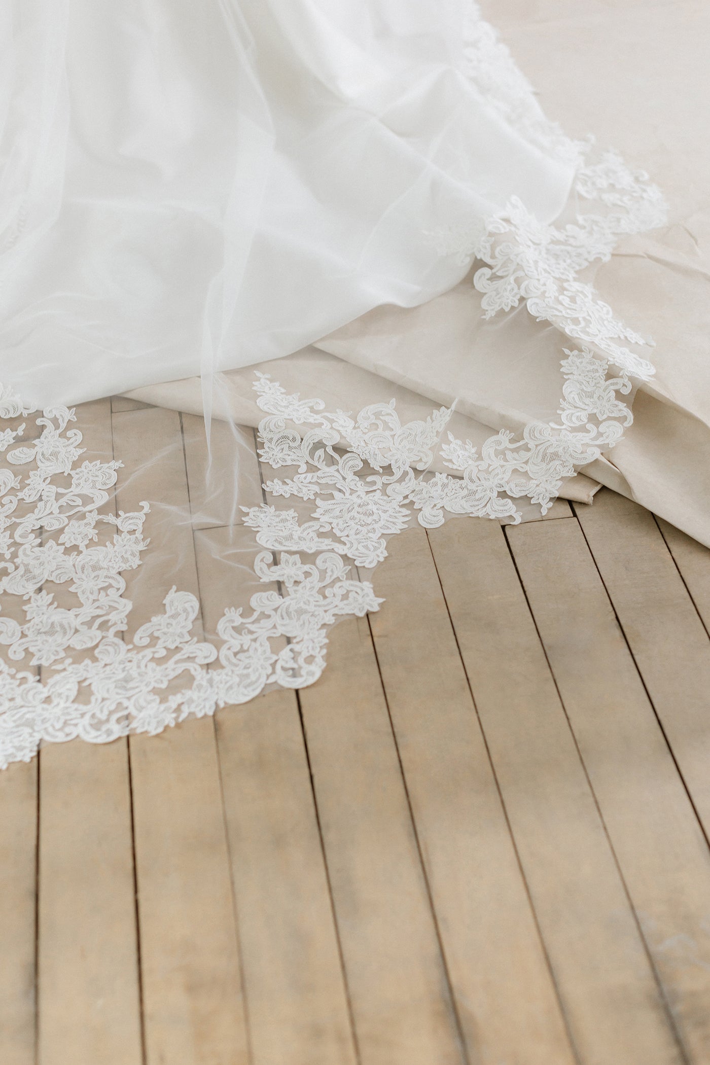 Ce voile cathédrale est confectionné en tulle doux et orné d'appliques en dentelle d'inspiration vénitienne, rappelant l'élégance raffinée des modèles Abella E575, E576 et E577. La riche dentelle ajoute profondeur et romantisme, créant un effet spectaculaire et cohérent qui sublime l'ensemble de la tenue de mariée. Read Less