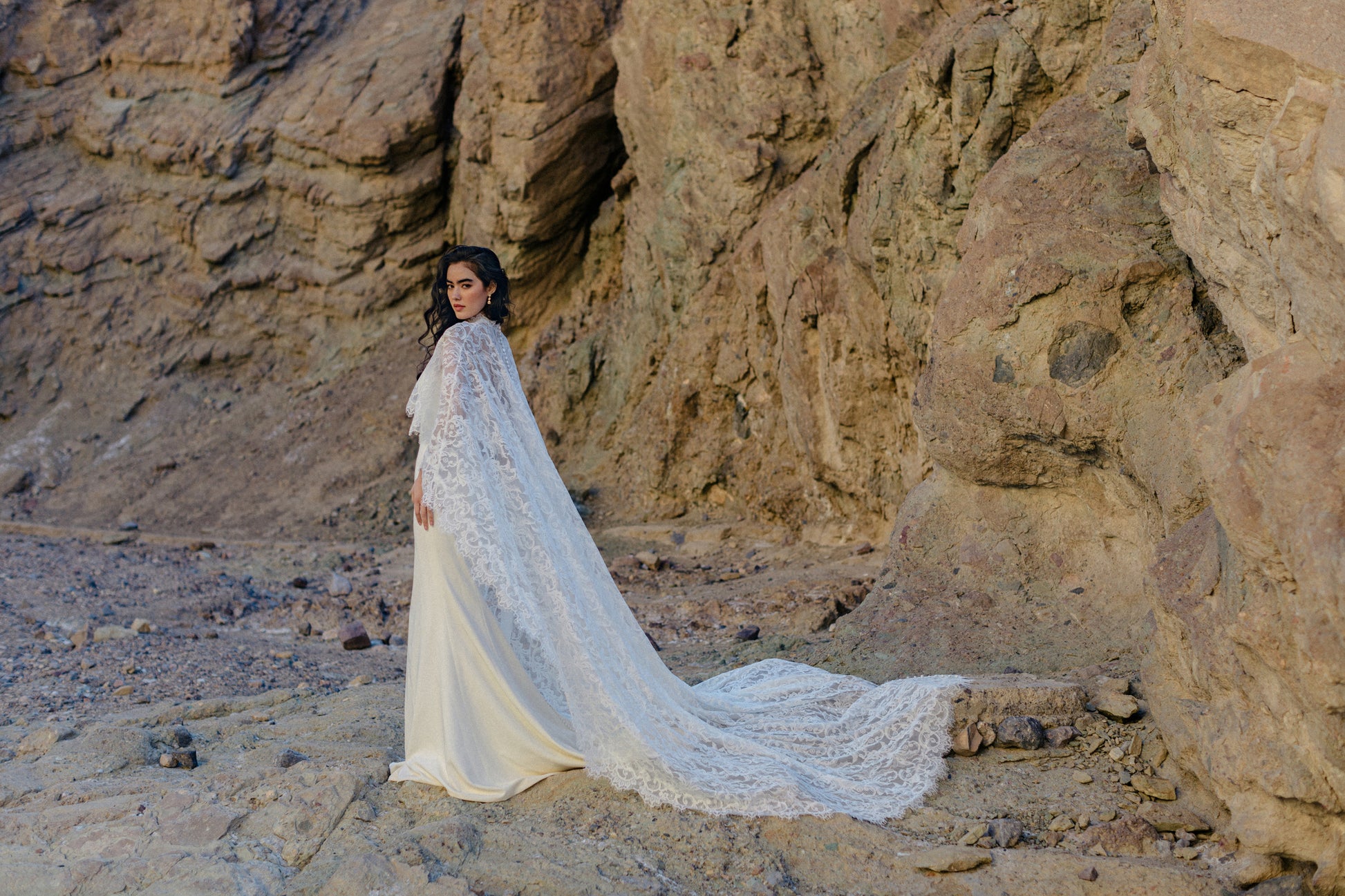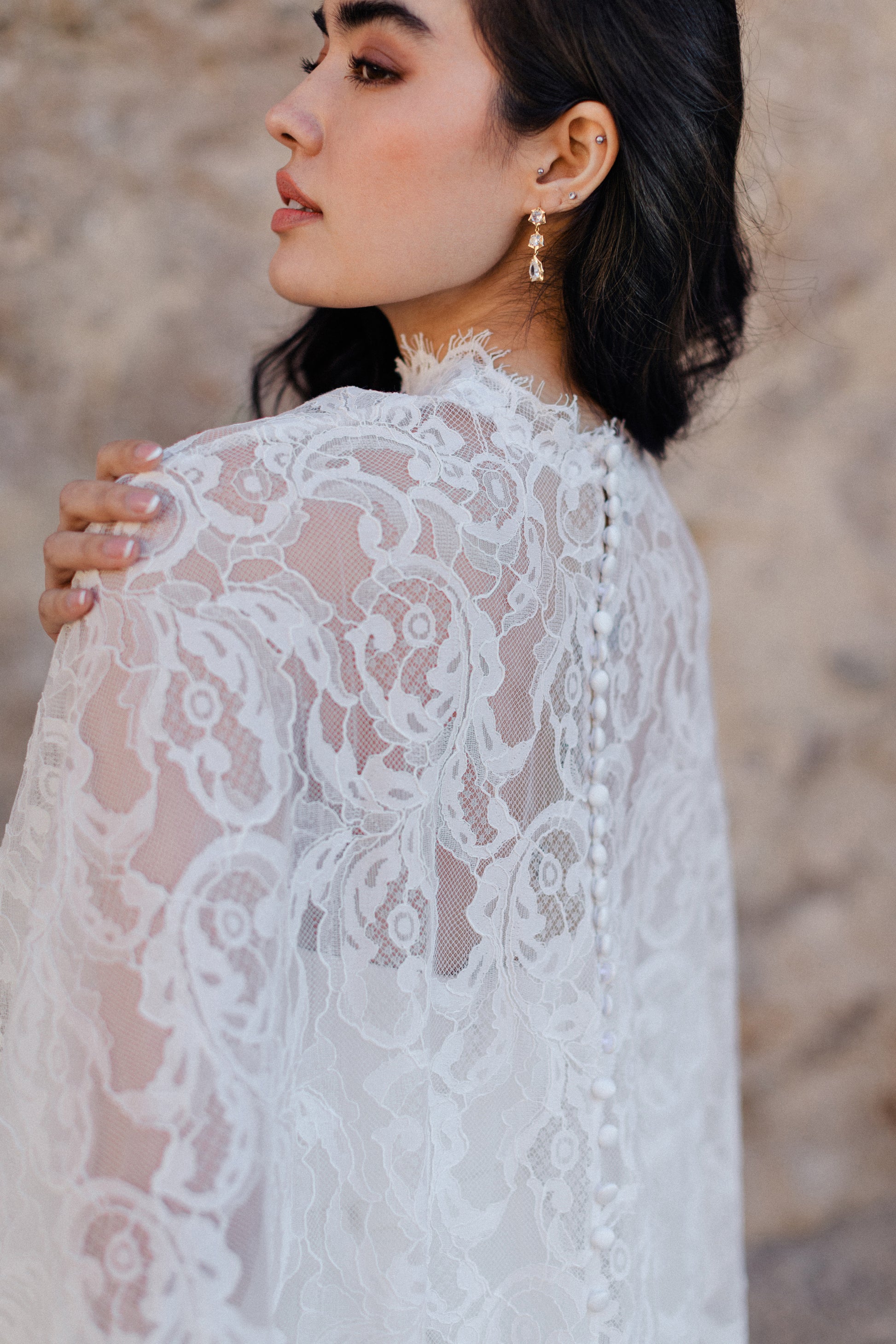 Conçue pour sublimer la simplicité de la robe Cléopâtre, cette cape à col montant est confectionnée en dentelle drapée pour une touche de romantisme intense. Son ourlet festonné ajoute texture et mouvement, ce qui en fait la pièce idéale à superposer pour une mariée qui souhaite se démarquer. Retirez-la ensuite pour une cérémonie élégante. Read Less