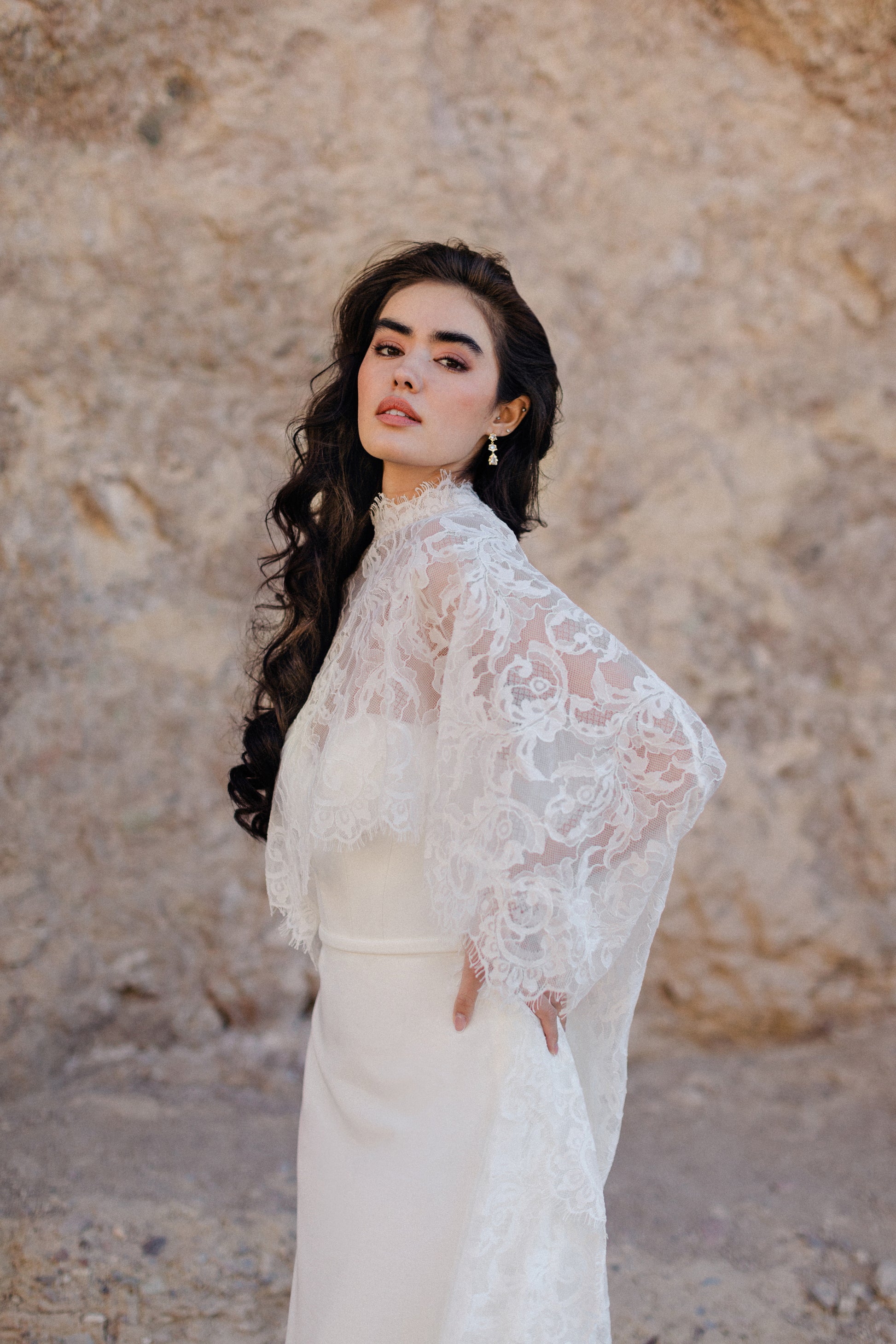 Conçue pour sublimer la simplicité de la robe Cléopâtre, cette cape à col montant est confectionnée en dentelle drapée pour une touche de romantisme intense. Son ourlet festonné ajoute texture et mouvement, ce qui en fait la pièce idéale à superposer pour une mariée qui souhaite se dém... Read More