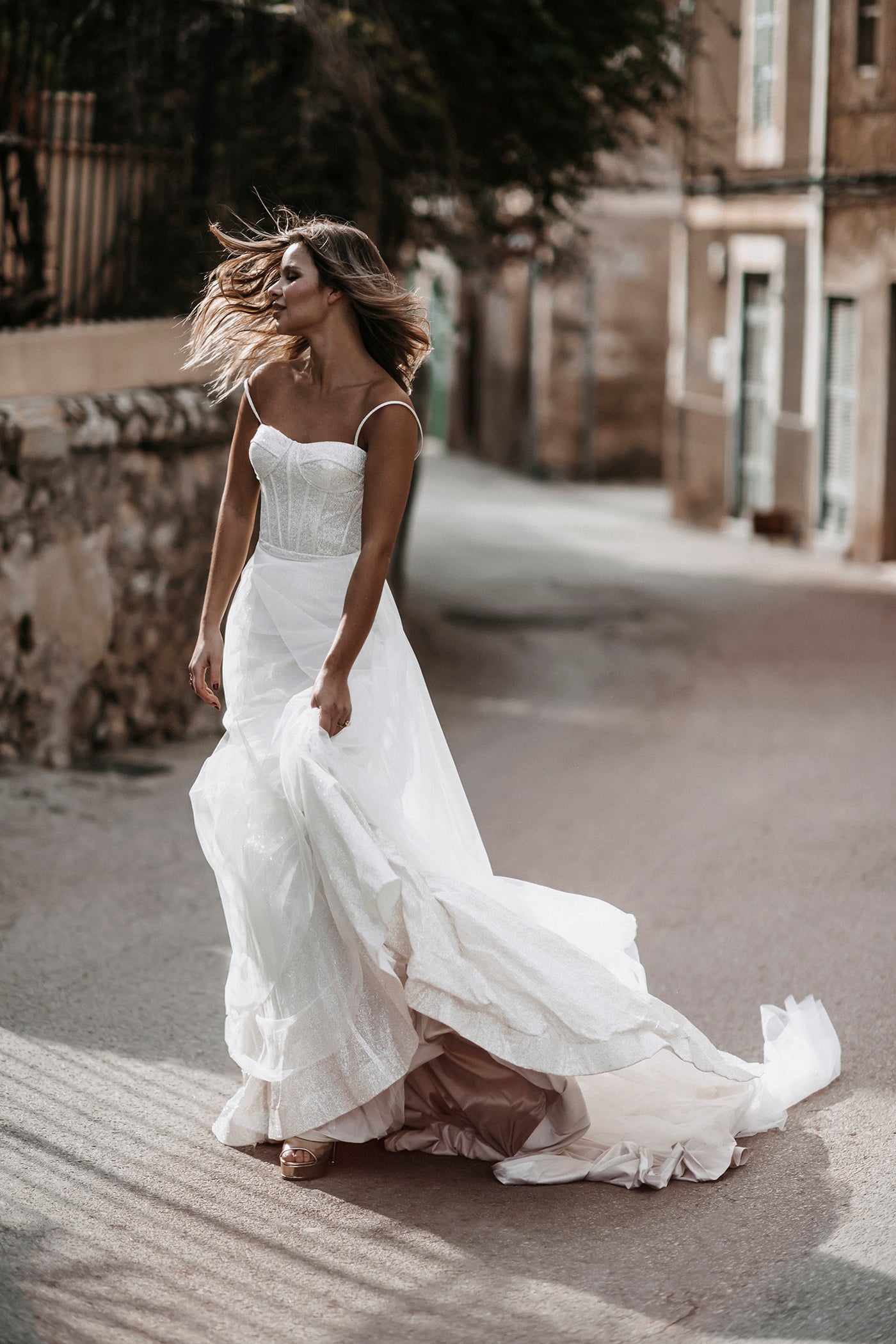 Conçue pour faire tourner les têtes, Karina est entièrement confectionnée en tulle scintillant, avec des baleines apparentes chics le long du corsage. Une surjupe amovible adoucit les paillettes et les rend chatoyantes.