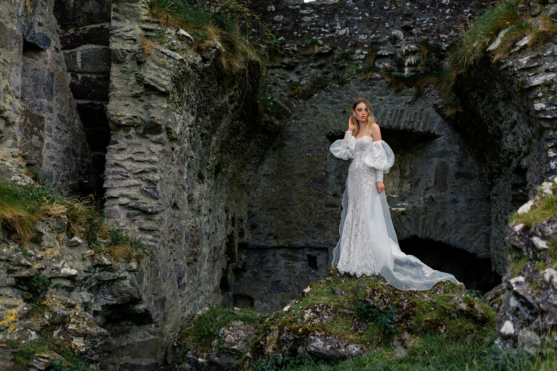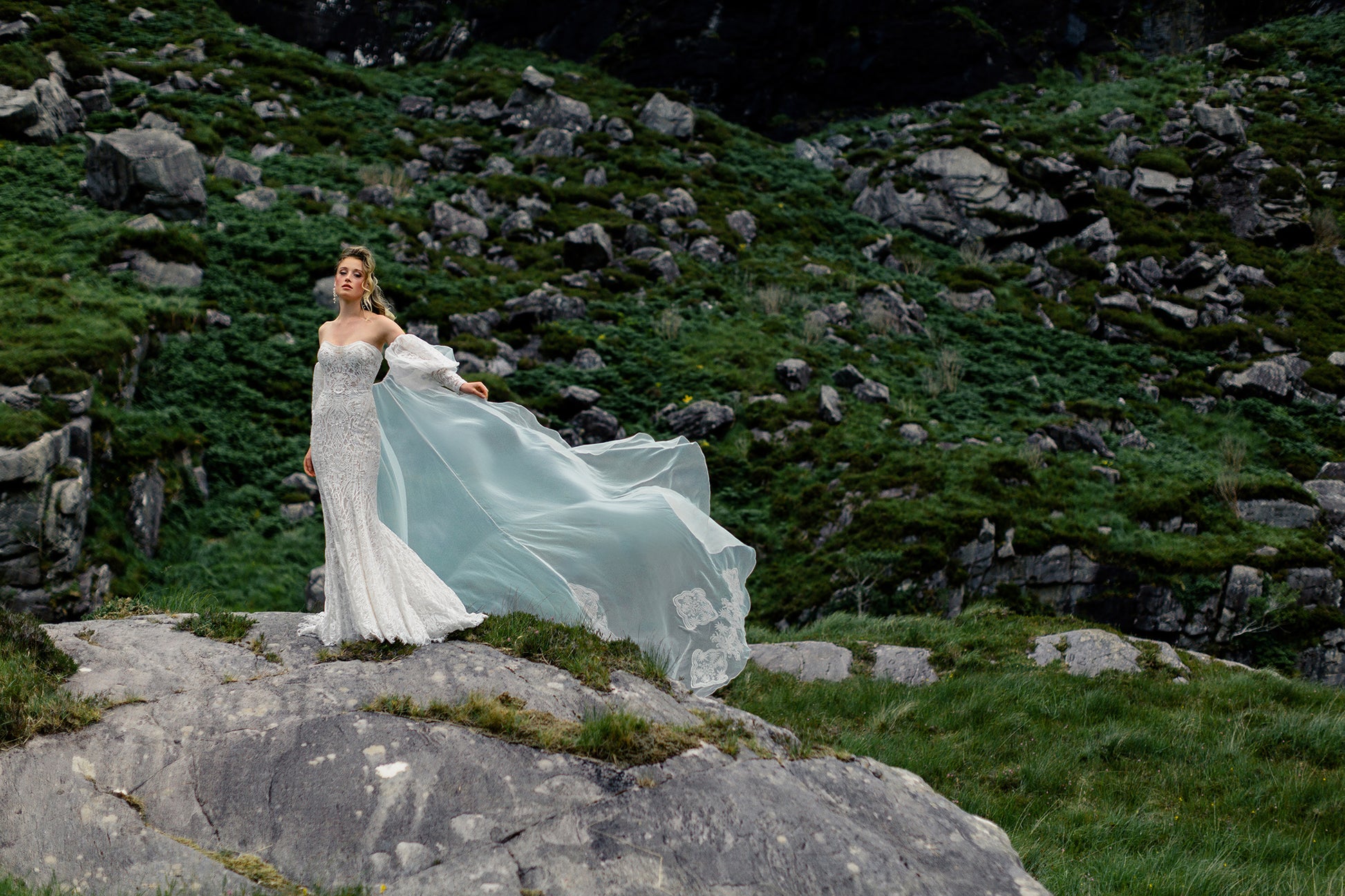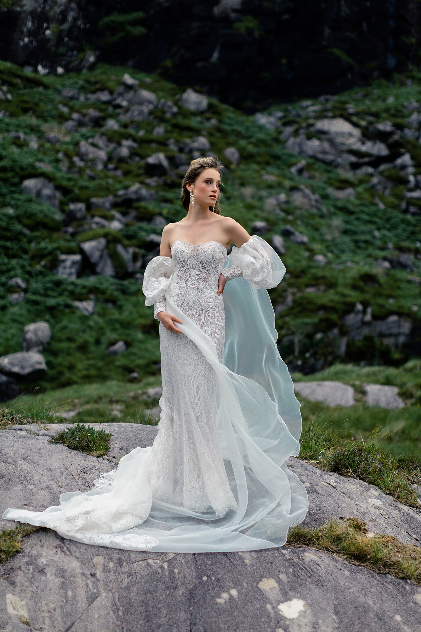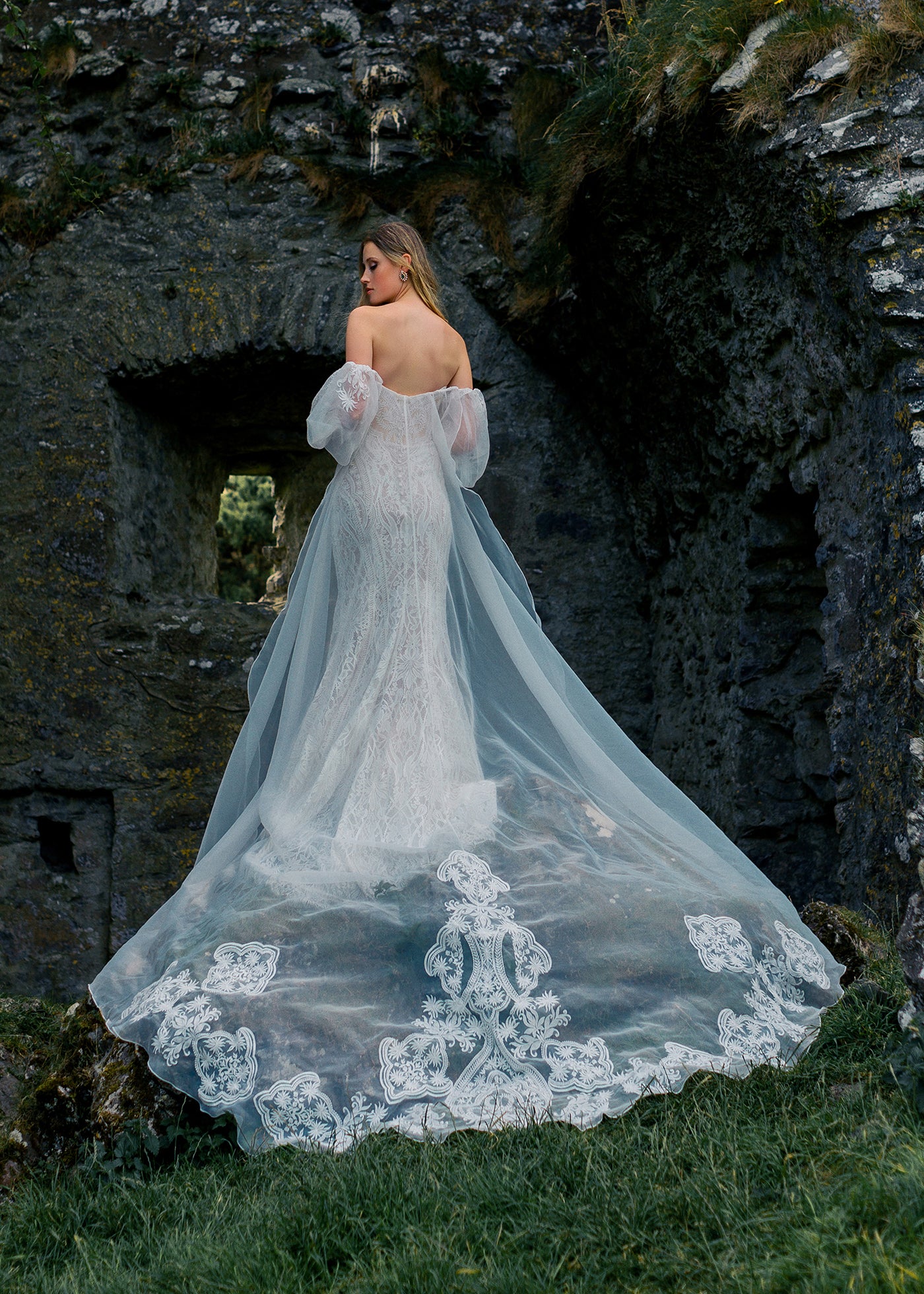 Pour une touche de drame supplémentaire, la traîne amovible de Reba présente des manches bouffantes d'inspiration vintage et des applications de dentelle surdimensionnées.