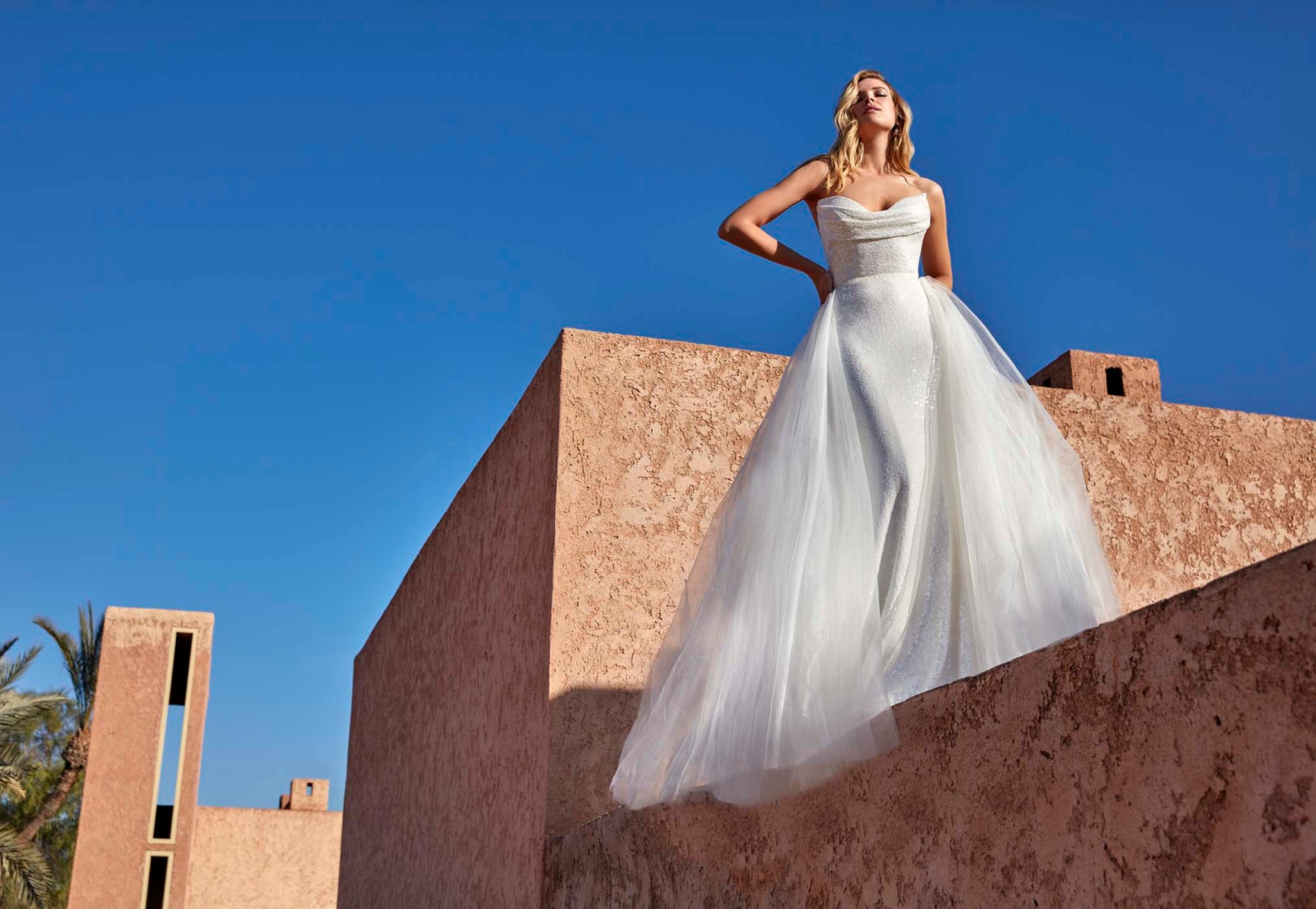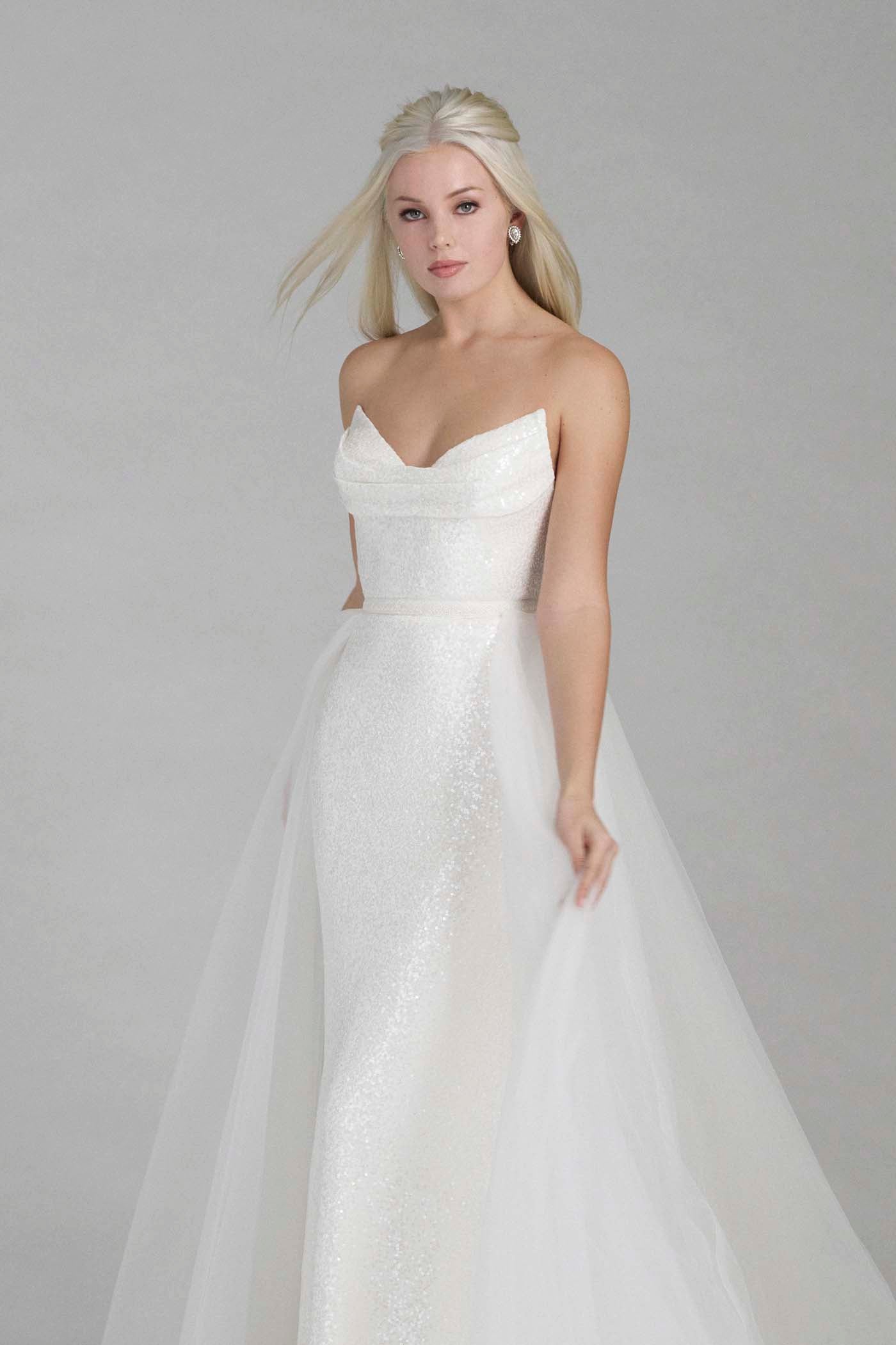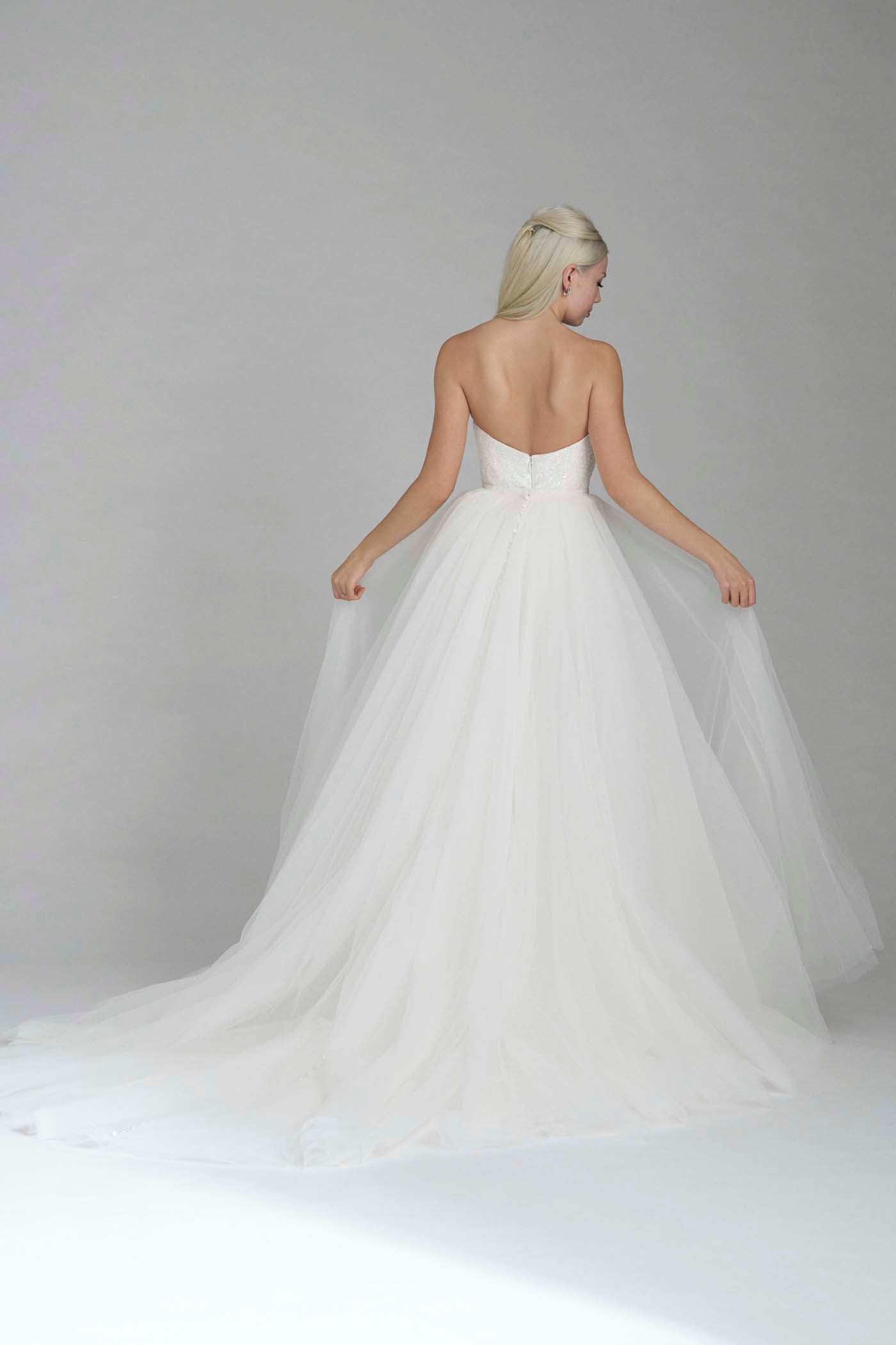 Conçue pour s'harmoniser avec la silhouette épurée de la robe Esme, cette jupe amovible en tulle apporte douceur et volume. La superposition de tulle vaporeux contraste magnifiquement avec la finition ultra-brillante de la robe, créant un effet romantique et aérien. Une façon simple d'ajouter du volume et du mouvement, pour un look polyvalent qui passe en douceur de la cérémonie à la réception. Read Less