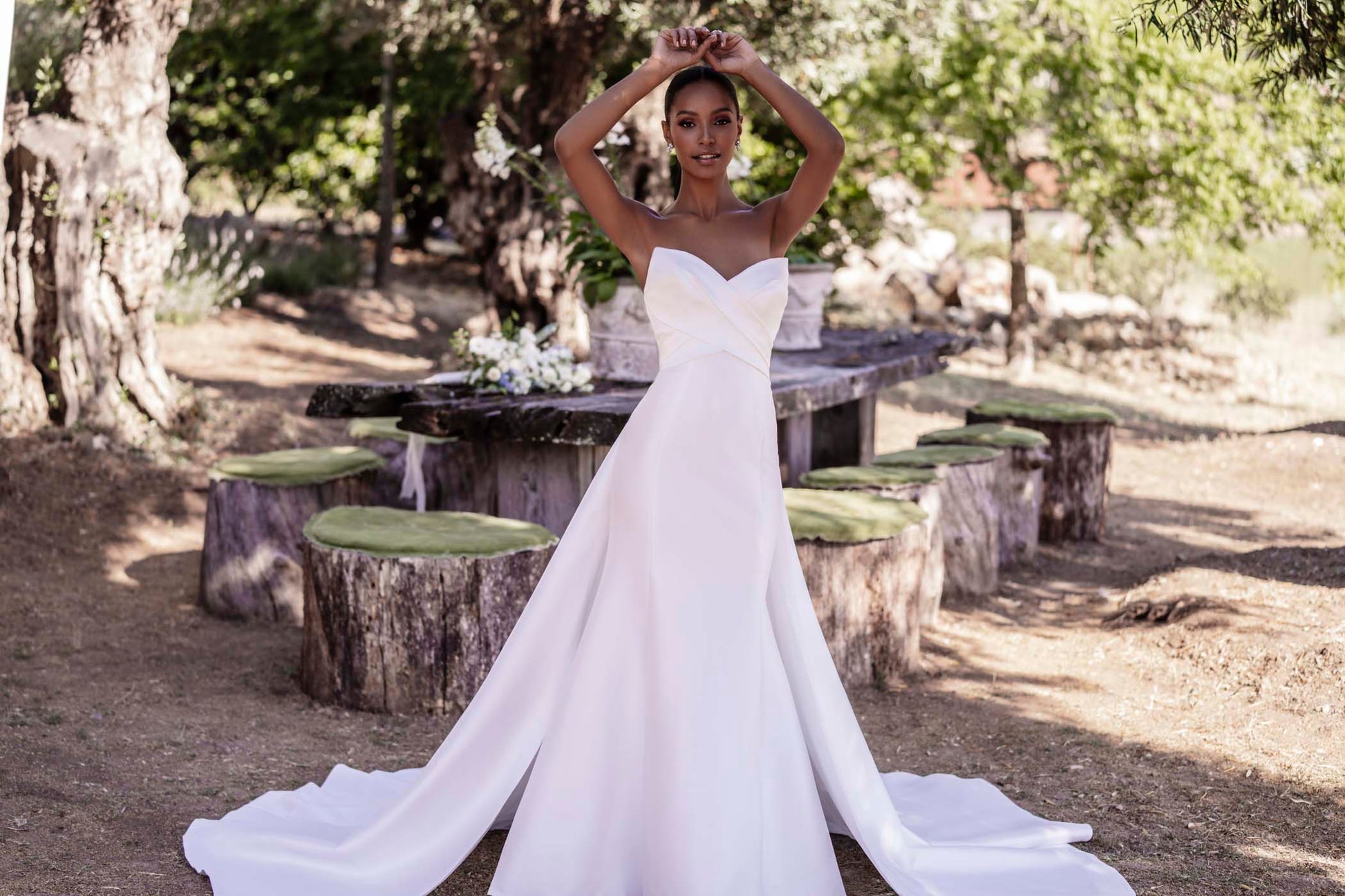 L'éclat nacré de notre traîne amovible en Mikado extensible est le complément parfait à tout look de mariée minimaliste.