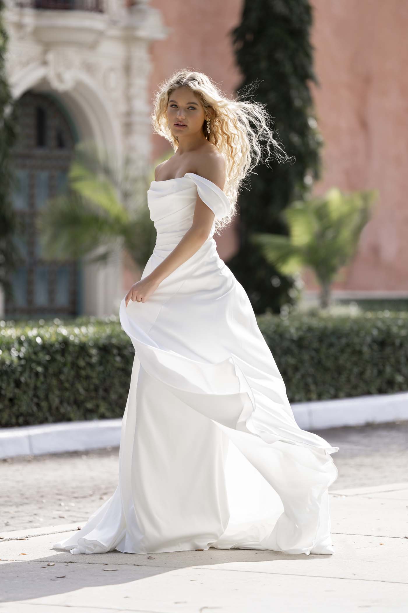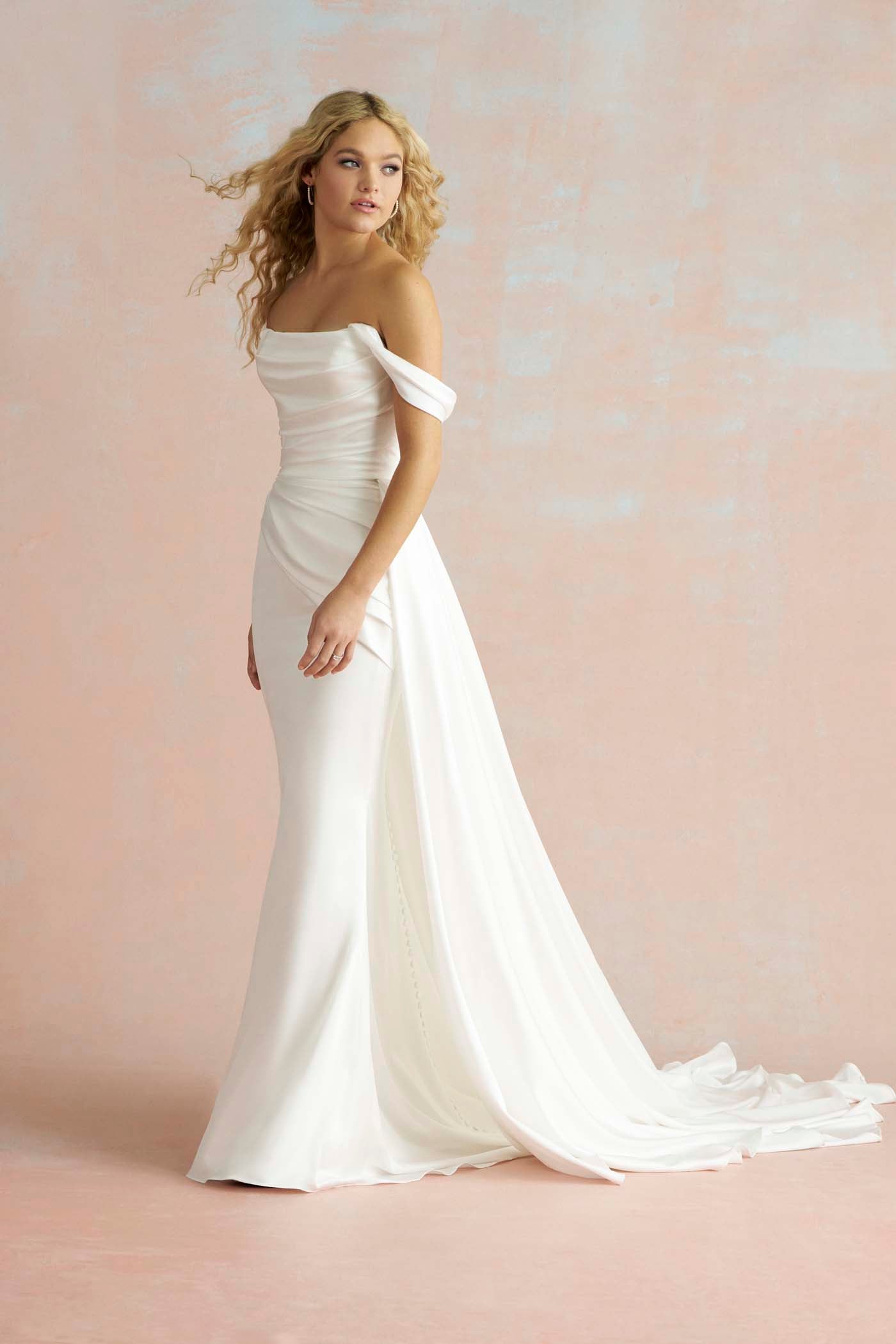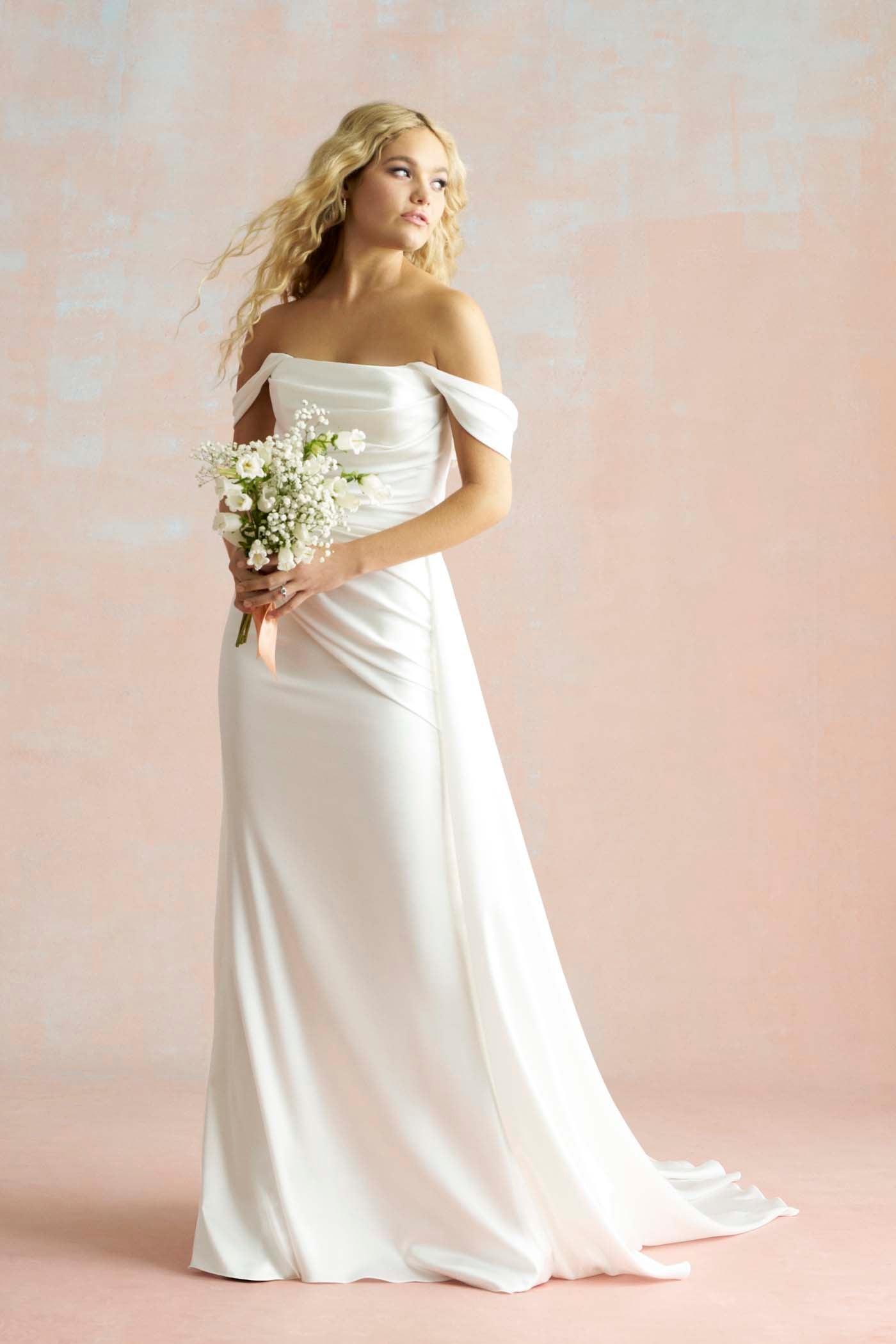 Conçue pour s'associer au modèle R3856, cette traîne amovible en satin extensible transforme la silhouette fourreau élégante en une coupe trapèze plus ample. Drapée sans couture à partir de la taille, elle apporte volume et douceur sans surcharger la robe : parfaite pour faire une entrée remarquée et changer de look pour la cérémonie. Read Less