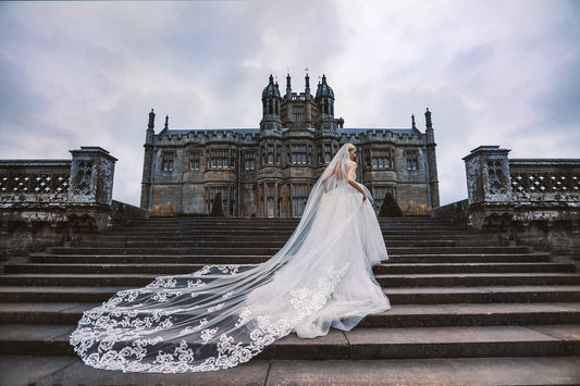 La traîne amovible Cendrillon Platinum, composée d'un magnifique tulle scintillant à paillettes dispersées avec des applications de dentelle perlée inspirées d'un carrosse, transforme véritablement le look.